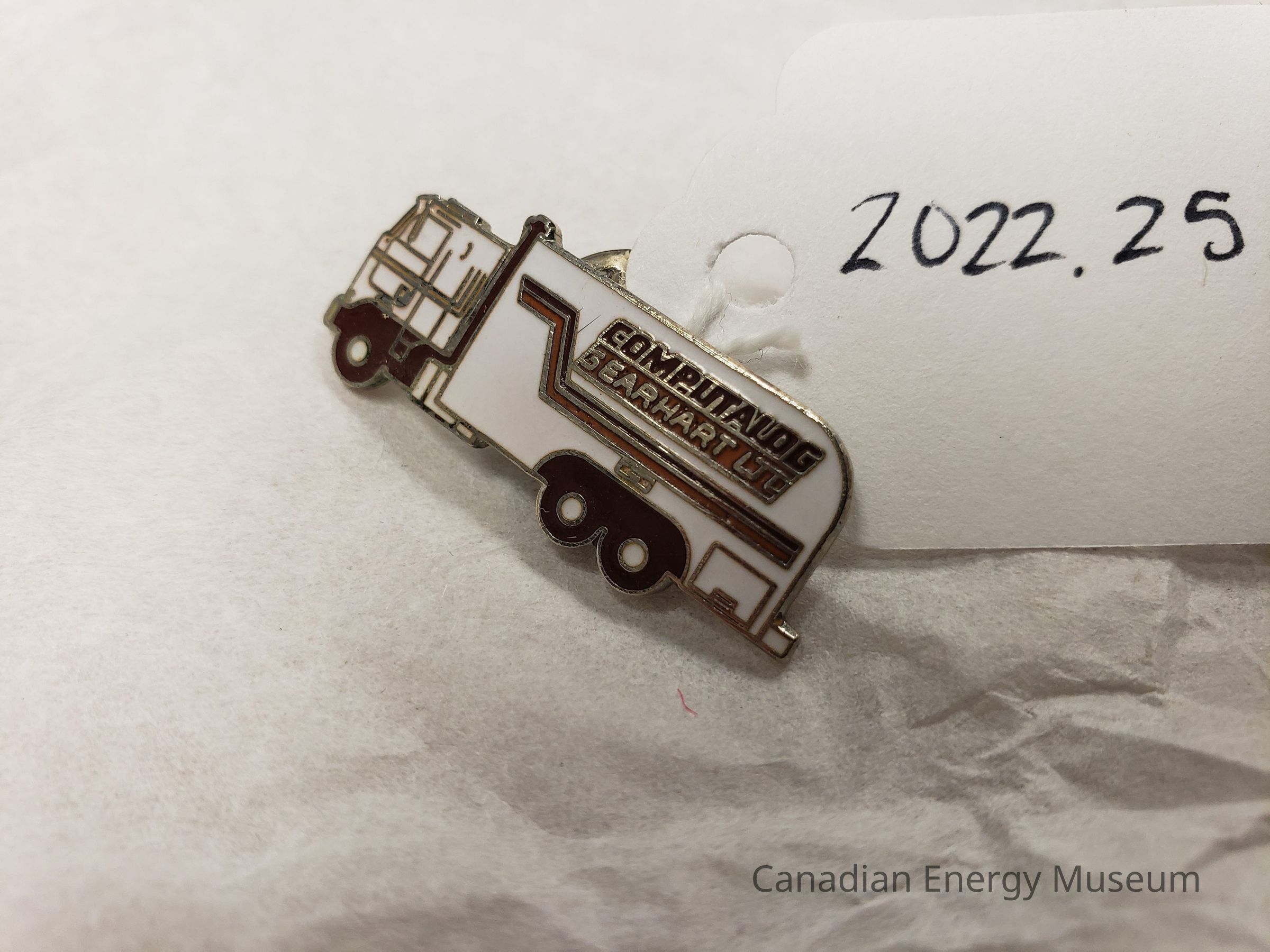 An enamel lapel pin in the shape of a truck, branded to Computalog Gearhart Ltd., and filled with white, brown, and orange enamel.Collection