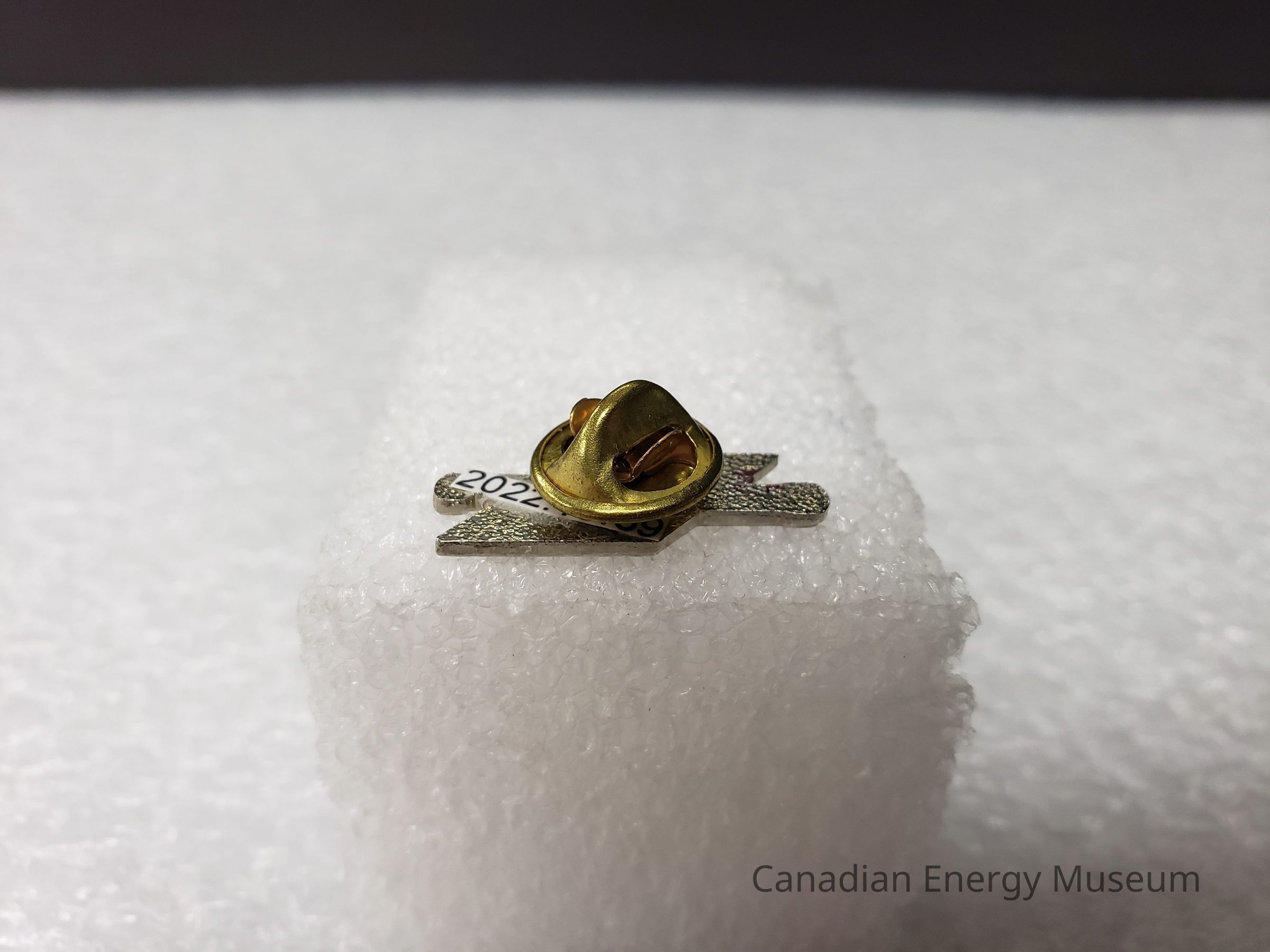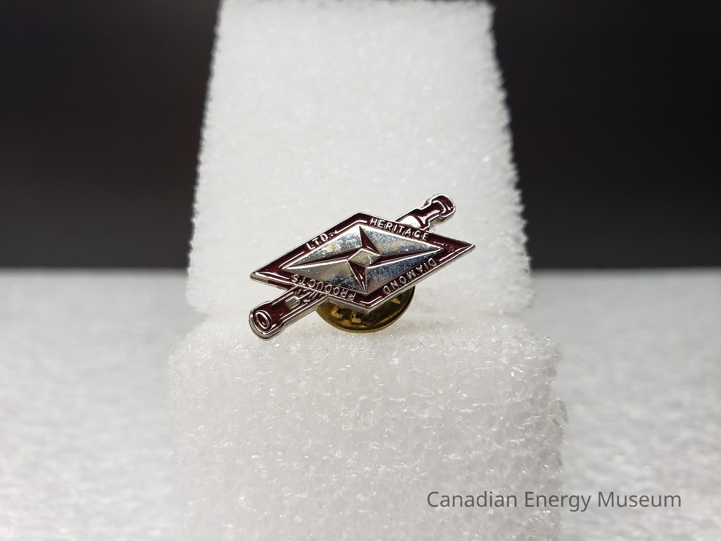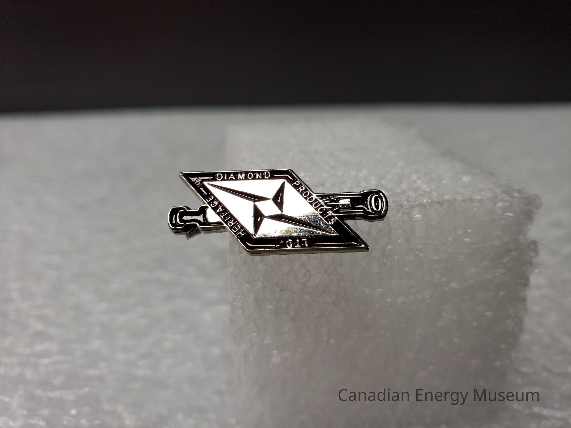 Old Description(Kelsey Steil, 6/1/2022):Lapel pin. Shaped like a diamond with a pipe crossing over the centre. Silver with burgundy border and starburst design in centre. Text reads: Diamond Products Heritage Ltd.Collection