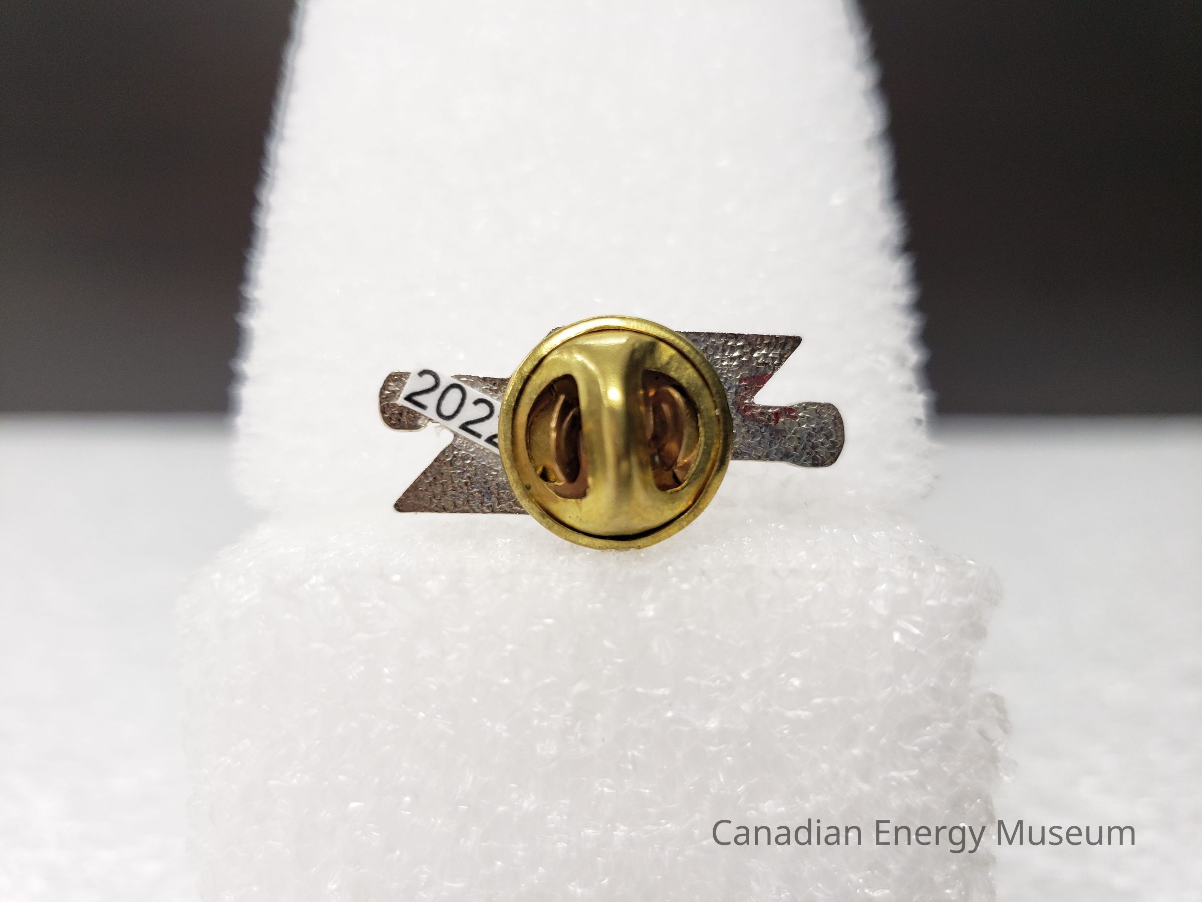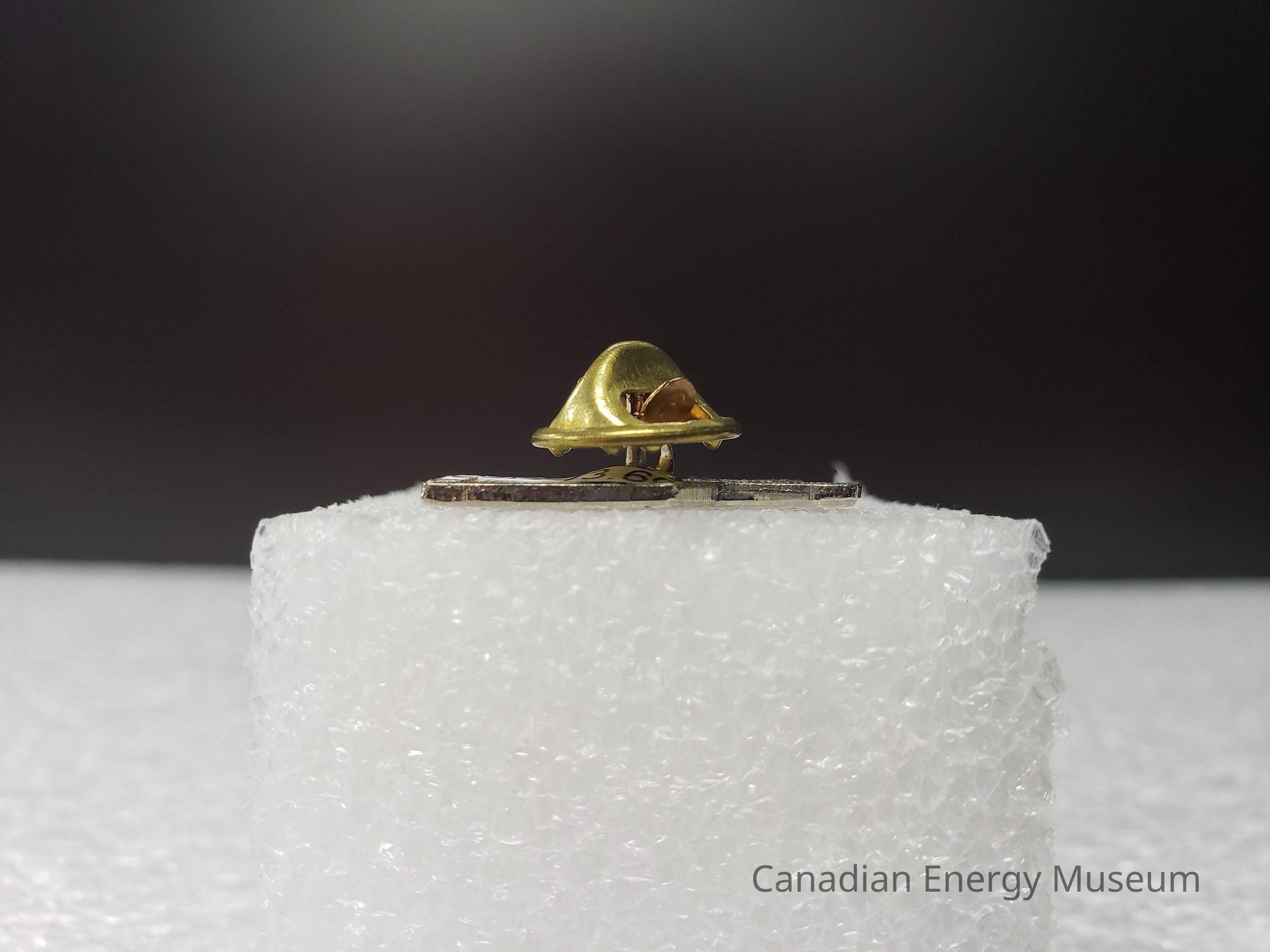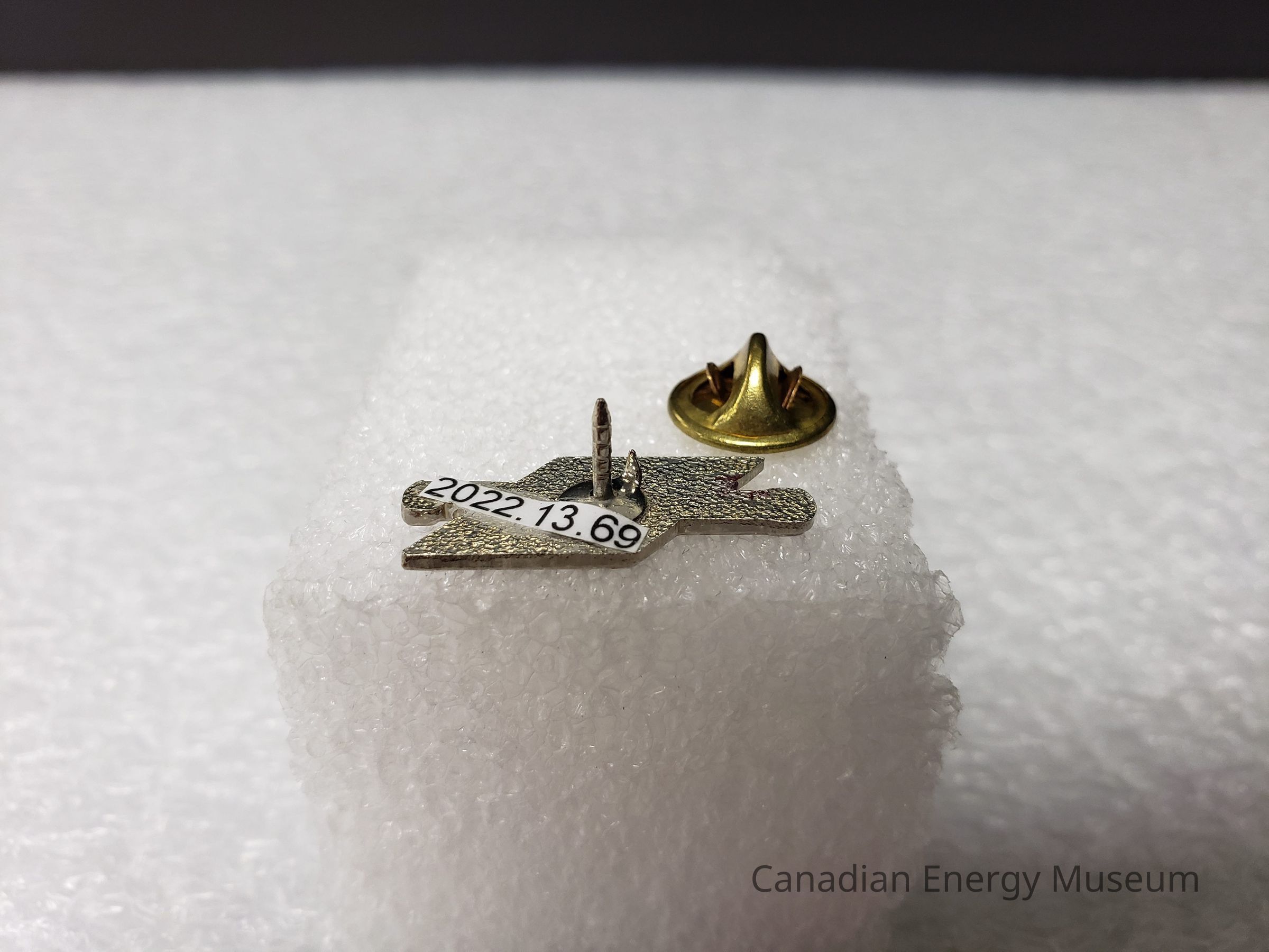 Old Description(Kelsey Steil, 6/1/2022):Lapel pin. Shaped like a diamond with a pipe crossing over the centre. Silver with burgundy border and starburst design in centre. Text reads: Diamond Products Heritage Ltd.Collection