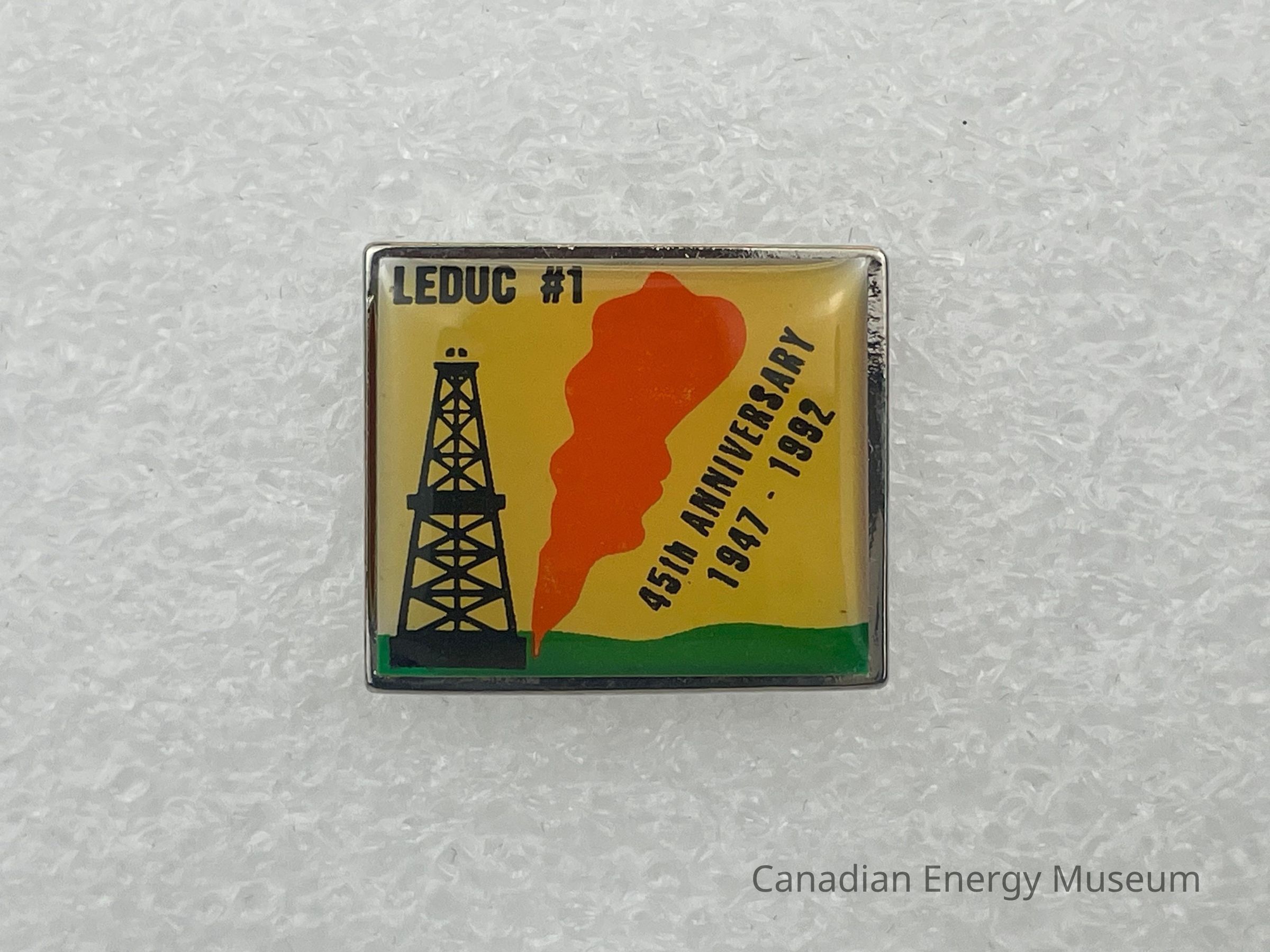 Pin is a rectangular shape made of a silver coloured metal. The design consists of a yellow background with green grass, and a black oil derrick on the left with orange smoke rising from its base. The top left corner displays black text reading, "LEDUC #1". Black text is also placed on the right, horizontally aligning with the smoke and reads, "45TH ANNIVERSARY 1947 - 1992".