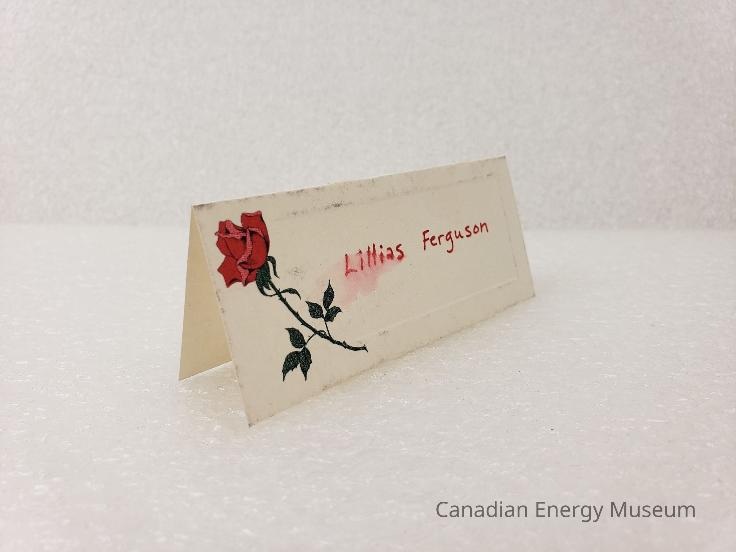 A small, elongated place card, made out to Lillias M. Ferguson. Features a printed red rose with the name written in red marker pen. The card has a debossed centre, creating a raised border around the edge of the front side.