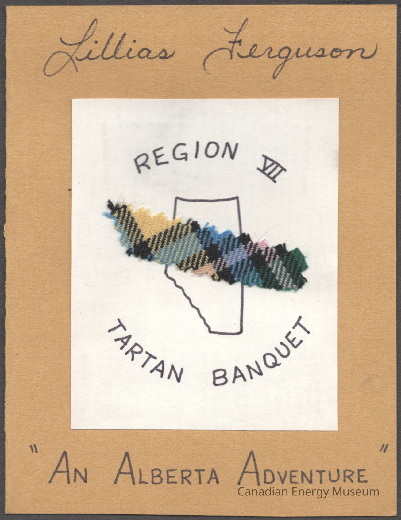 A place card (styled like a greeting card) made out to Lillias M. Ferguson. Handmade with handwritten (in black ink) text reading "Lillias Ferguson; REGION VII TARTAN BANQUET; "AN ALBERTA ADVENTURE"". The card base is a mustard-yellow textured cardstock, at the centre of the cover of which is adhered a white rectangle of paper, onto which is adheres a strip of multi-coloured tartan fabric with zig-zag cut edges. Behind the tartan fabric is a simple outline of Alberta. The interior is blank.