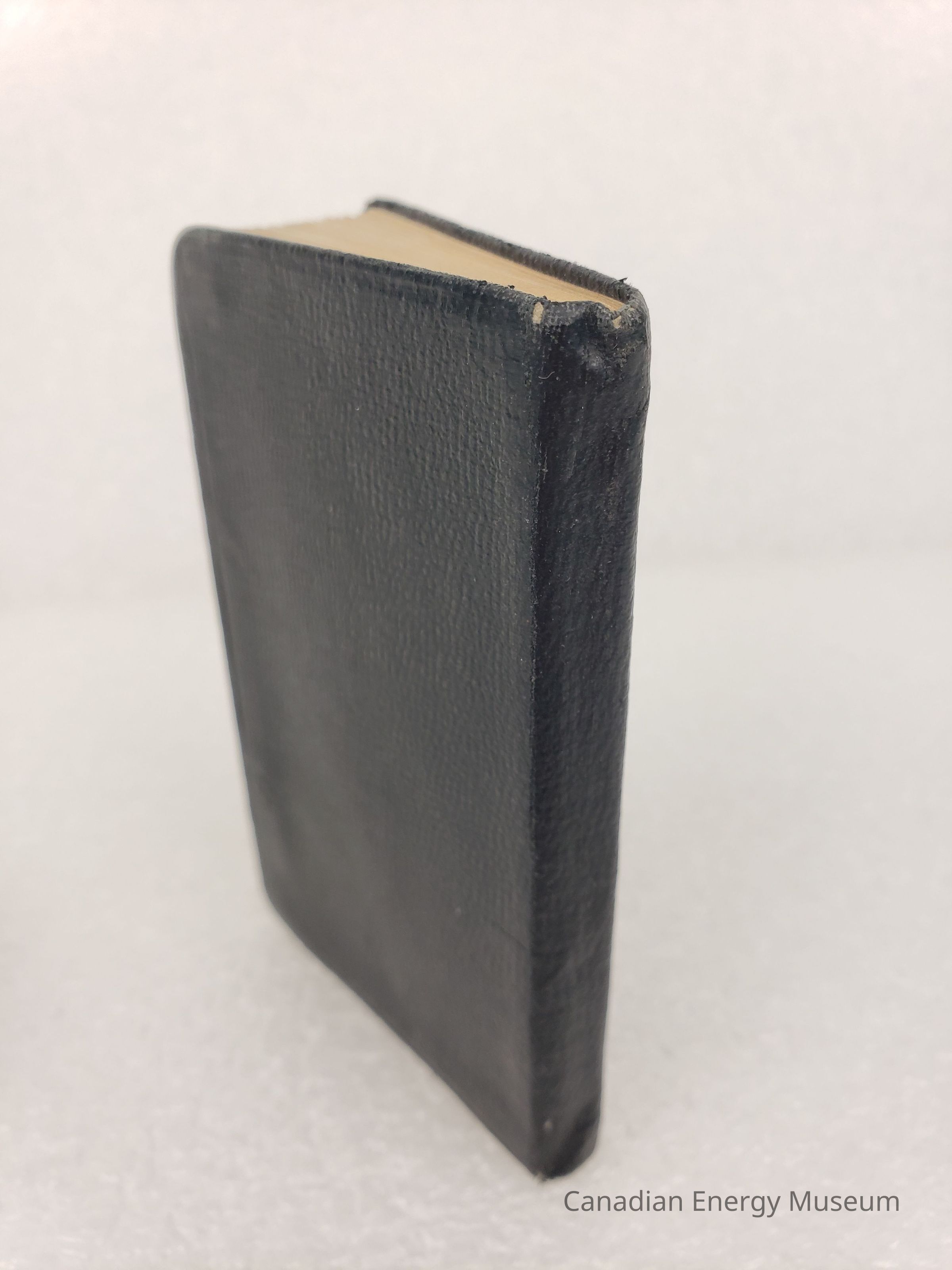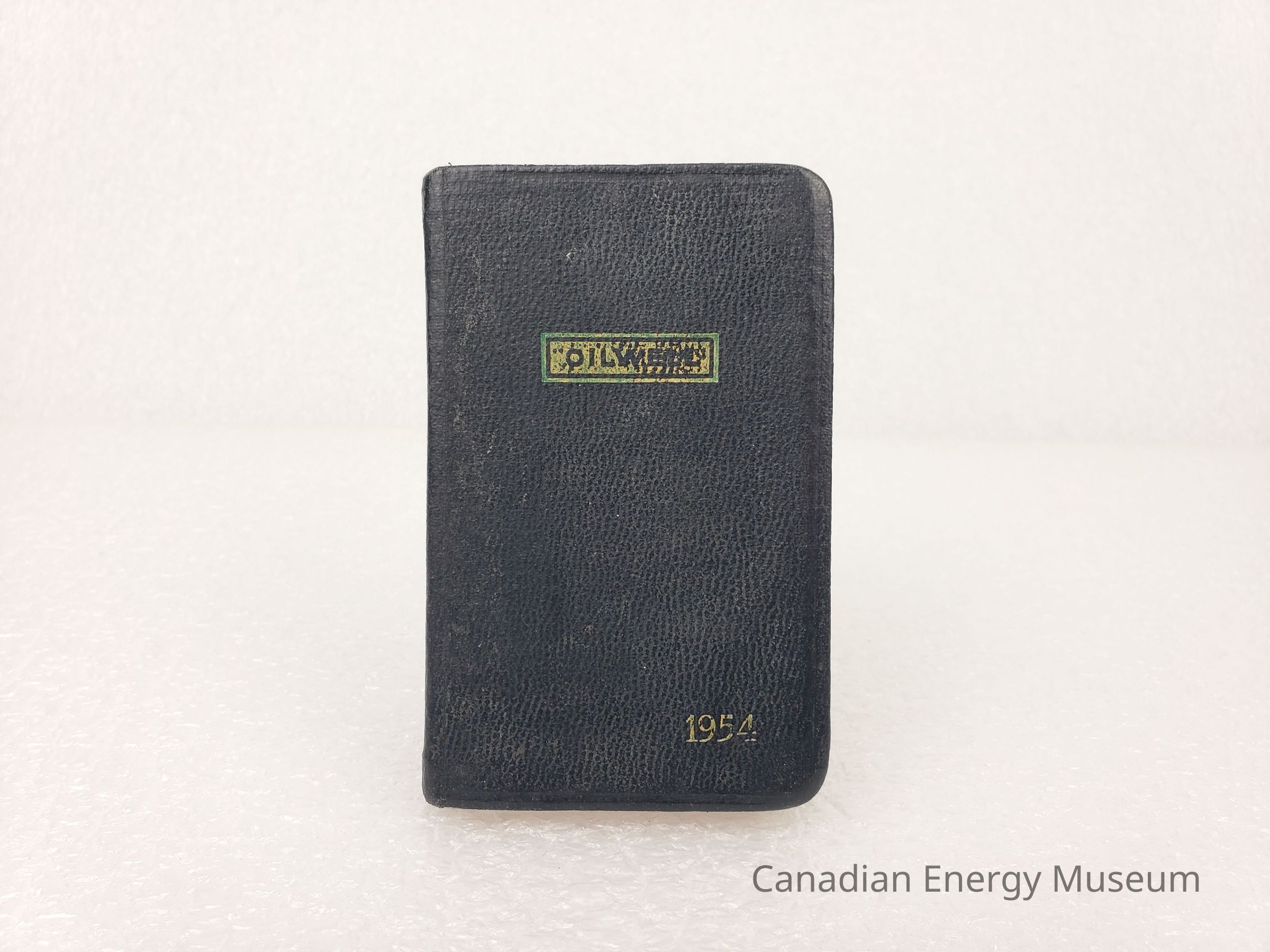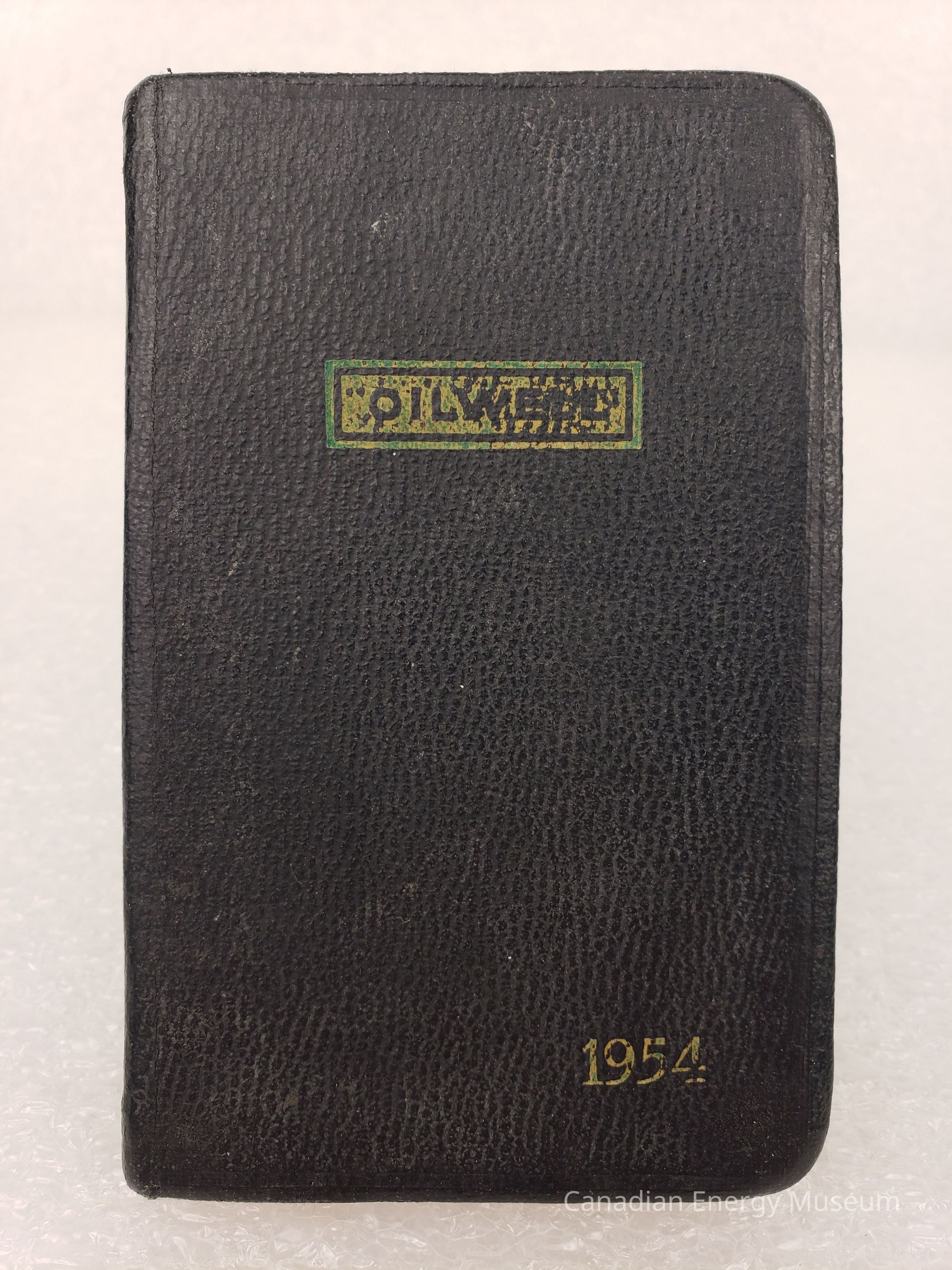 Description: A small book with a deep-navy/black textured faux leather cover. On the front cover is a small, bordered rectangle containing the text "OILWELL" printed in worn gold in the upper-centre, and "1954" printed in worn gold in the bottom-right. Corner are rounded, and the edges of the pages are gold-foilled.