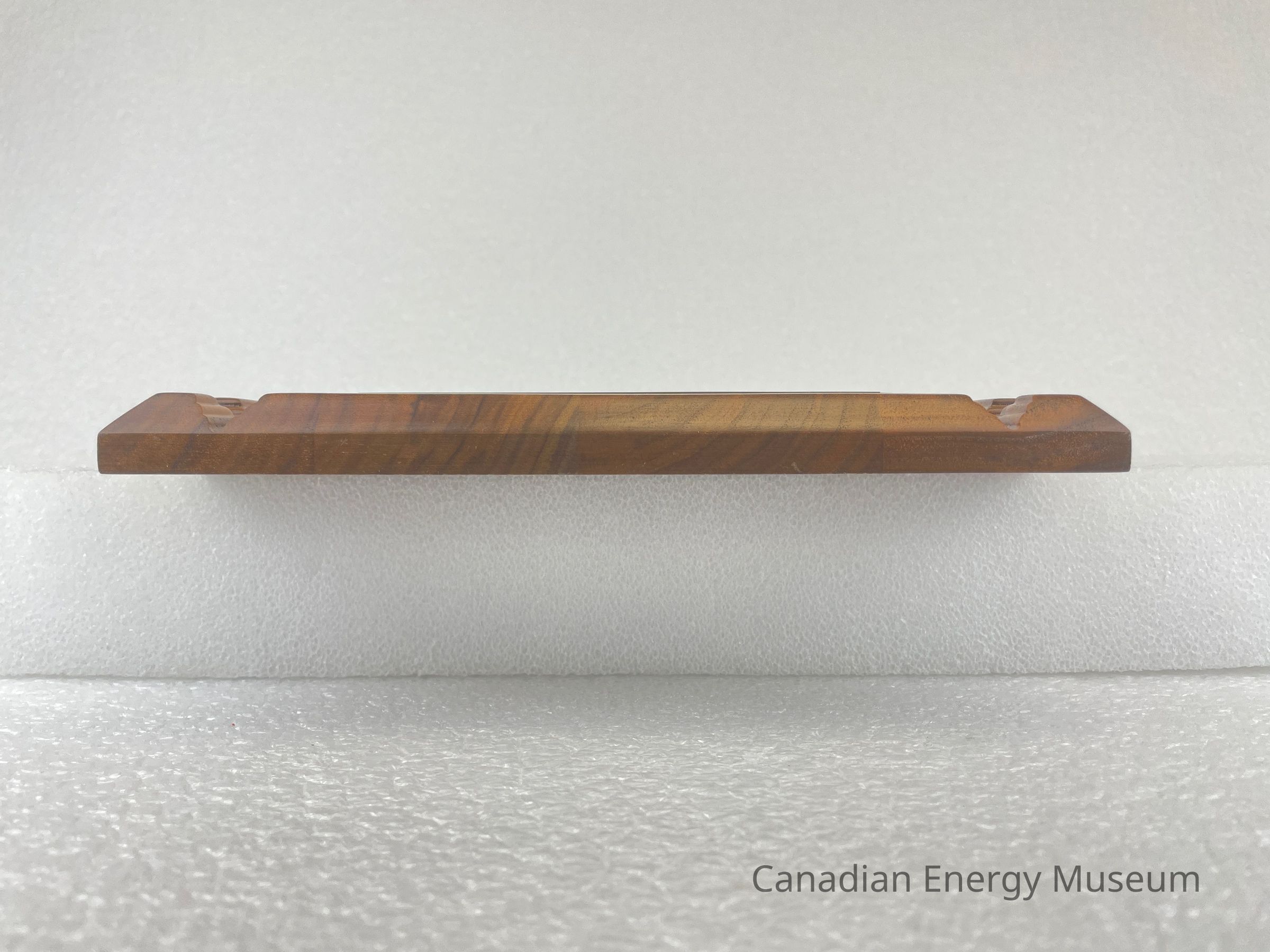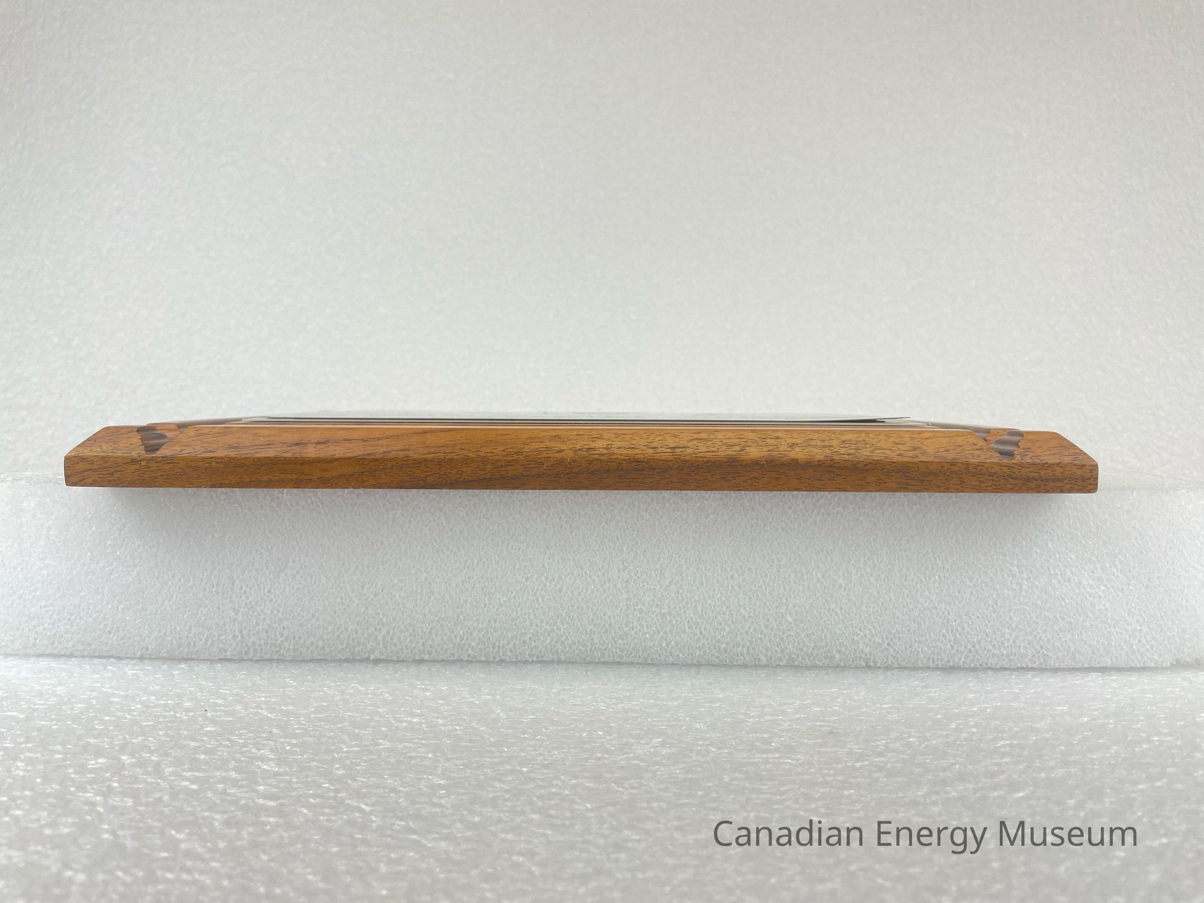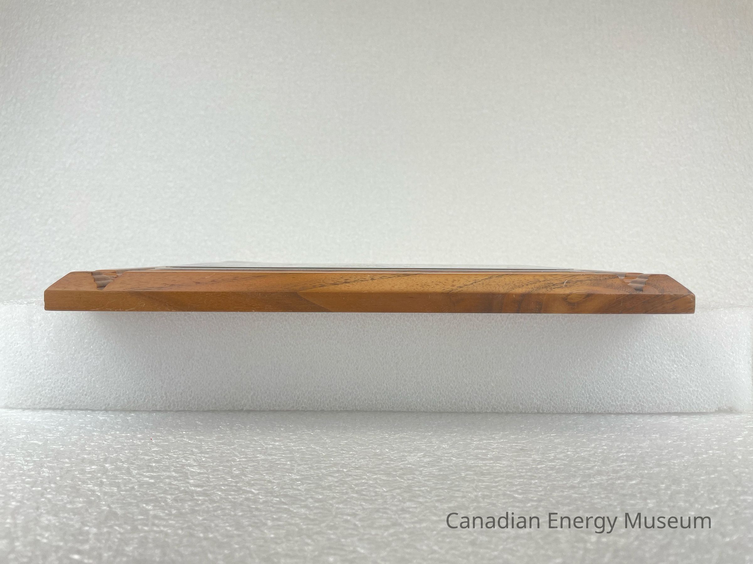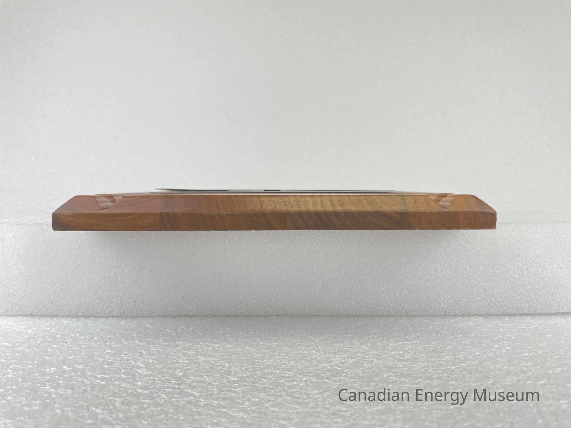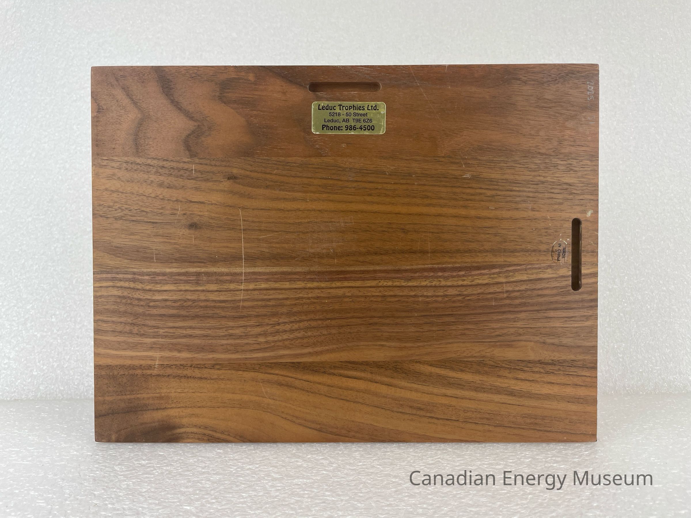 The back of the wooden backing has two spaces cut out so that it can be hung on a wall. These are placed at the top of the back and on the right side. A gold rectangular sticker is placed at the top with black text reading, "Leduc Trophies Ltd. / 5218 - 50 Street / Leduc, AB T9E 6Z6 / Phone: 986-4500". A clear sticker, underneath the right cut out, with black text reads, "MADE IN CHINA".Collection