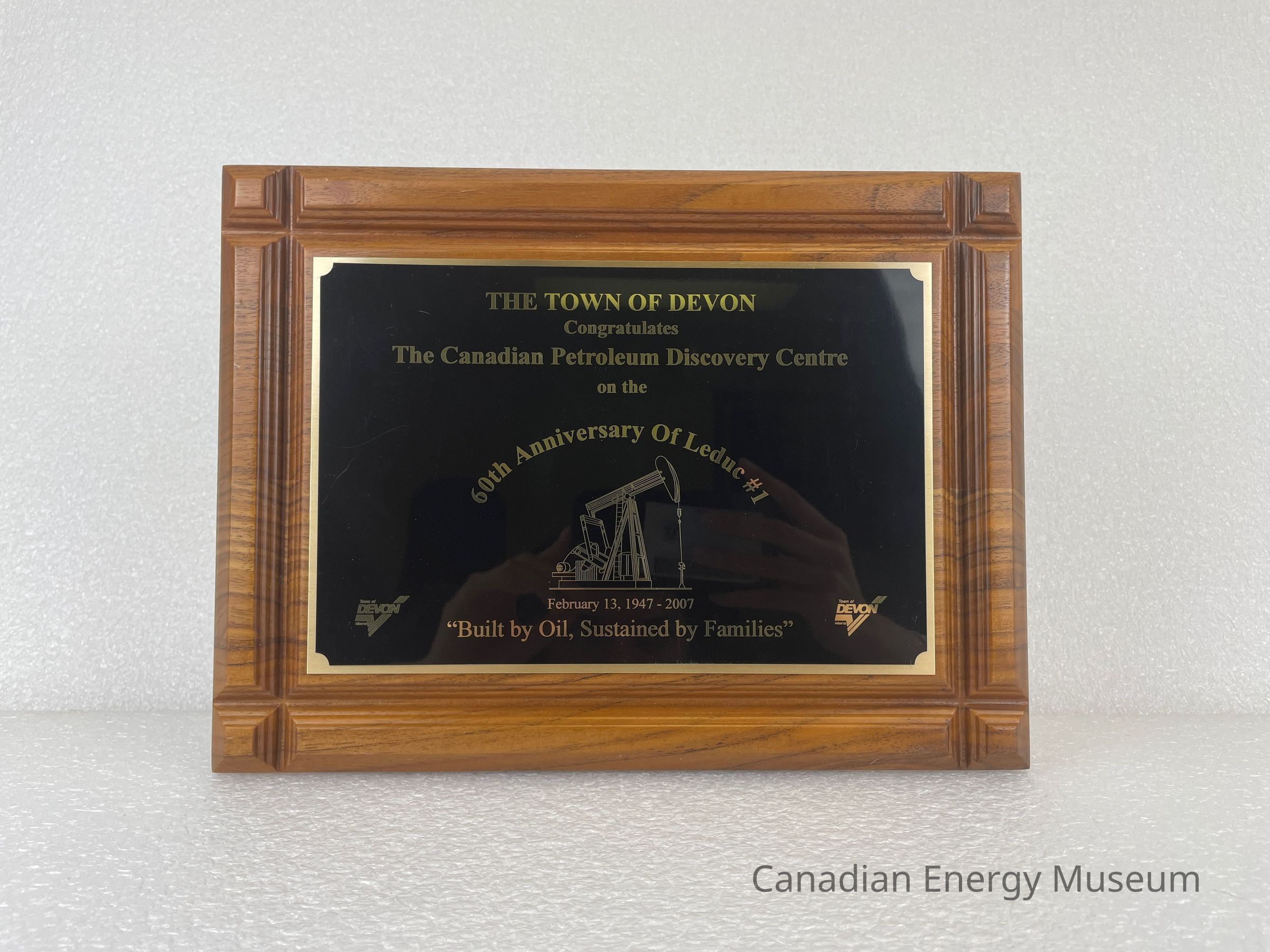A wooden plaque with a black metal plate and gold text. The wooden base is stained a warm brown colour and has deep grooves on each side, creating pyramid corners. The black metal plate rests on a gold metal plate. Gold text reads from top to bottom, "THE TOWN OF DEVON / Congratulates / The Canadian Energy Petroleum Discovery Centre / on the / 60th Anniversary Of Leduc #1 / February 13, 1947 - 2007 / "Built by Oil, Sustained by Families"". The metal plate also features a large golden illustration of a pump jack underneath "60th Anniversary Of Leduc #1". The Town of Devon logo is placed on both the bottom left and bottom right corners of the plate; text reading "Town of / Devon / Alberta" with three lines creating a check mark running underneath the text.