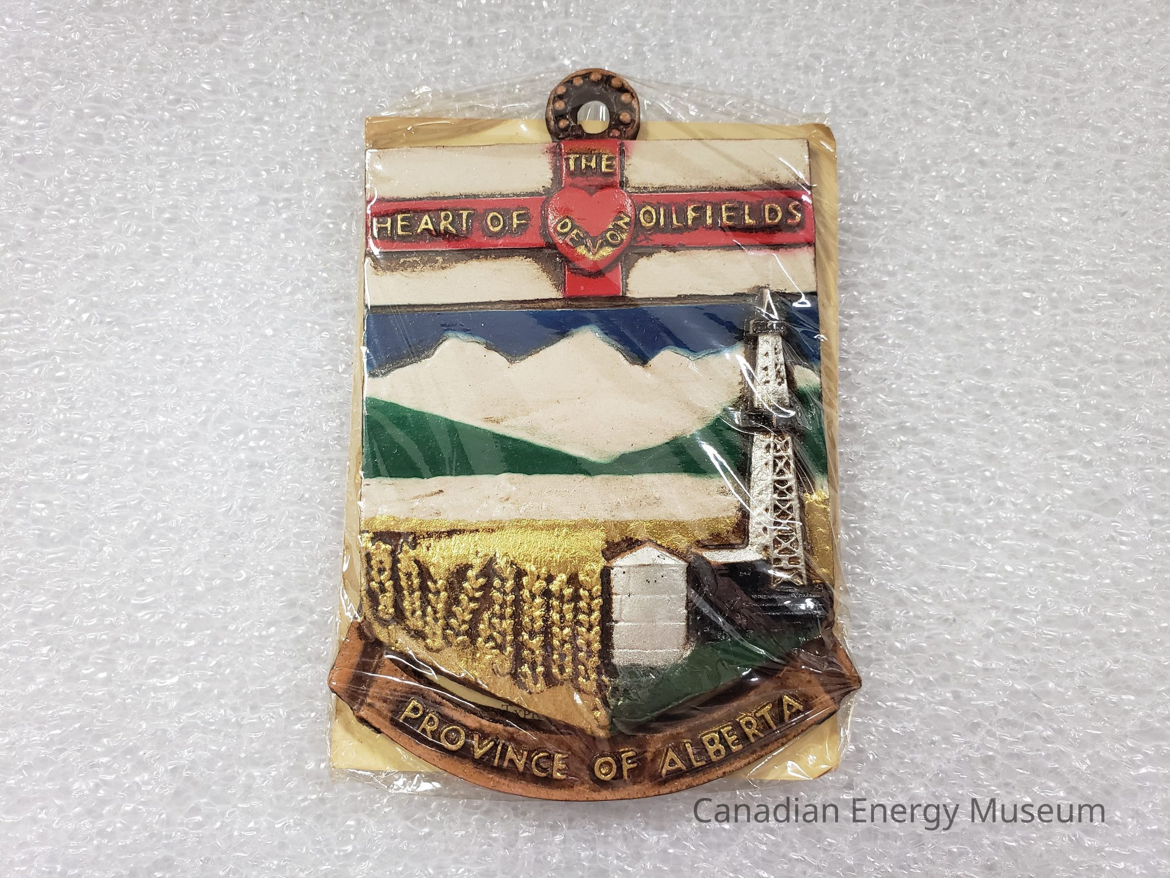 A wooden plaque, identical to those on two coaster sets (2024.0.111-112). The design has the text "THE HEART OF DEVON OILFIELDS", imagery of mountains, grain fields, and a derrick painted in white, red, blue, green,gold, silver, and black. Along the bottom is a ribbon reading "PROVINCE OF ALBERTA".Collection