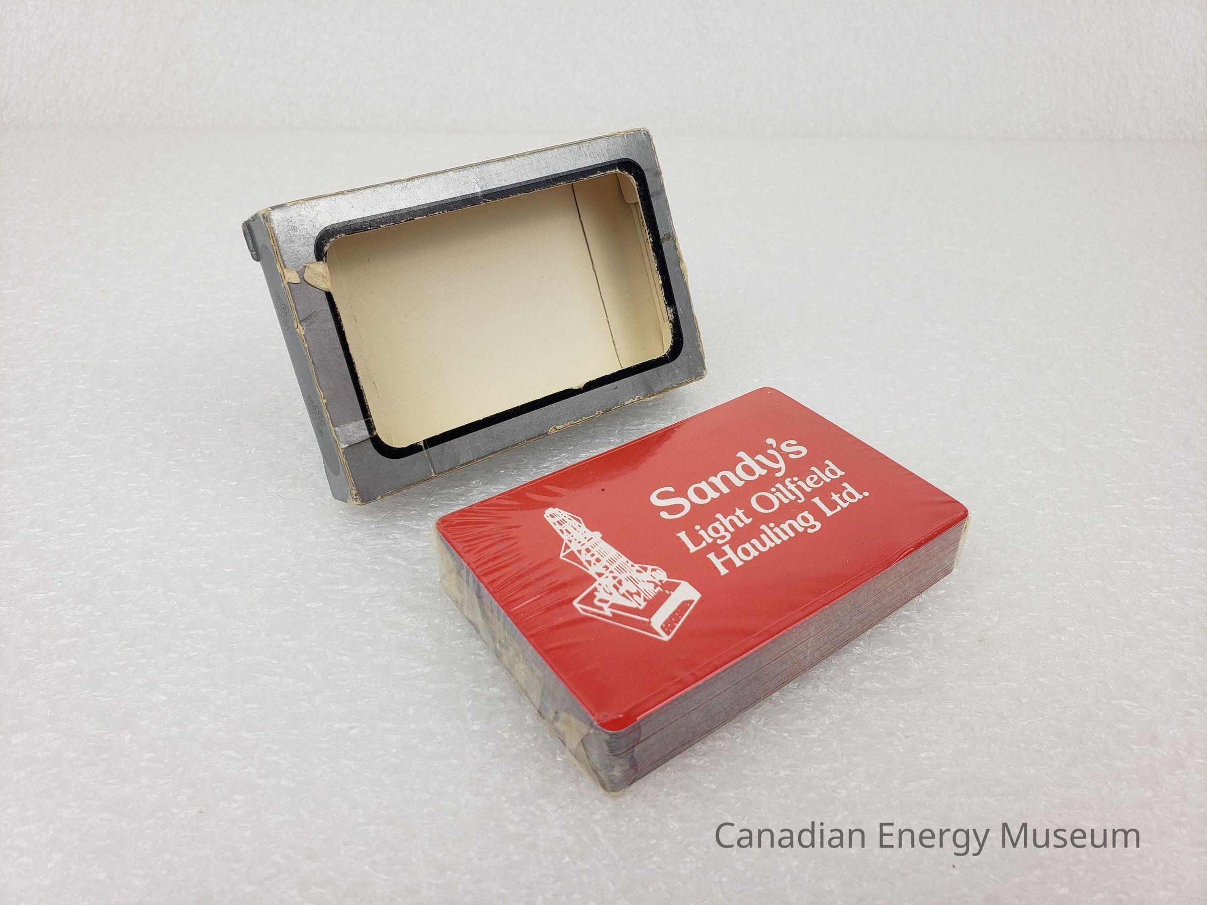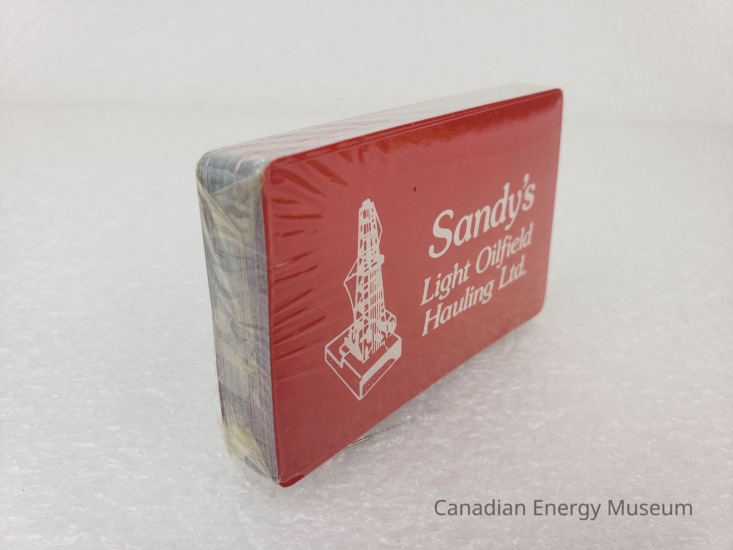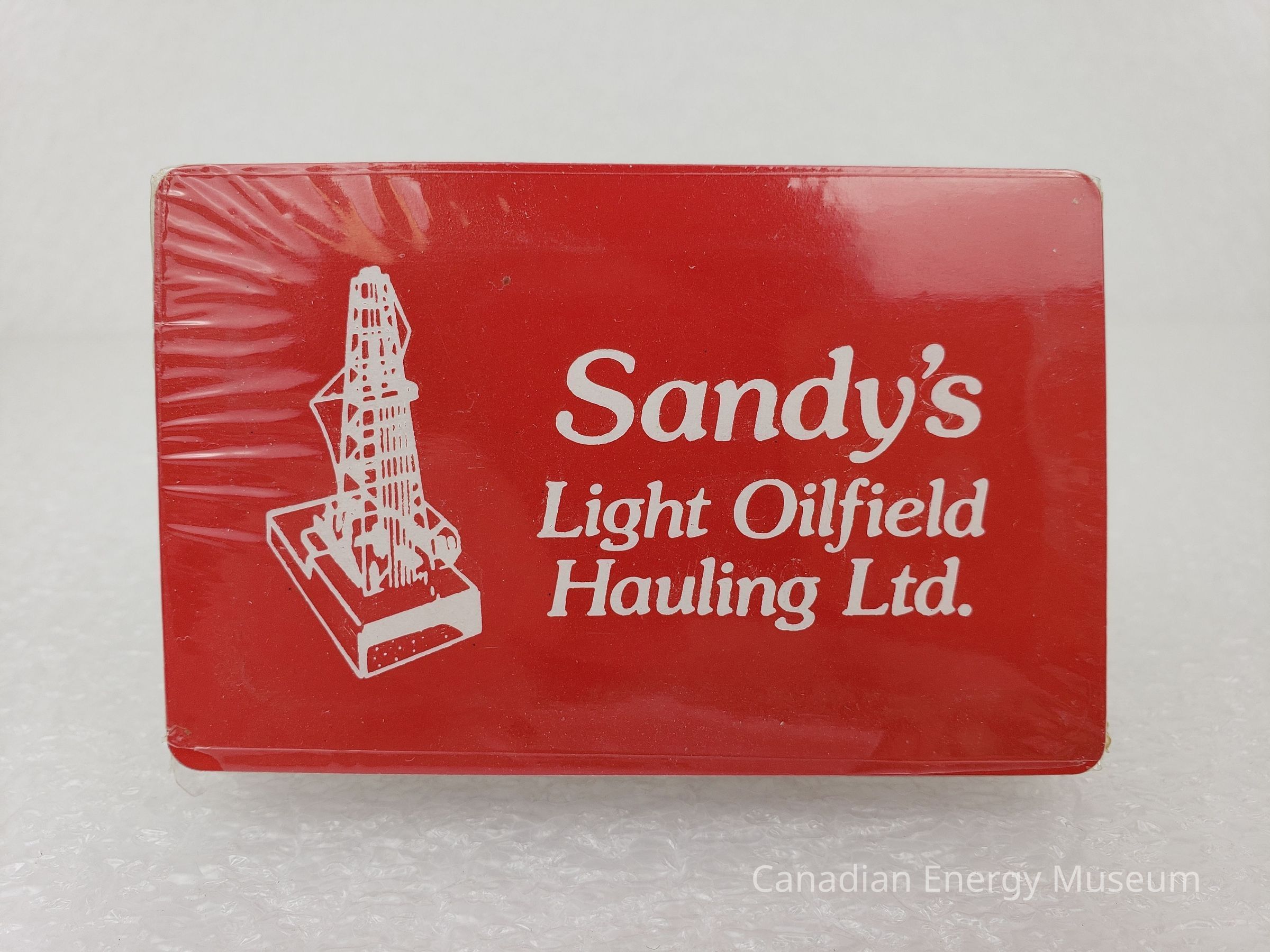 Playing Cards: The back design of the cards is a red base with white text "Sandy's Light Oilfield Hauling Ltd." and illustration of an oil derrick.