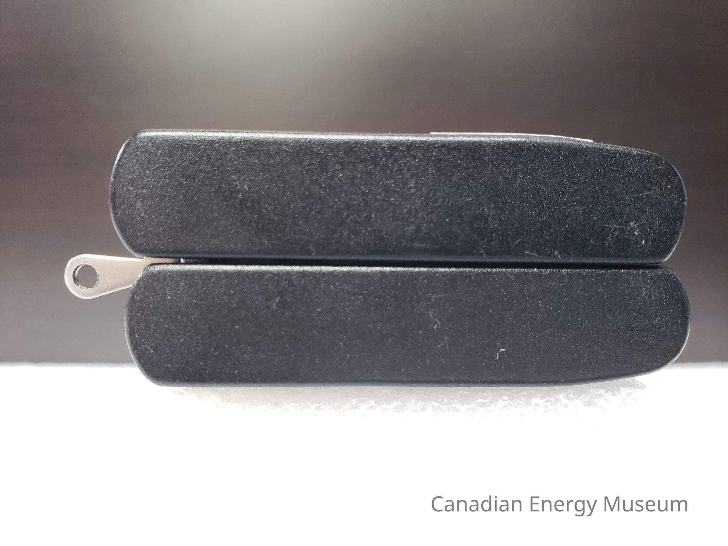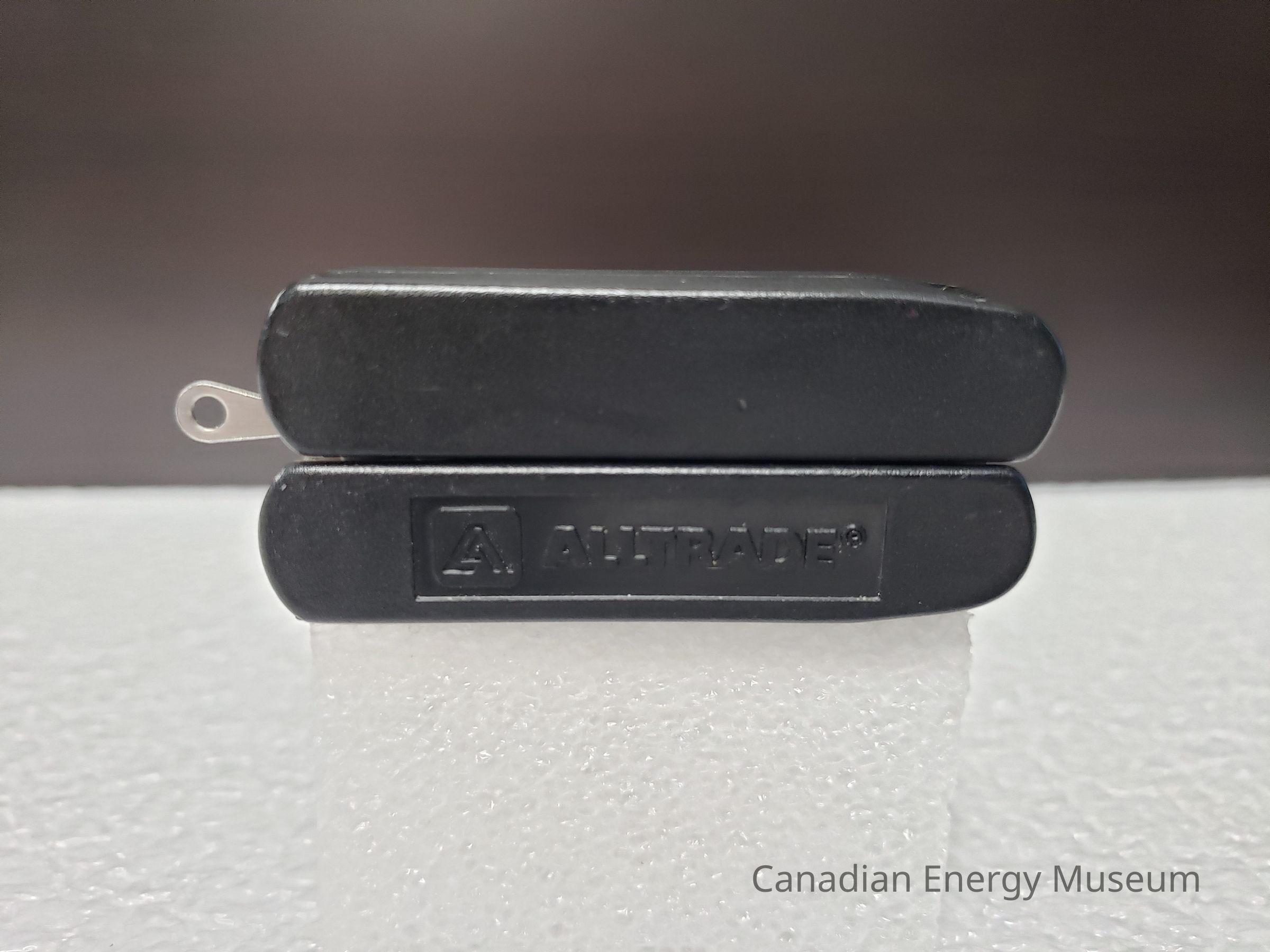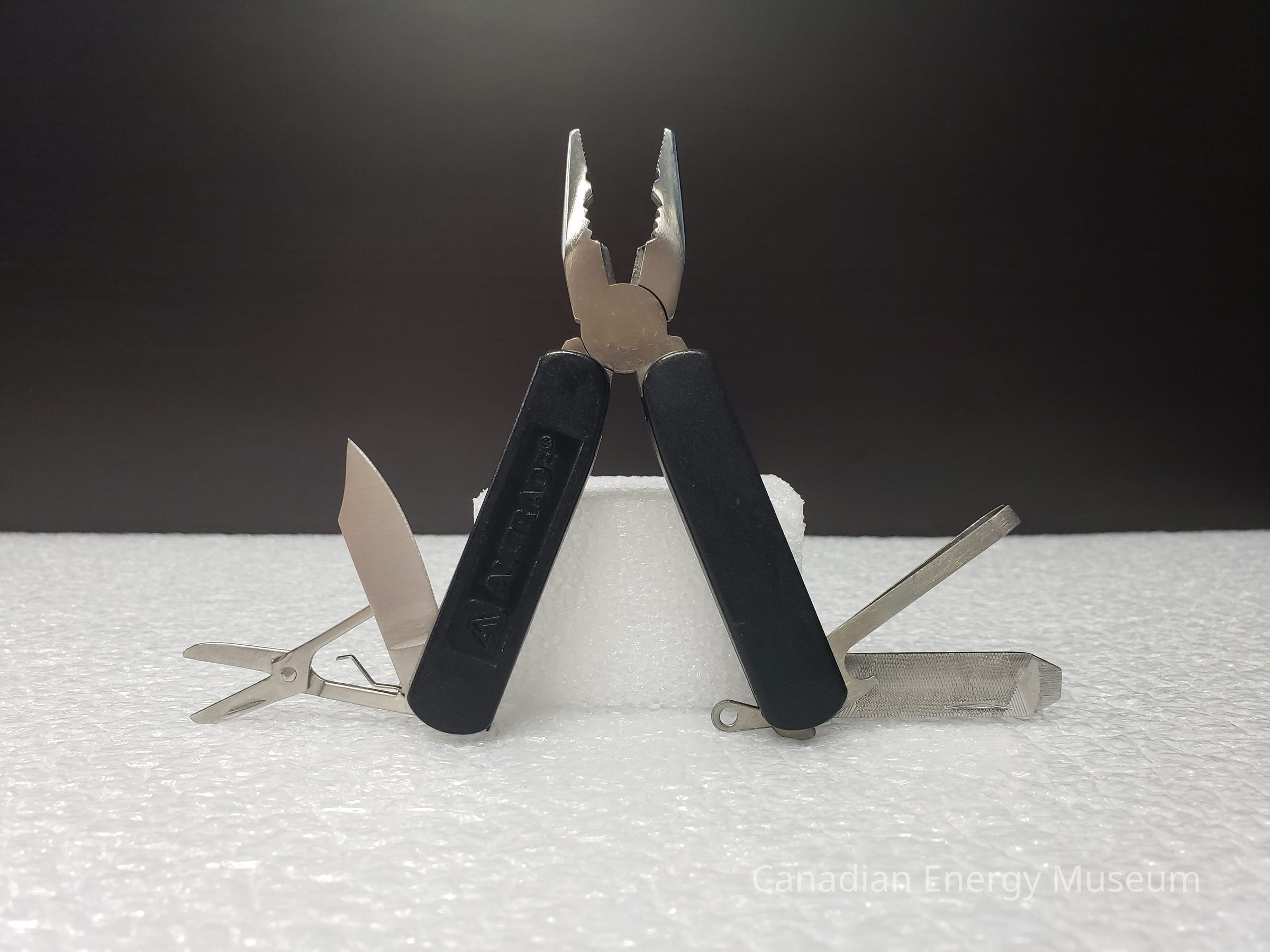 Old Description (Kelsey Steil, 6/1/2022): Pocket knife with black plastic handle. Contains pliers, file, knife, tweezers, and scissors. Text on side advertises AllTrade.Collection