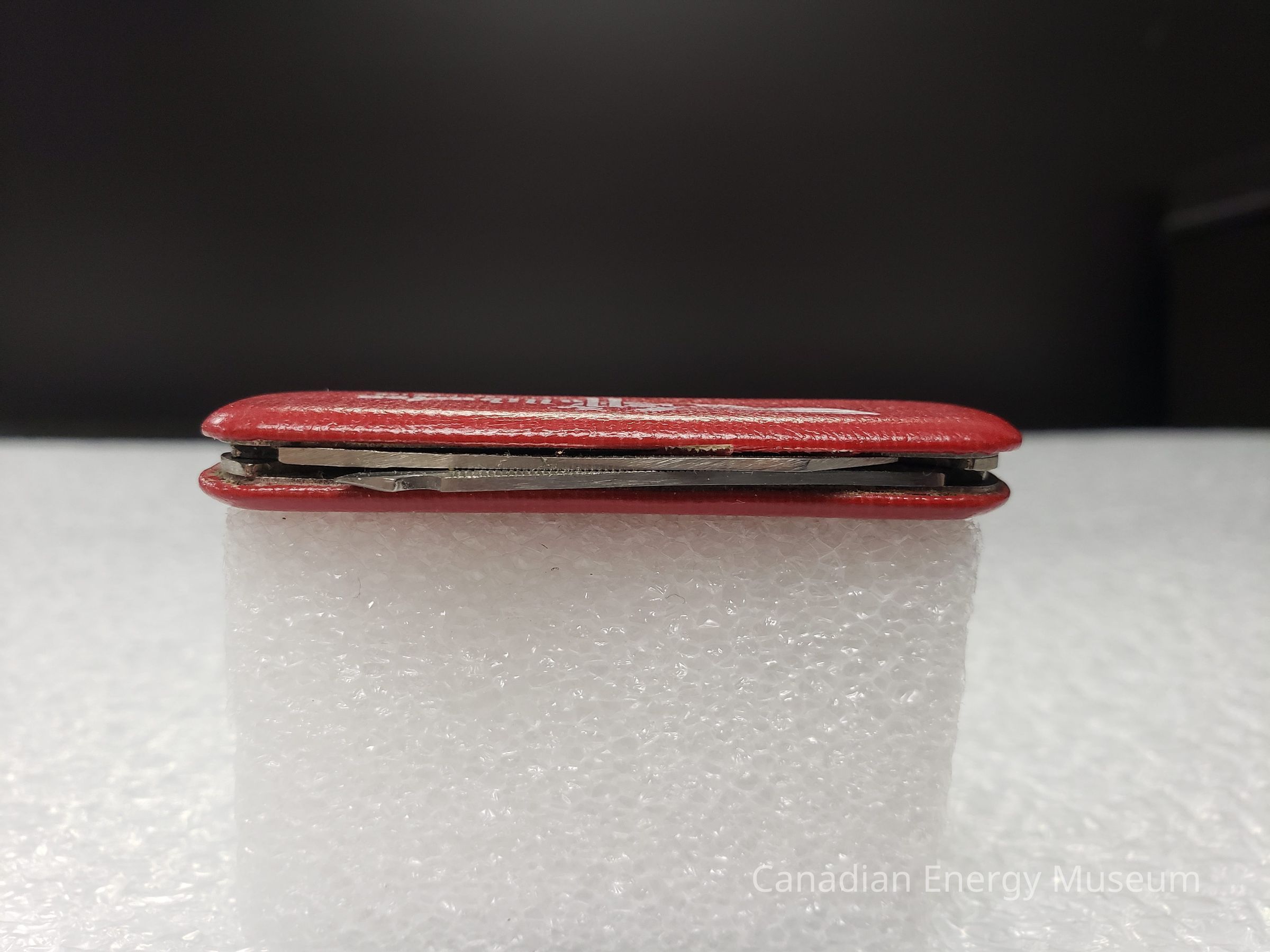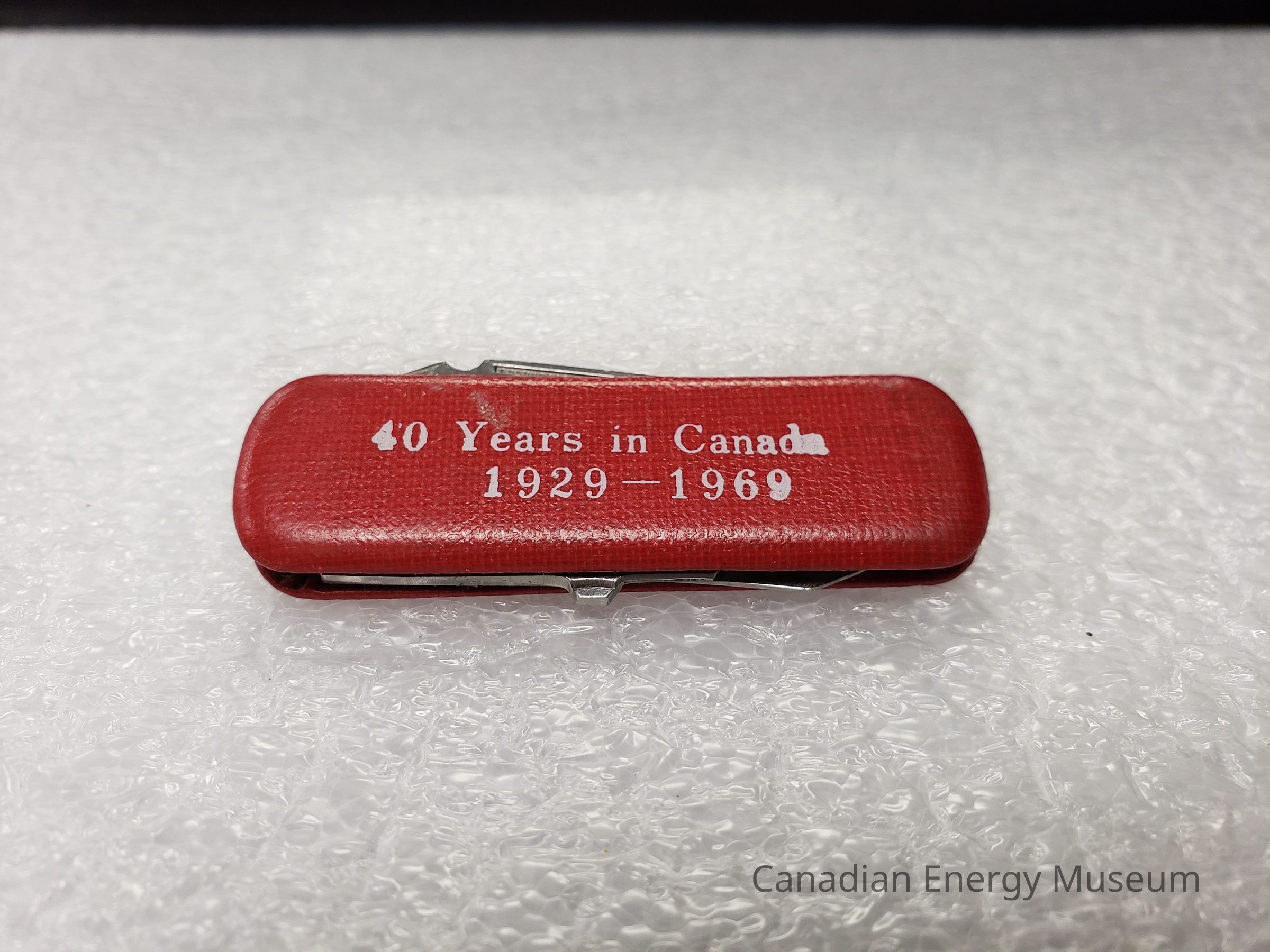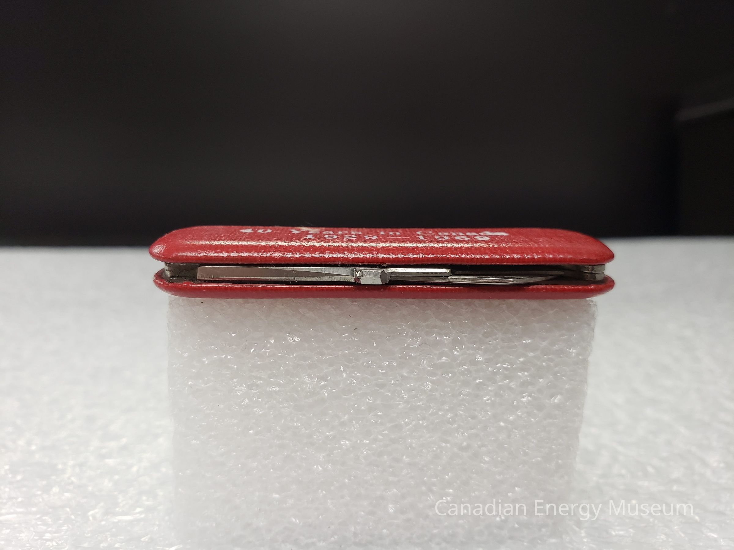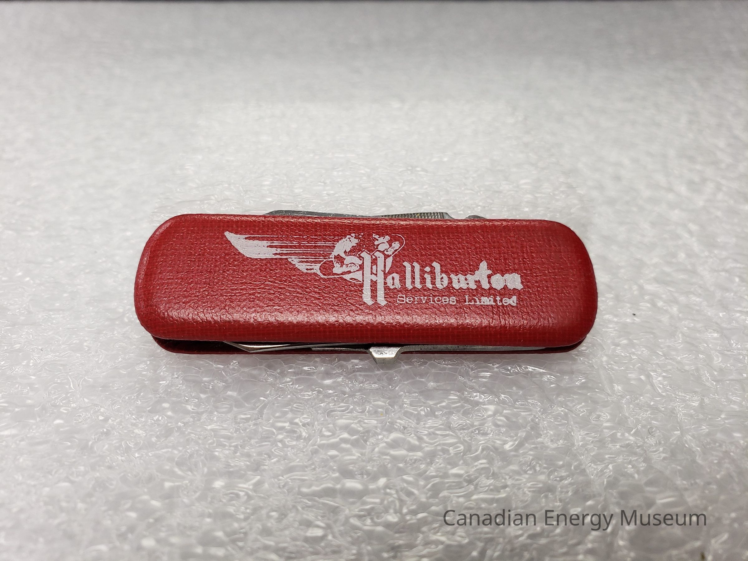 Features: Pocket knife is covered in a red, textured leather/faux-leather. On the front of this cover, to the right-centre is the white text: "Halliburton Services Limited", to the left and beneath the "H" is a ringed plant with a stylised wing to the left of it.Collection