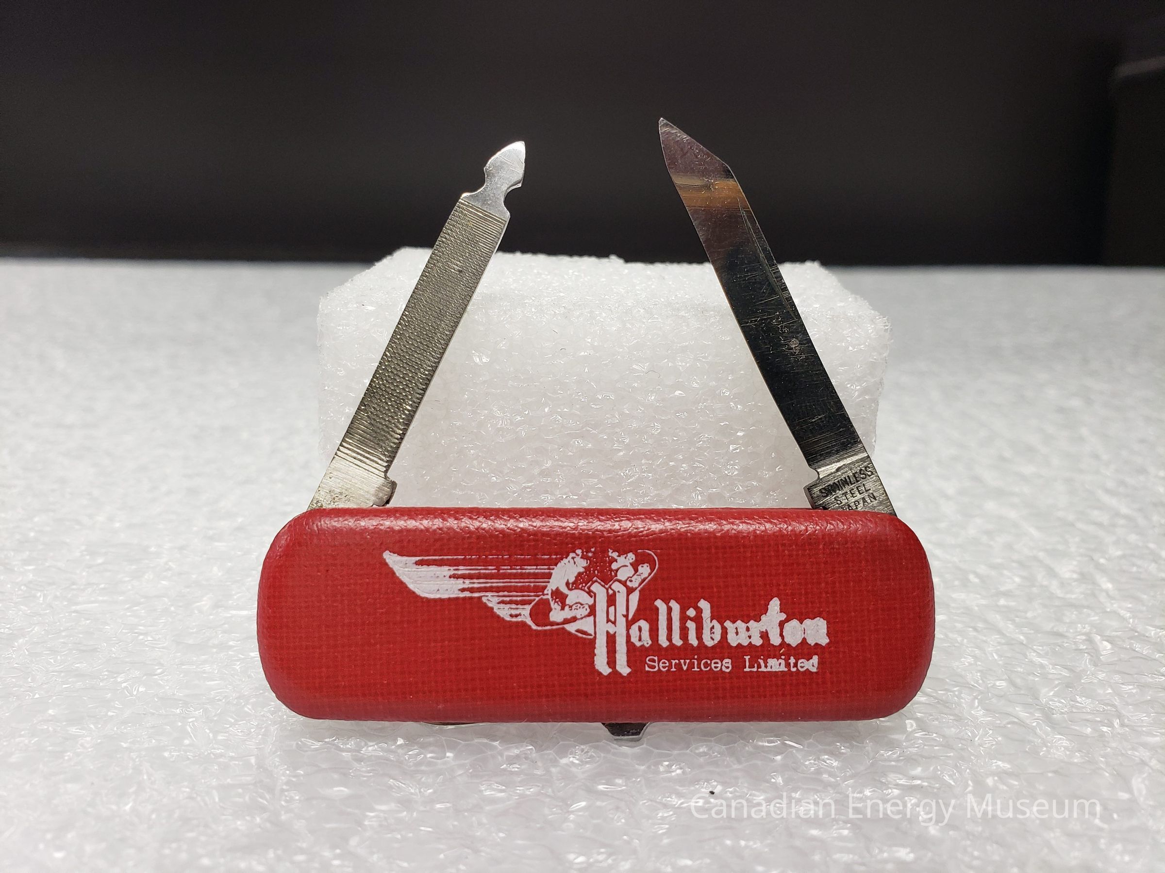 A pocket knife with a blade, file, and mini-scissors, branded to Halliburton Services Limited, a supplier of of products and services within the energy industry.