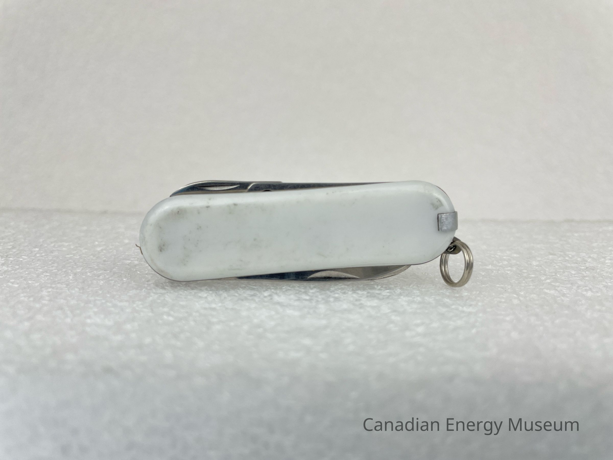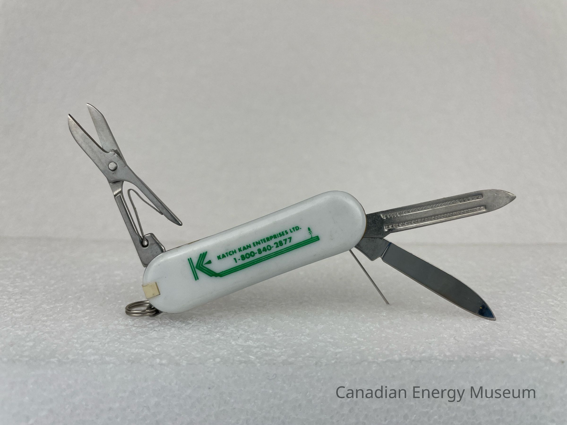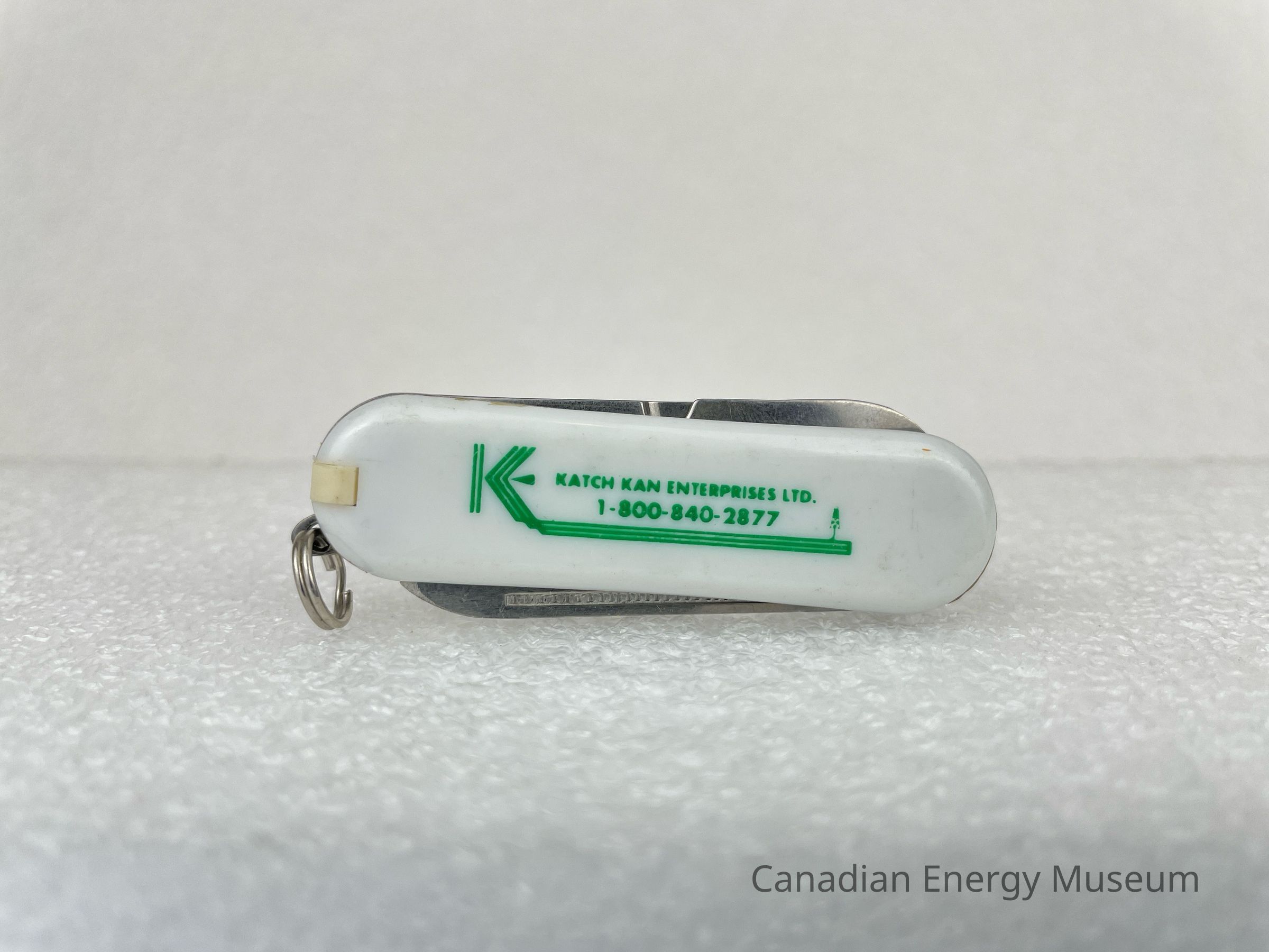 A silver metal pocket knife with a white plastic handle branded to Katch Kan Enterprises Ltd.