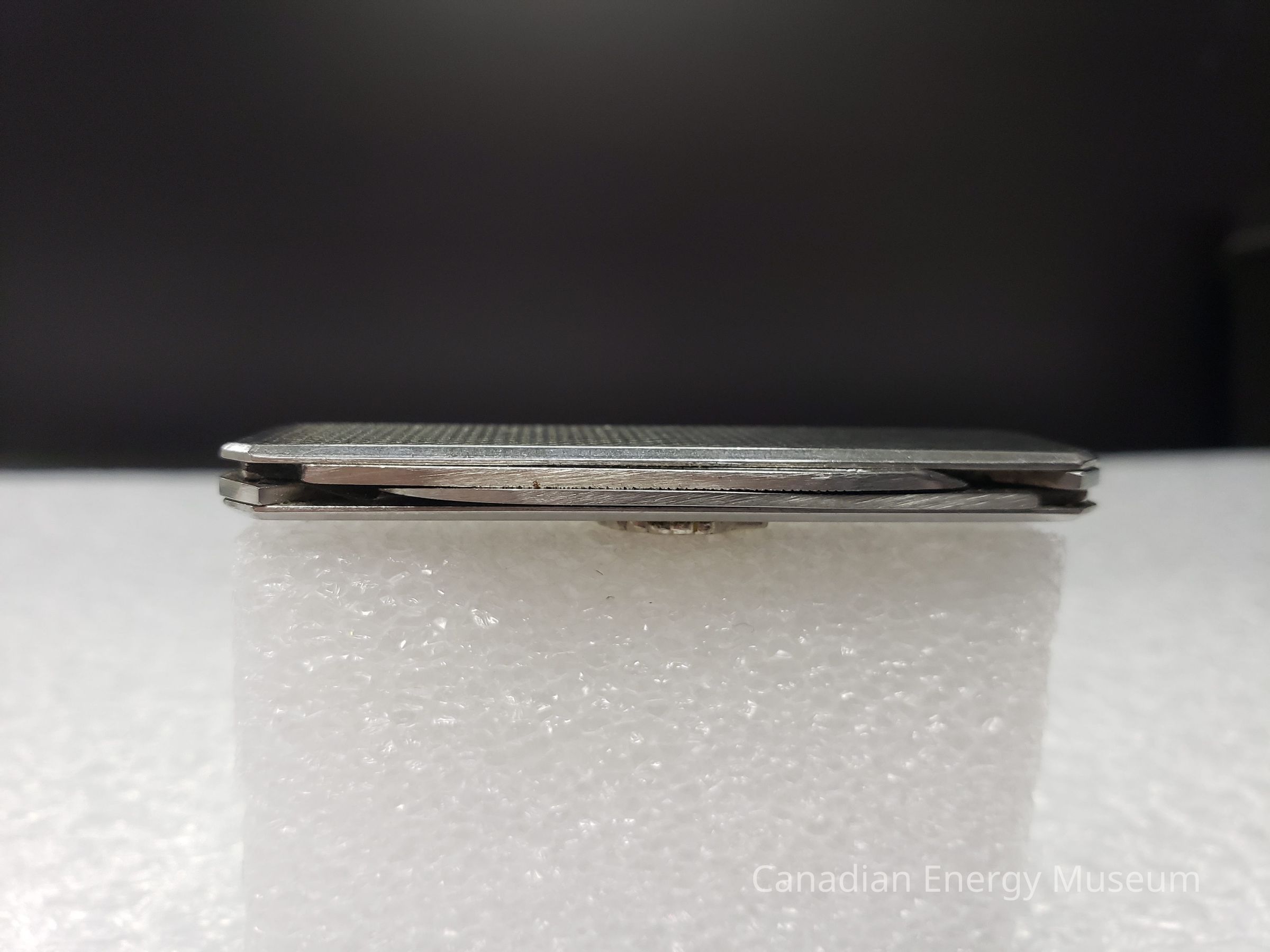 Features: Body is stainless steel, with a lightly engraved vertical wave patterning across the back, and top and bottom of the front. In the centre of the front is attached an engraved metal badge of the Shell Oil shell logo, the portions of which were filled with yellow paint.Collection