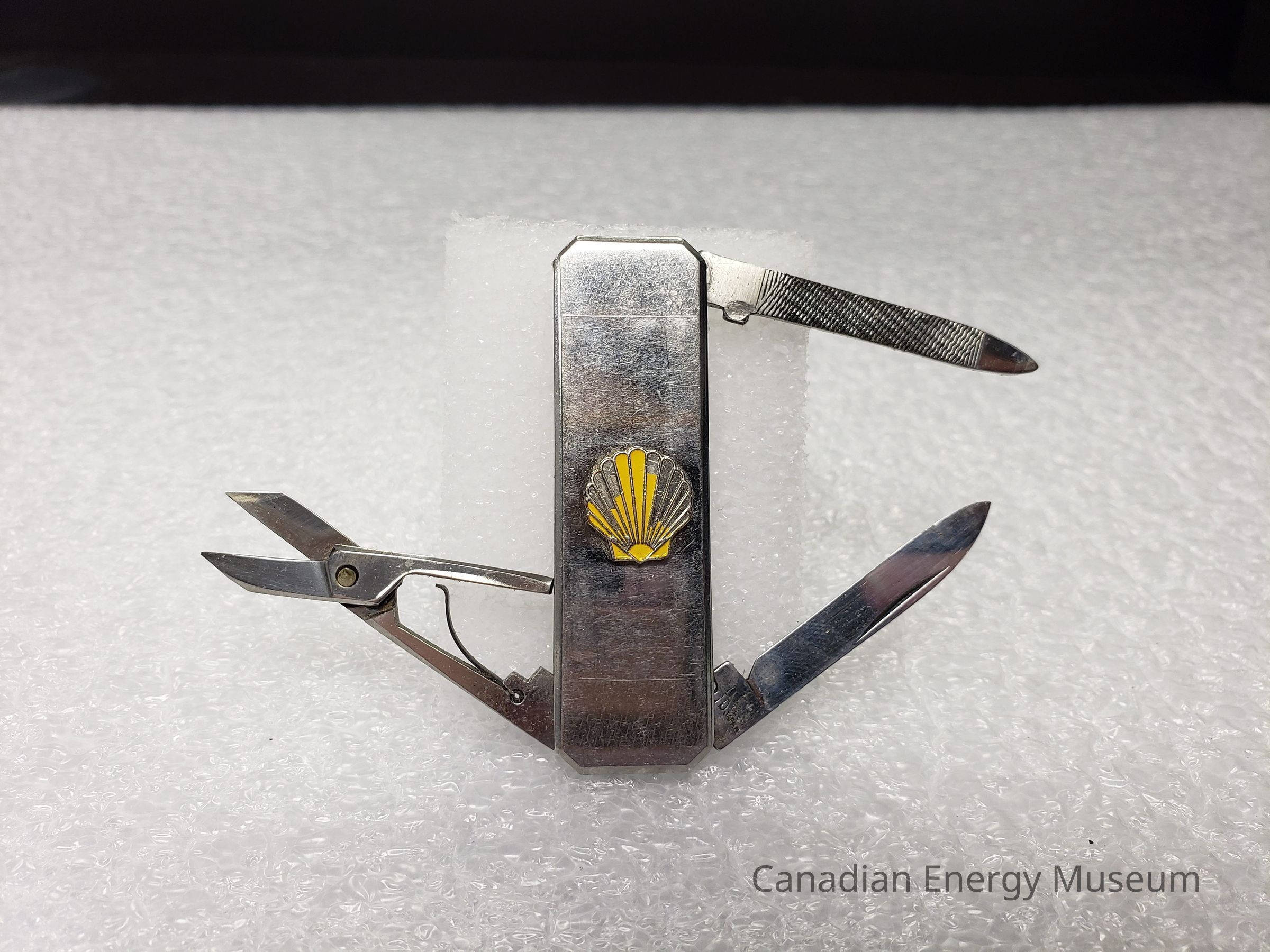 A pocket knife with a blade, file, and mini-scissors, branded to Shell Oil.