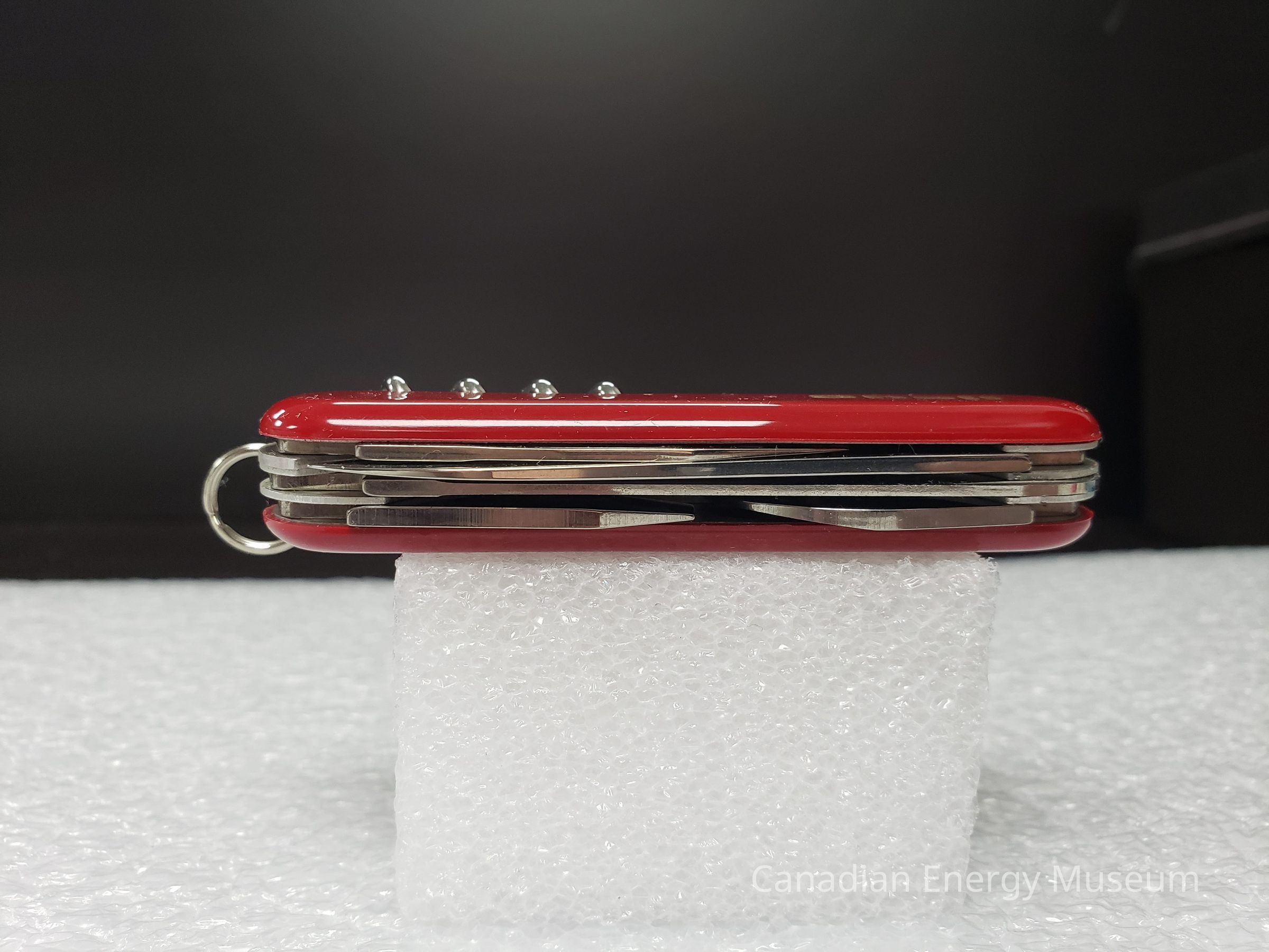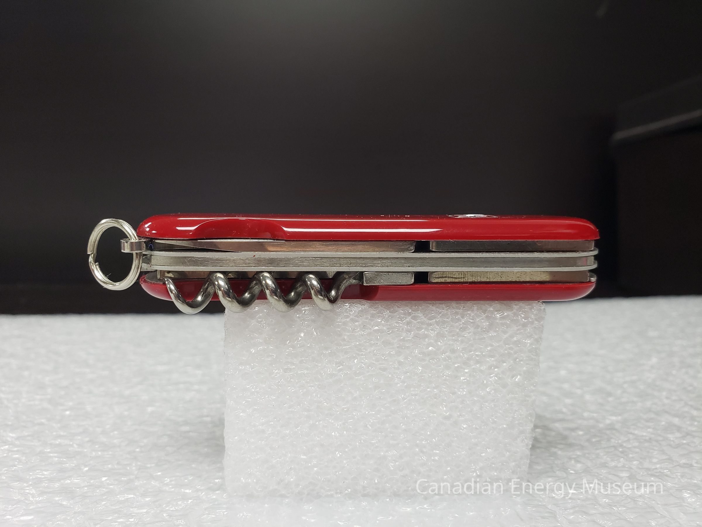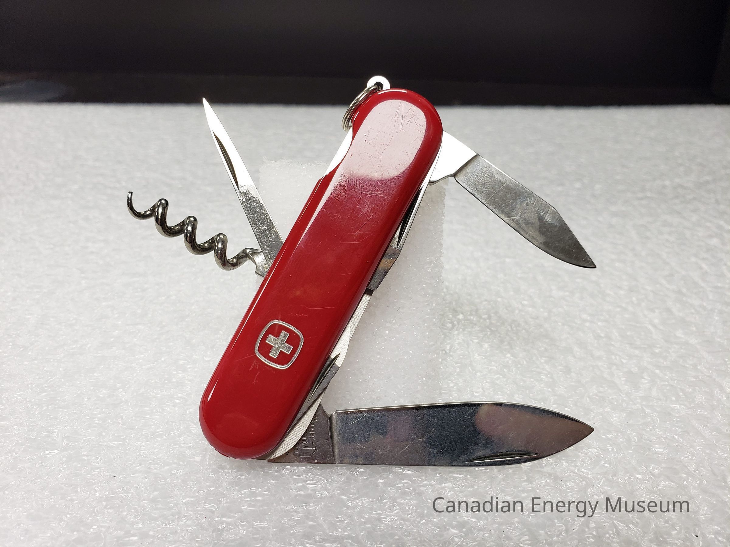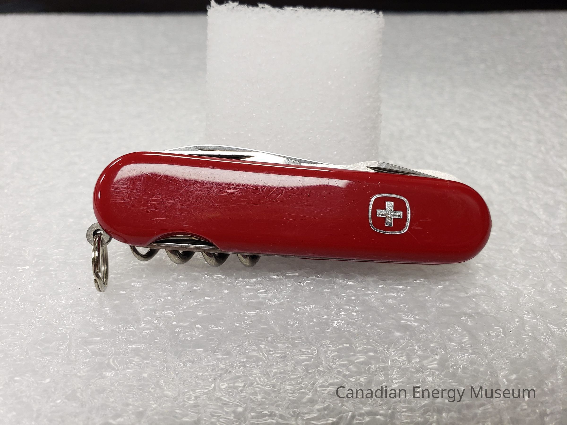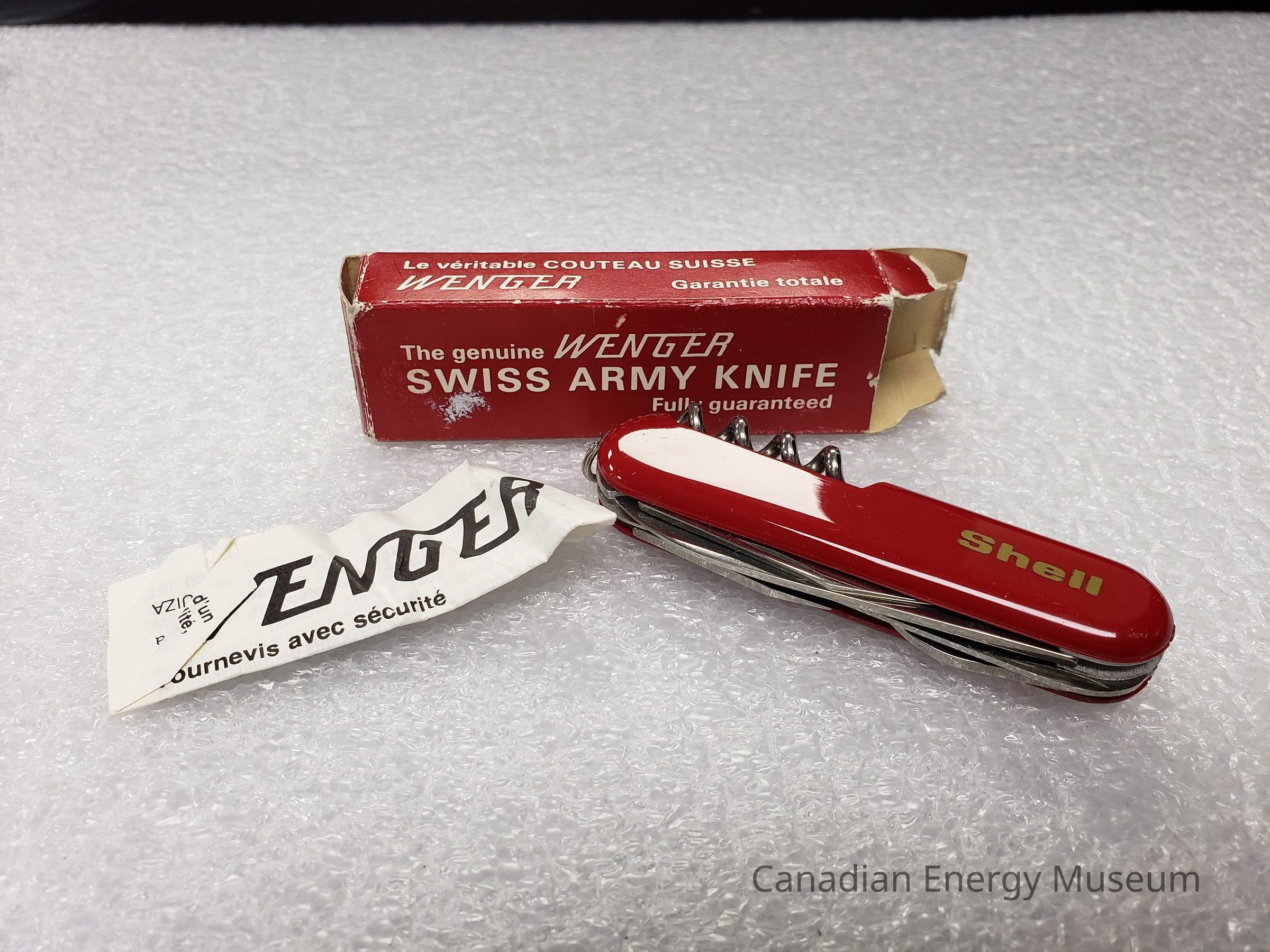 Pocket Knife, Knife, Blade, Shell Oil, Wenger Swiss Army Knife, Tool, Plastic, Metal, Red, Silver, Corkscrew, Bottle Opener, Screwdriver, Box, Packaging, Promotional ItemDescription