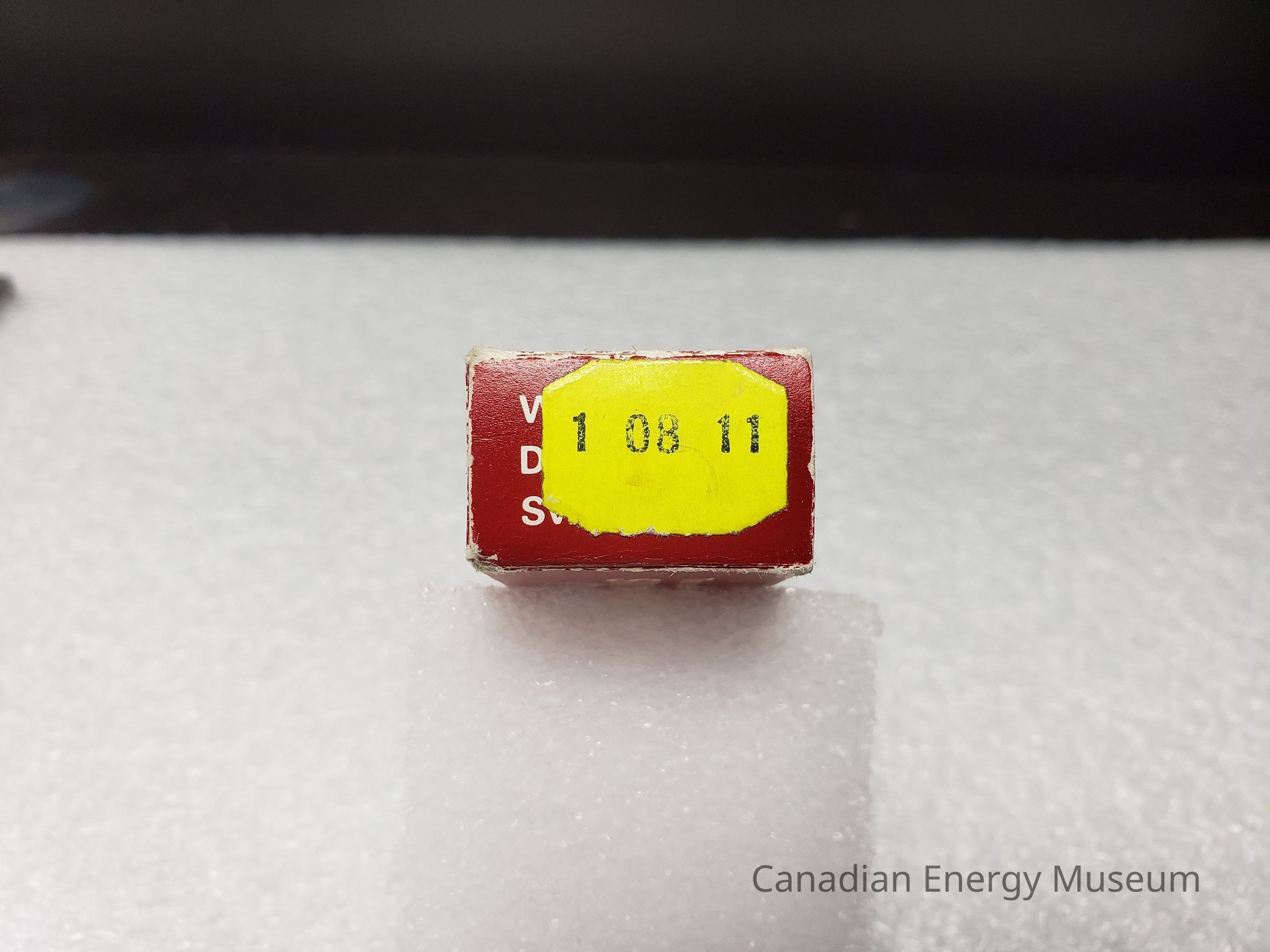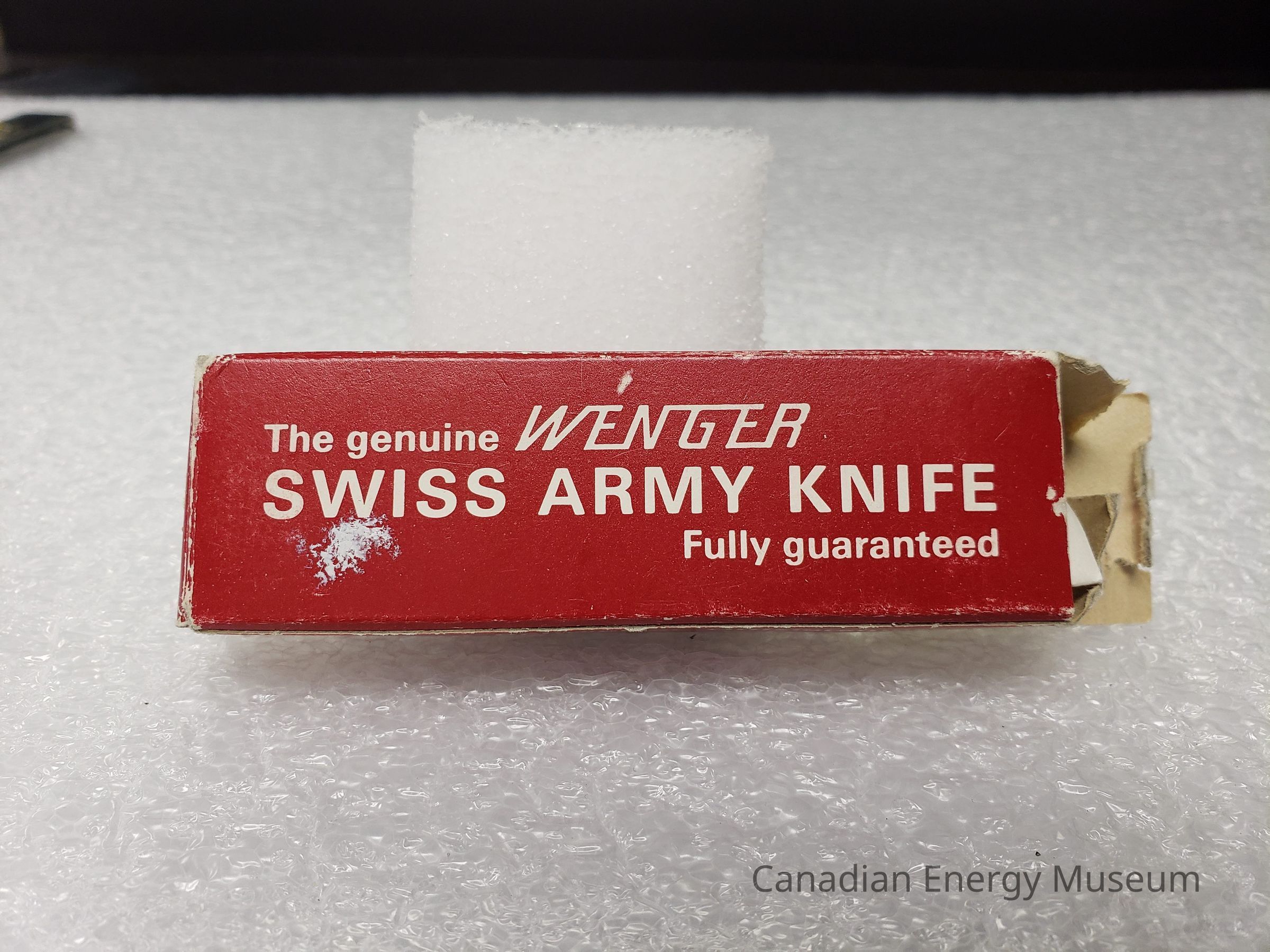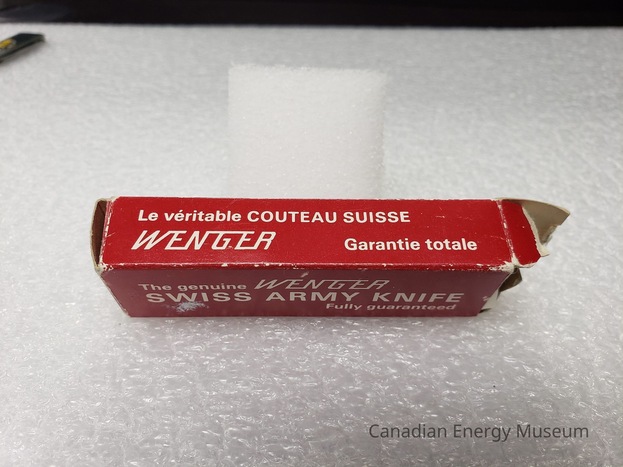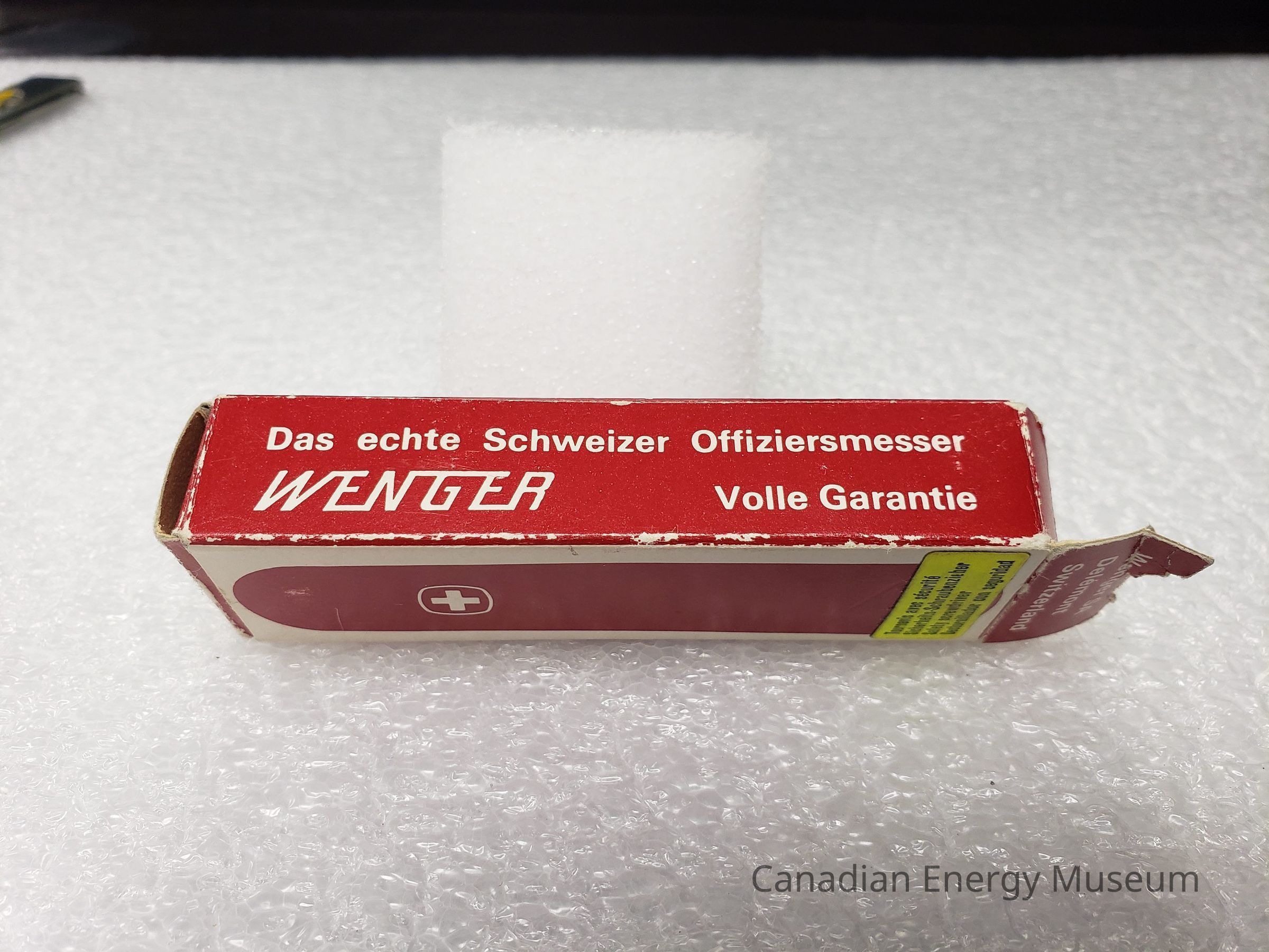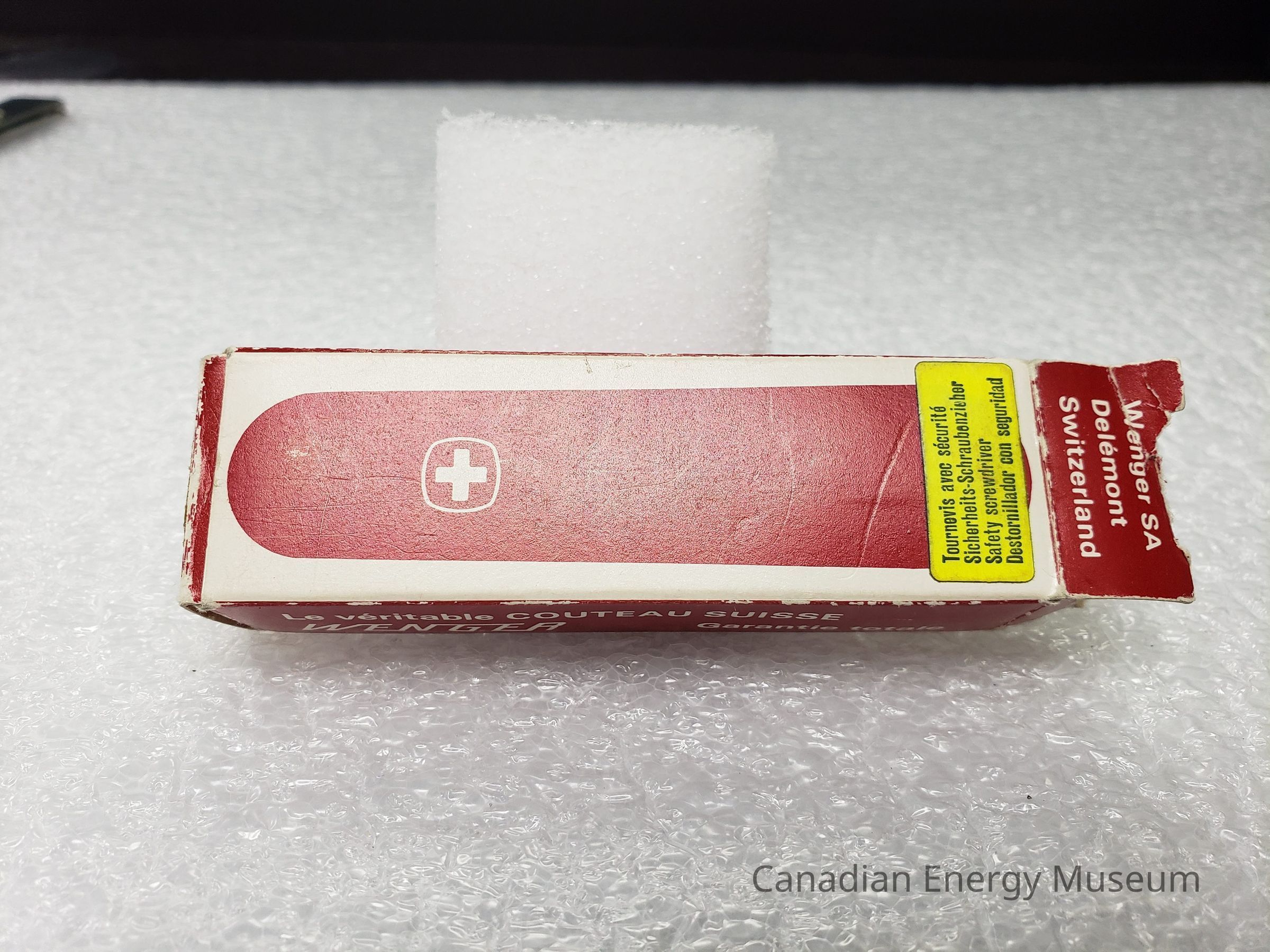 Packaging Box: Card box, with white and red print. Red body with white text predominantly. Front: "The genuine WENGER SWISS ARMY KNIFE; Fully guaranteed". Side A: "Das echte Schweizer Offiziermesser; WENGER; Volle Garantie". Side B: "Le véritable COUTEAU SUISSE; WENGER; Garantie totale". Back: Flat color illustration of the pocket knife cover with logo, and a yellow sticker identifying it as a 'Safety Screwdriver'. Top Flap: "Wenger SA Delémont Switzerland". Bottom Flap: Yellow sticker with typewritten numbers "1 08 11" covering the same print as the top flap.Collection