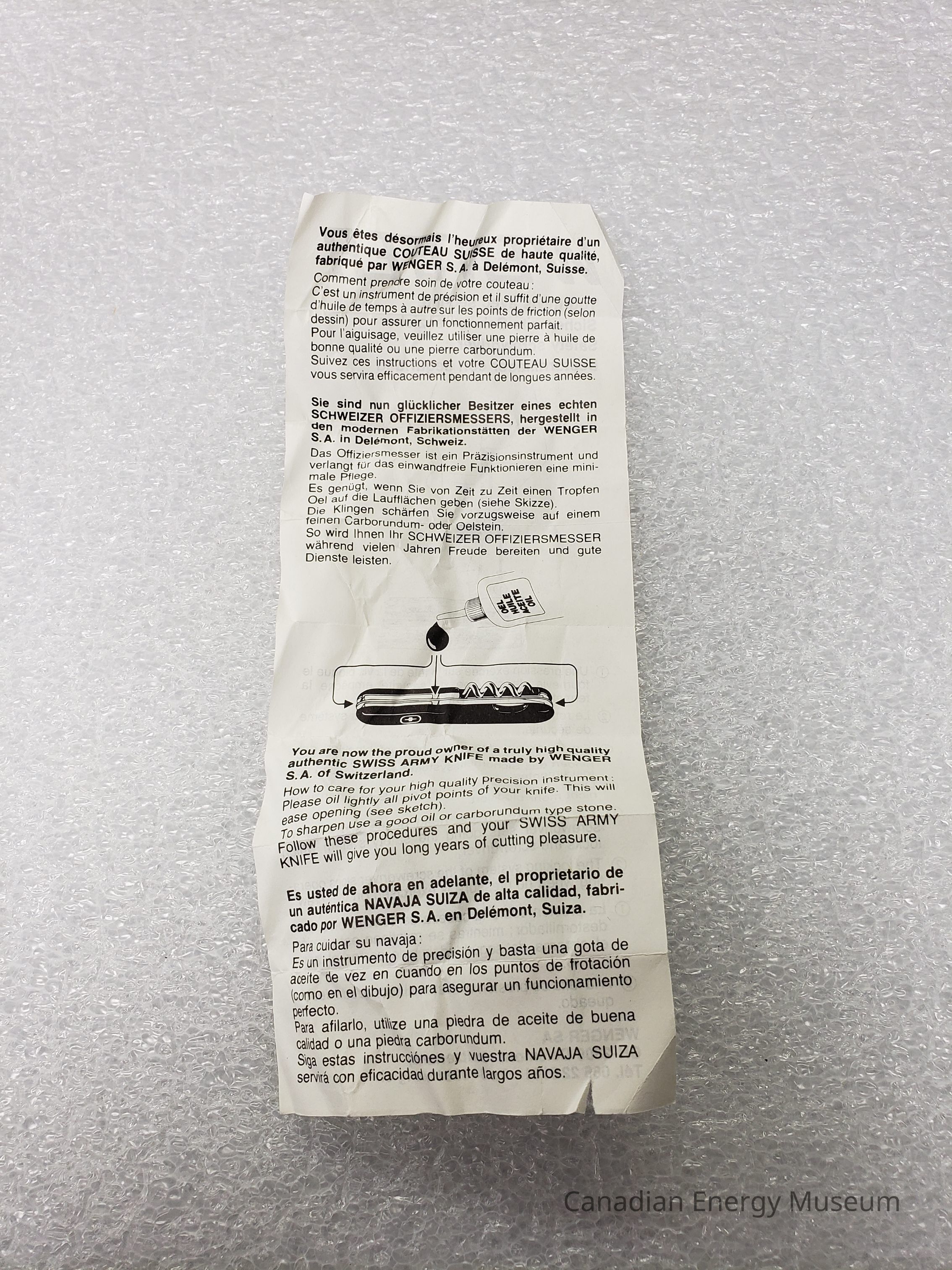 The instructional leaflet is heavily creased from storage folding and unintentional folding when being taken and out, and coming in contact with the pocket knife.