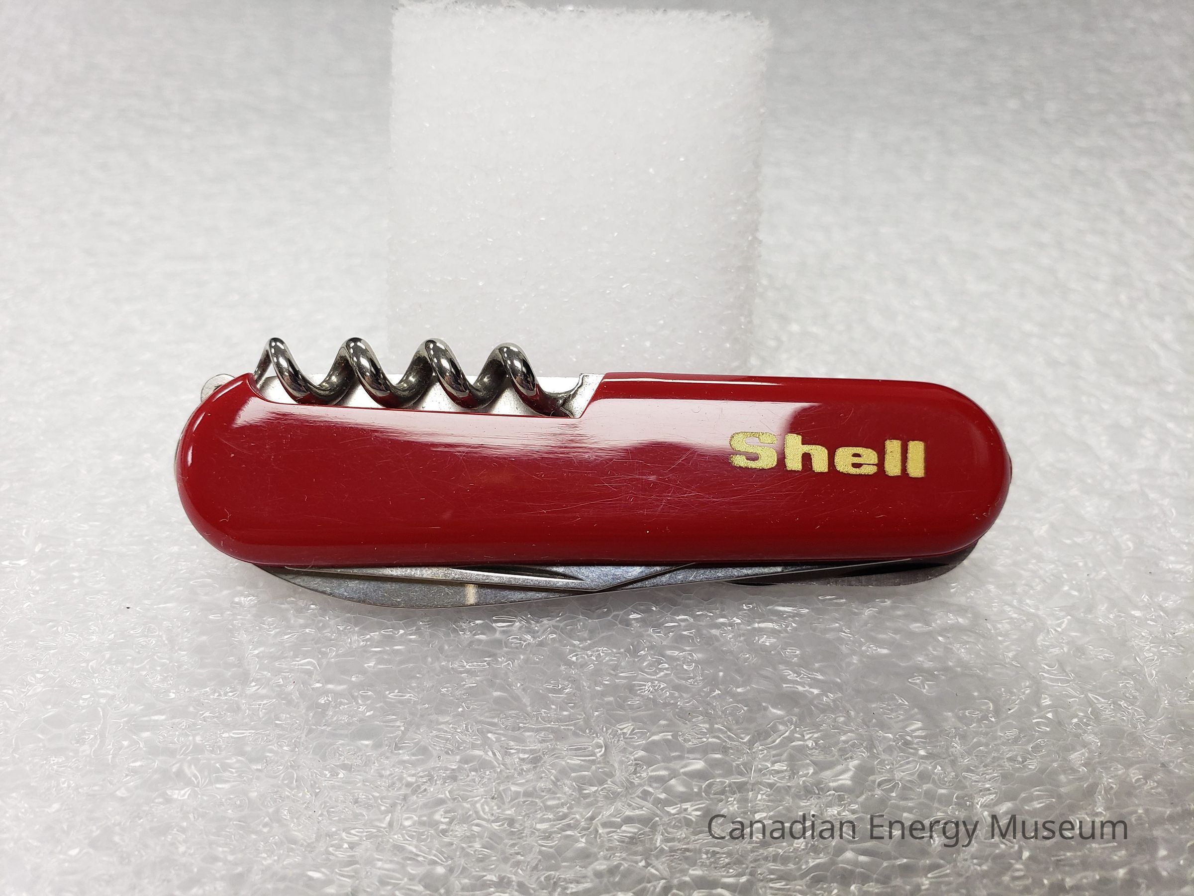 Pocket Knife Features: A Wenger brand Swiss army knife, with a red plastic body and a silver imprint of the Wenger cross logo on the back. On the front is printed in gold print is "Shell" to the right. To the right is a loop with a small split ring.