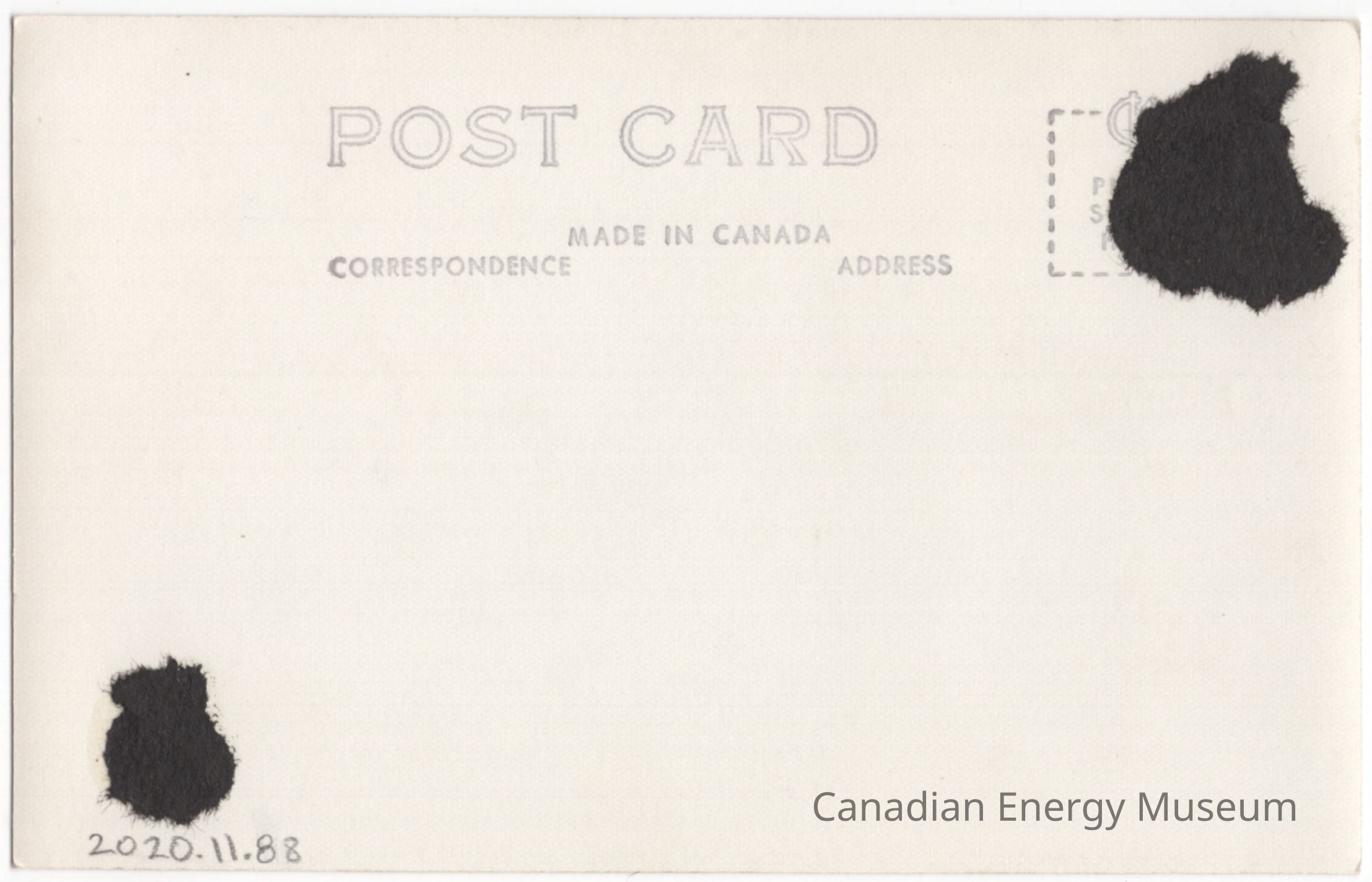 Postcard featuring a photograph in black and whiter, of the business sector of the town of Devon, Alberta.