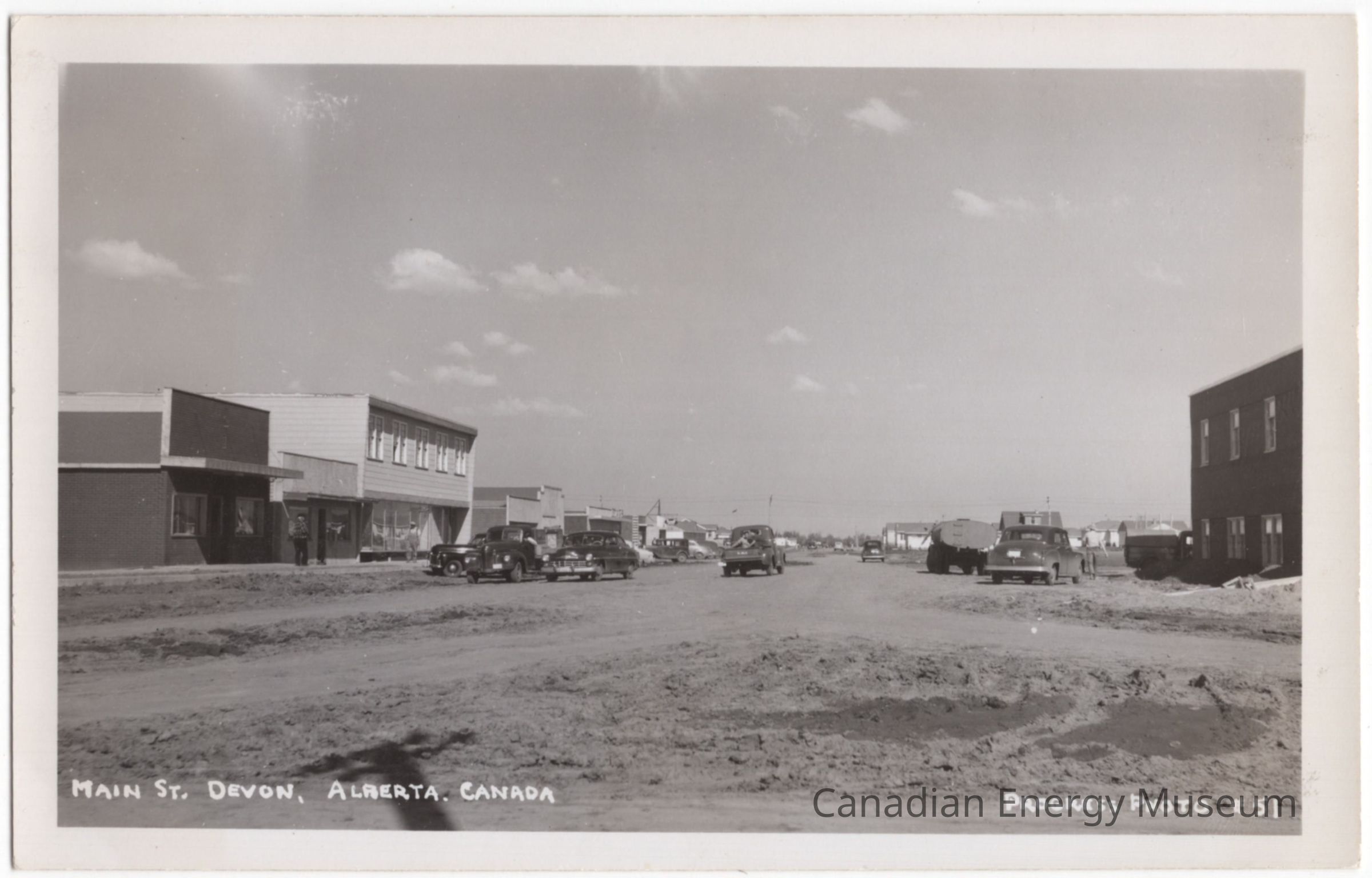Photograph Description: A progress photographs of the constructions of the Devon Main Street/business sector. Visible are the earliest storefronts along the left side and a two-storey building on the right. Along the road are parked and driving an assortment of cars, trucks, and a tanker truck (right). Amongst the buildings are what would become Devon's Royal Bank of Canada branch (white, two-storey building on the left) and the Delair's (sixth storefront down on the right). The roads are visibly muddy and unpaved.