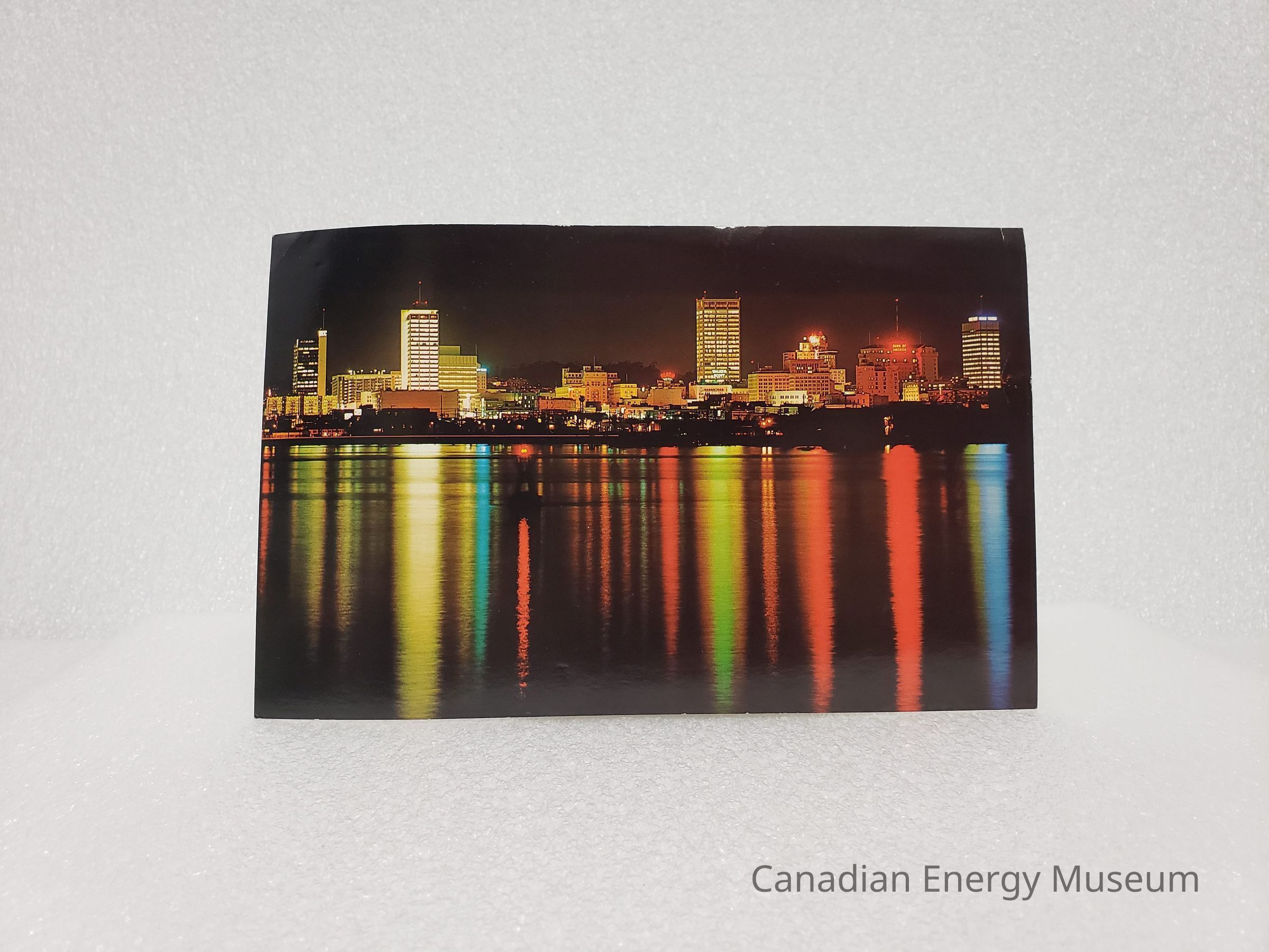 An oversized postcard of San Diego Bay at night, with colourful building lights reflected in the water. Photo likely taken around the late 1960s-1971.