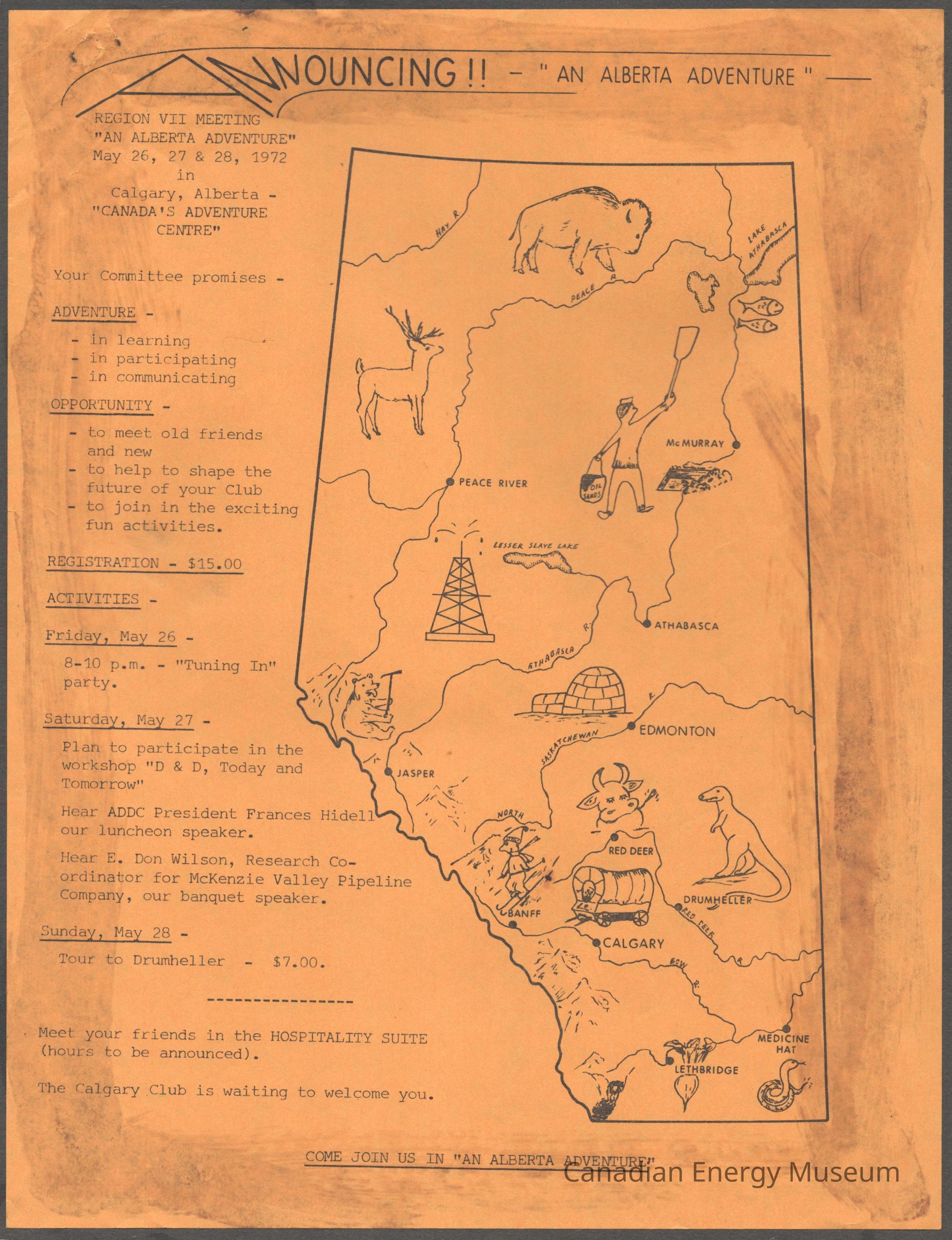 A poster for the ADDC Region VII Meeting, titled "An Alberta Adventure", held 26-28 May 1972, in the Canada's Adventure Centre (Calgary). Poster contains a stylised "ANNOUNCING!!" title banner; a large maps of Alberta with illustrations and notable cities/towns; and informational text types down the left-hand side, including an itinerary.