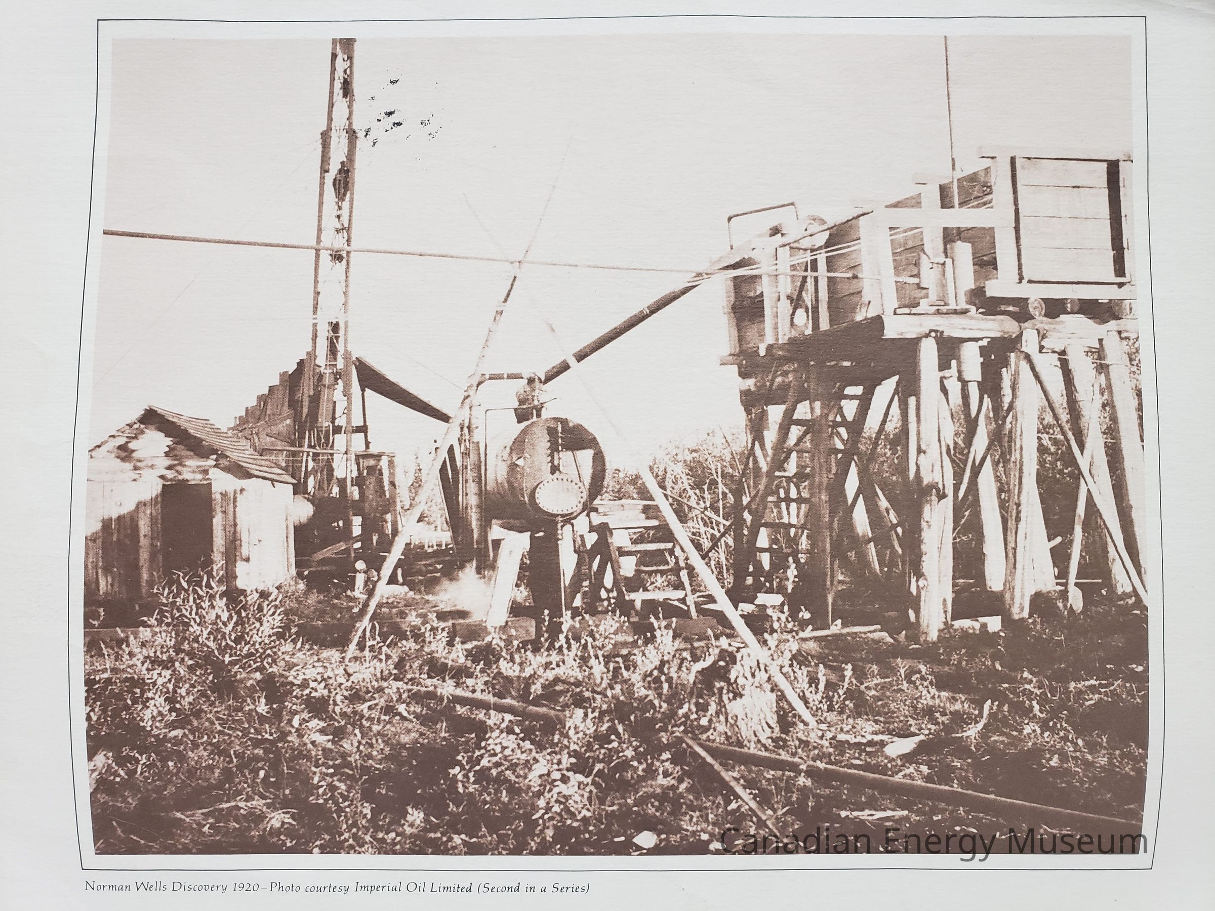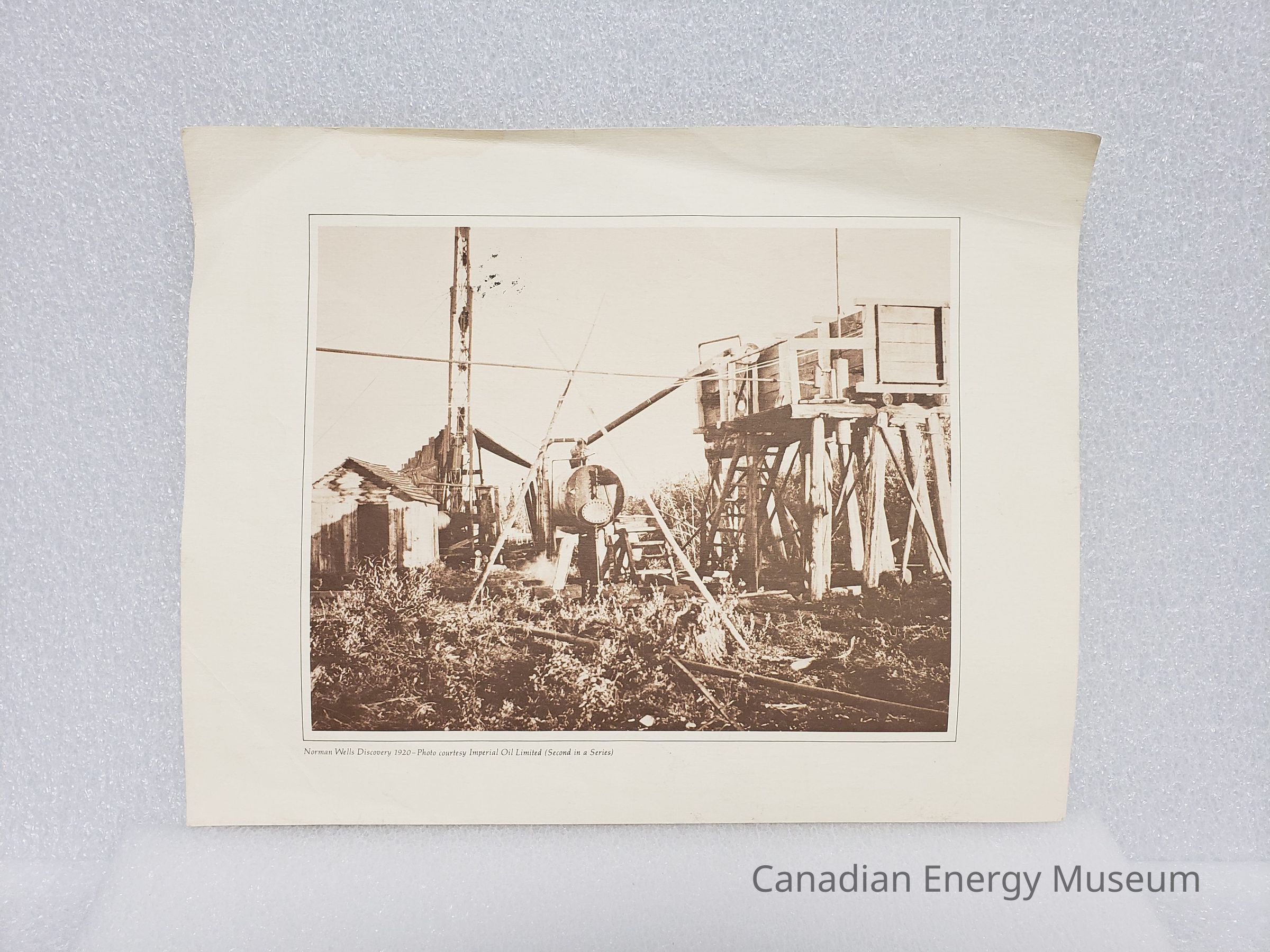 A print (on art paper) of a photograph of the Norman Wells Discovery in 1920. Print produced by Imperial Oil Ltd. and is second in a series.Collection