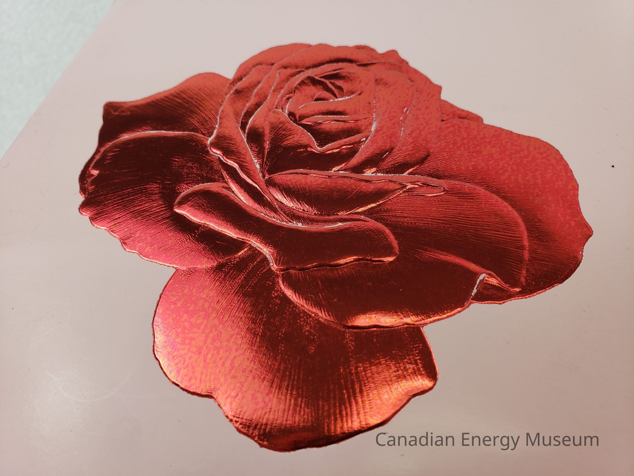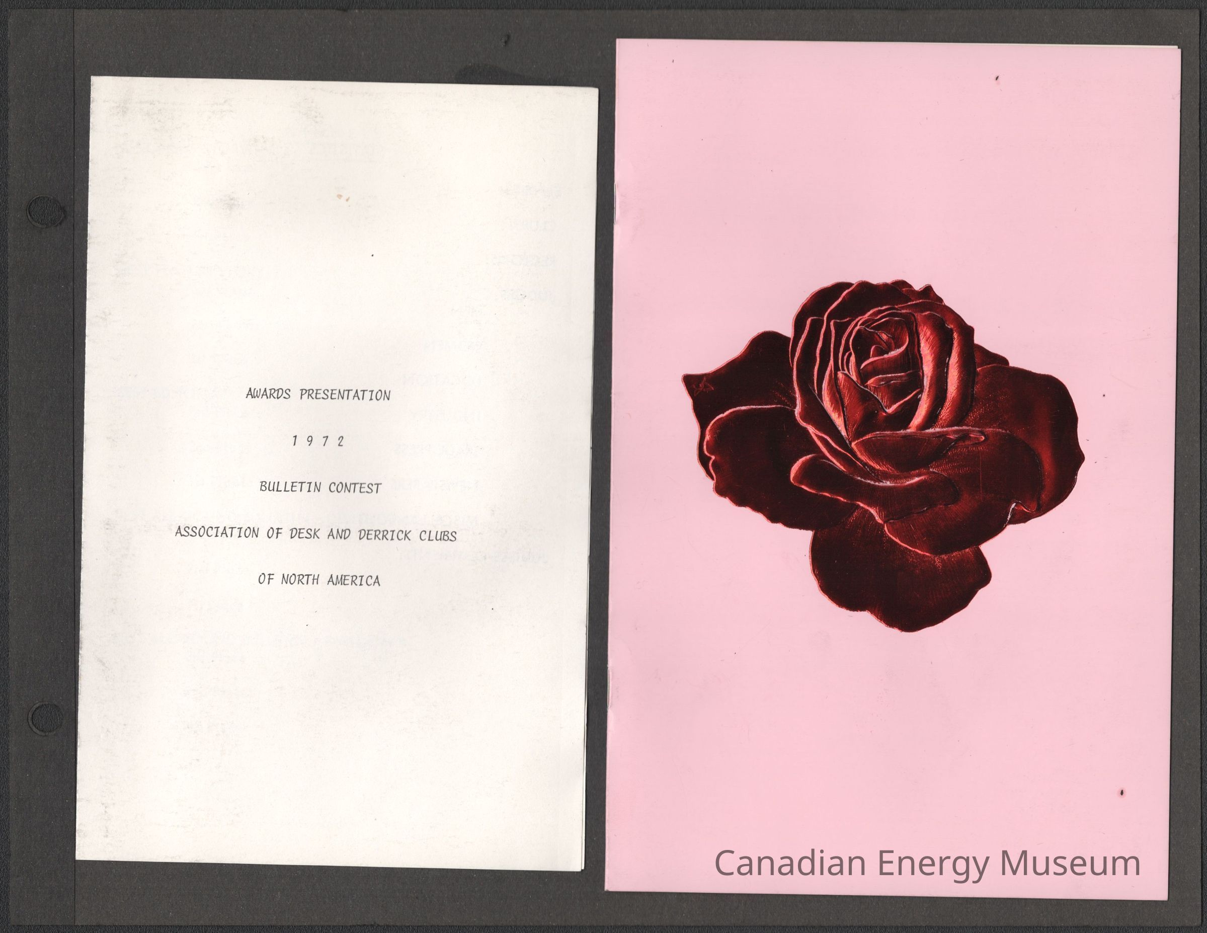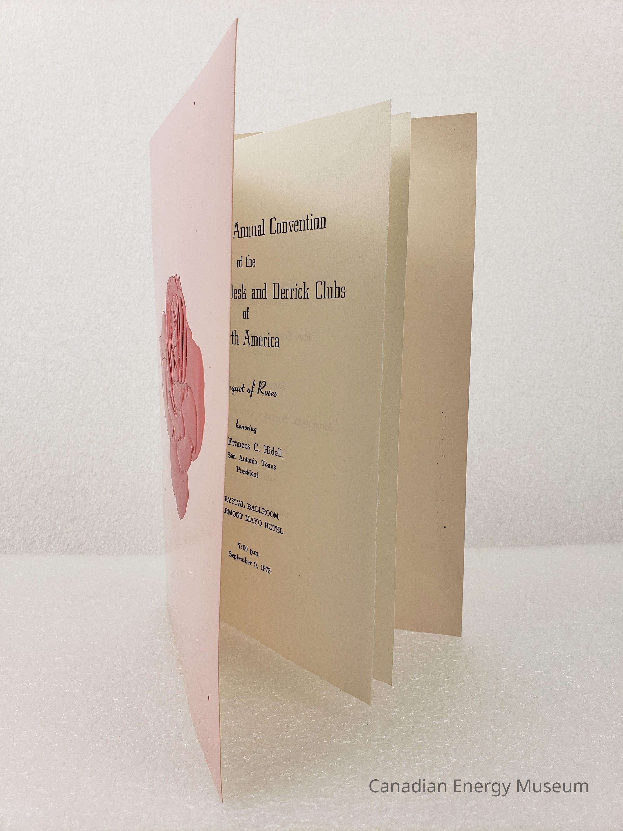 A booklet containing the programme for "Banquet of Roses" at the Crystal ballroom (Fairmont Mayo Hotel), on 7 September 1972; as part of the 1972 Association of Desk and Derrick Clubs Convention. The front cover is pink card with an embossed and metallic red foil covered rose design. On the interior is a bi-folded sheet of paper containing the event details, menu, event programme, and prayer.
