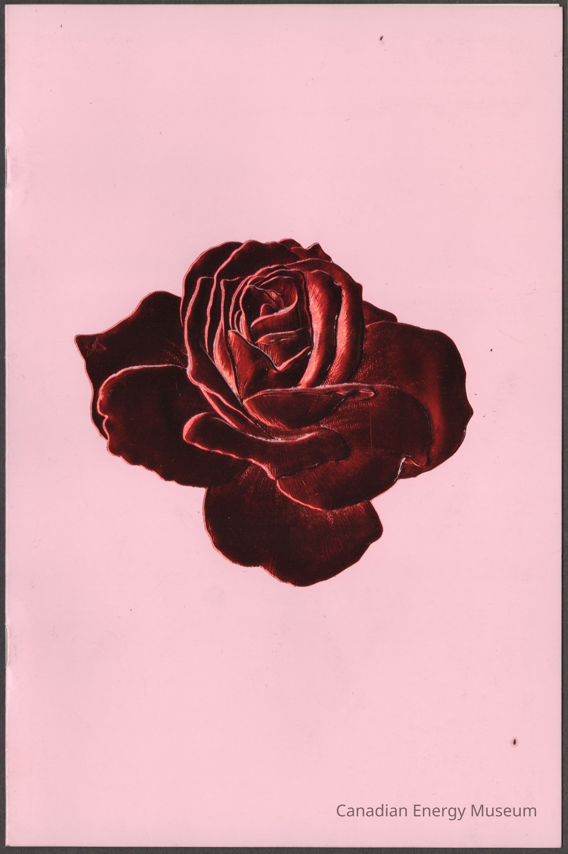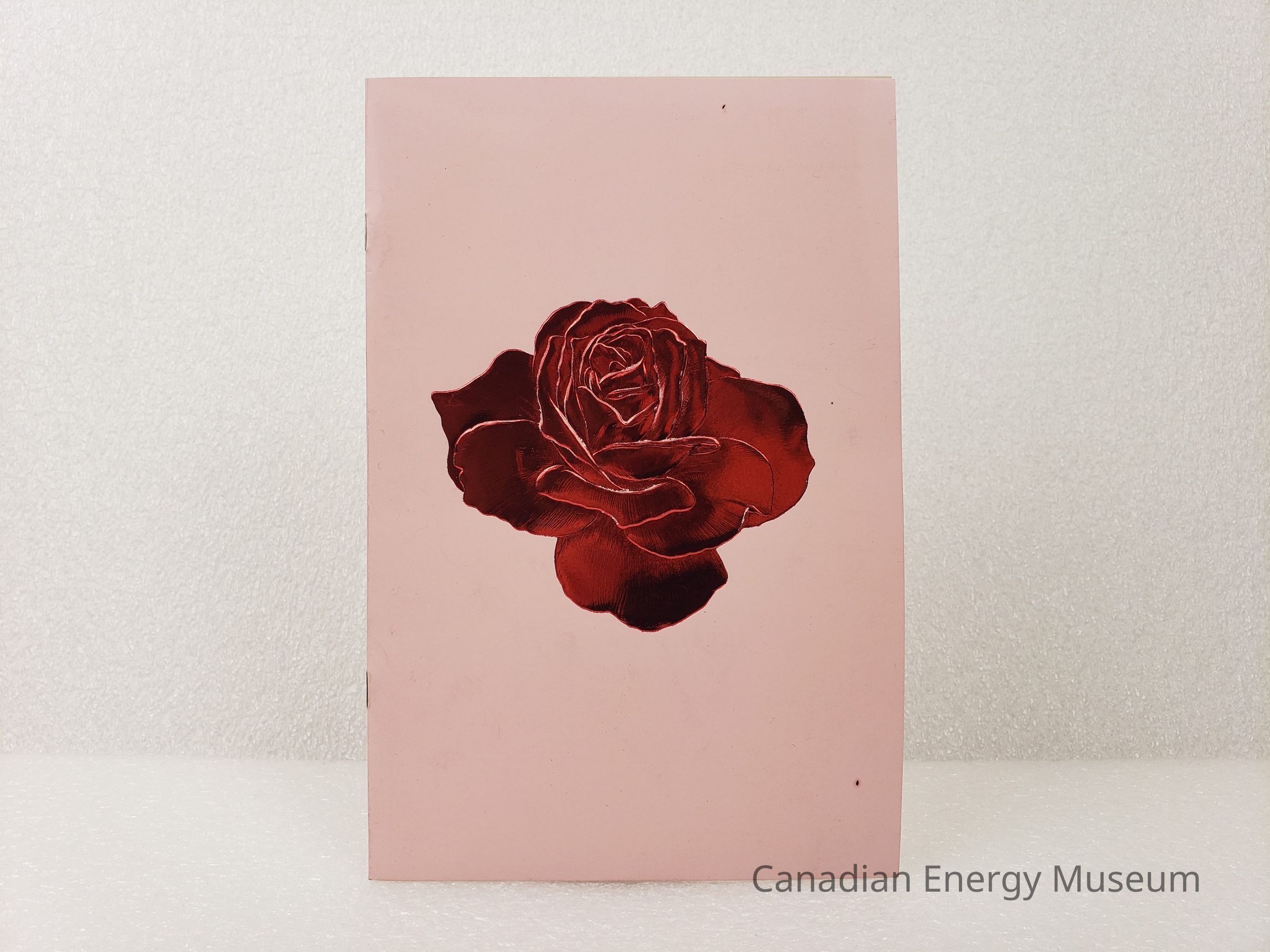 Cover Material: Heavy-weight card stock, glossy pink (exterior) and cream (interior) with red metallic foil over an embossed design.
