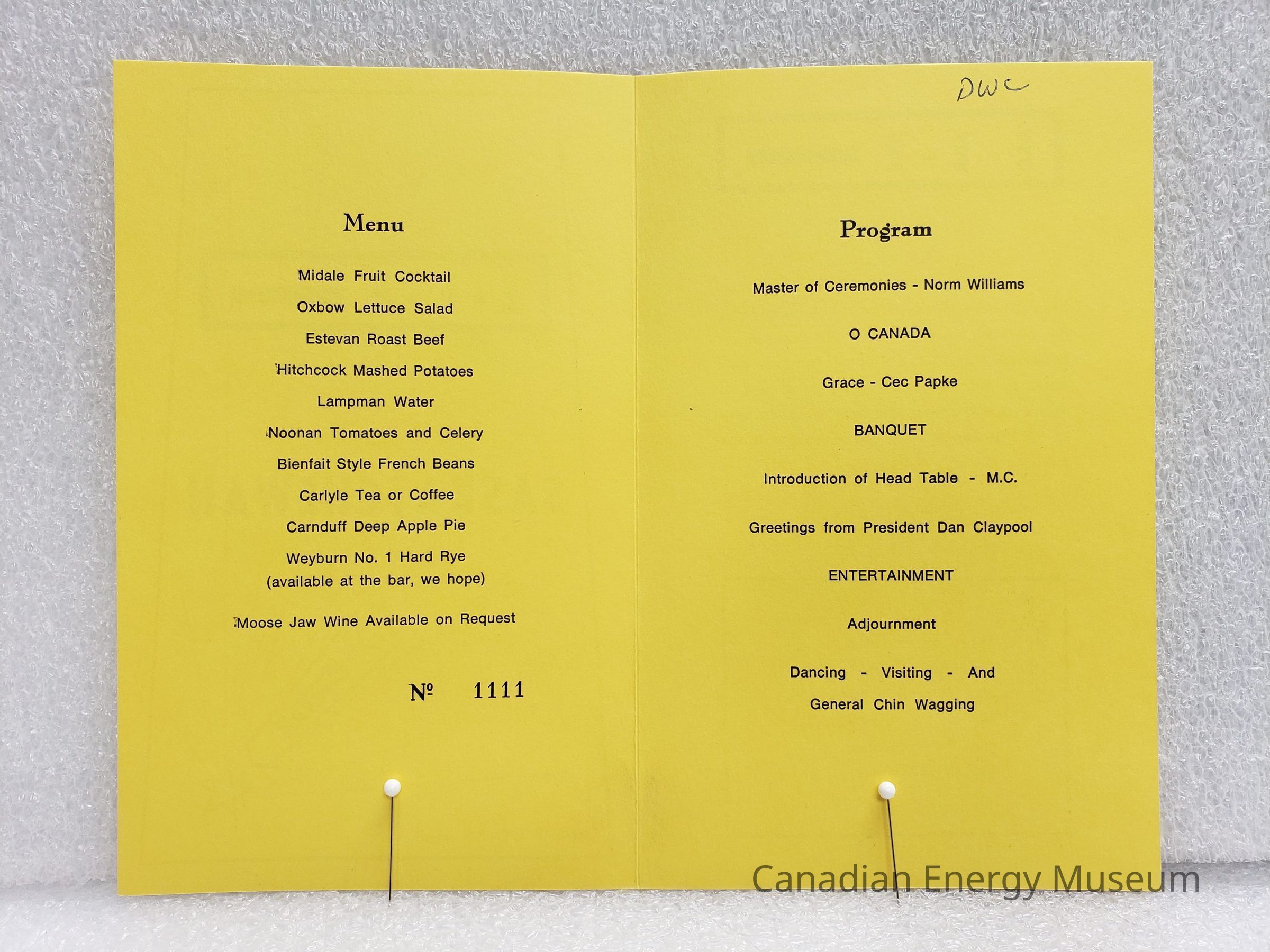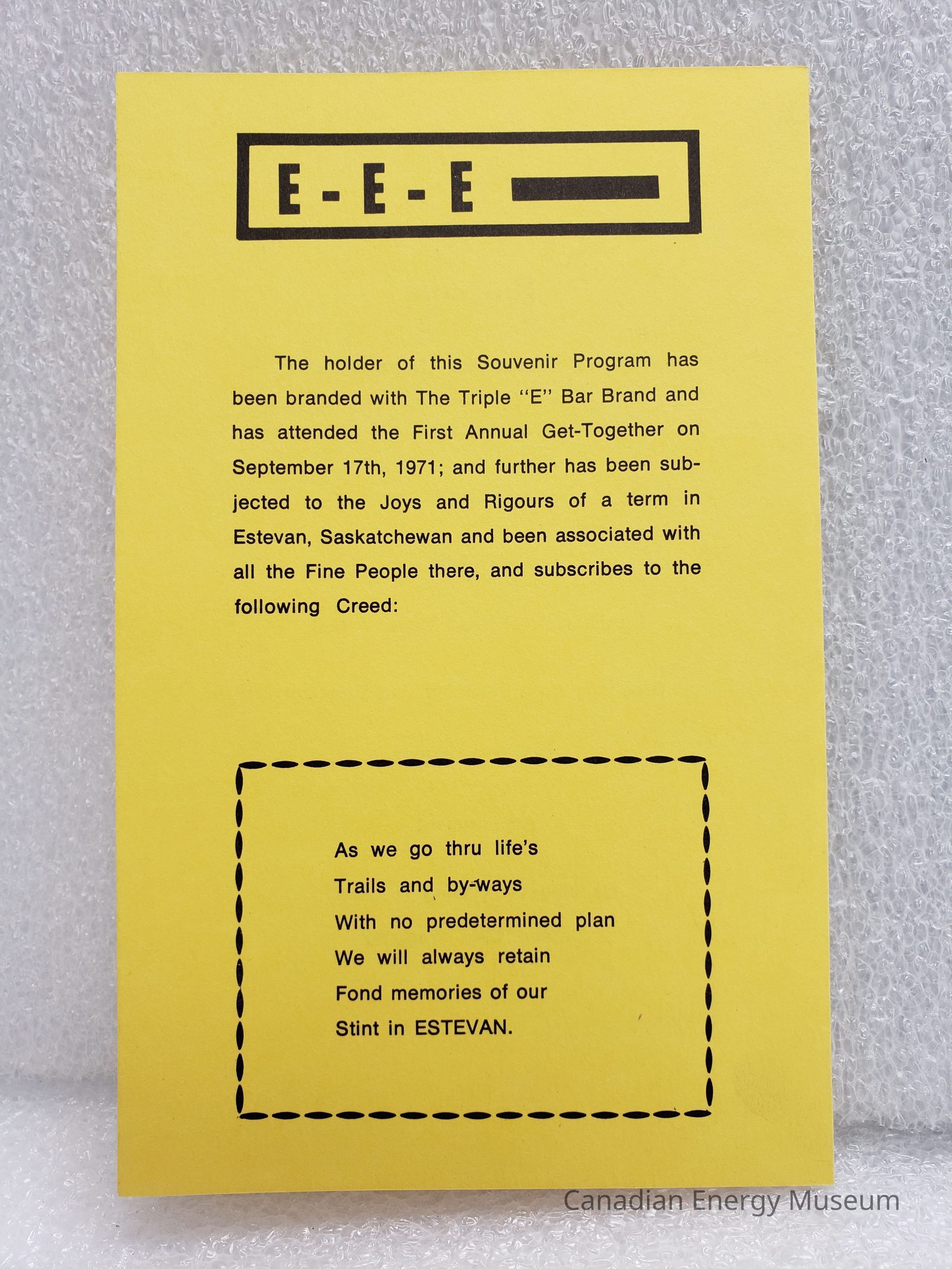A programme for the "First Annual Get-Together" for Triple "E" (E-E-E), in Estevan (Saskatchewan) on 17 September 1971. Yellow card with black print, bi-fold.Collection