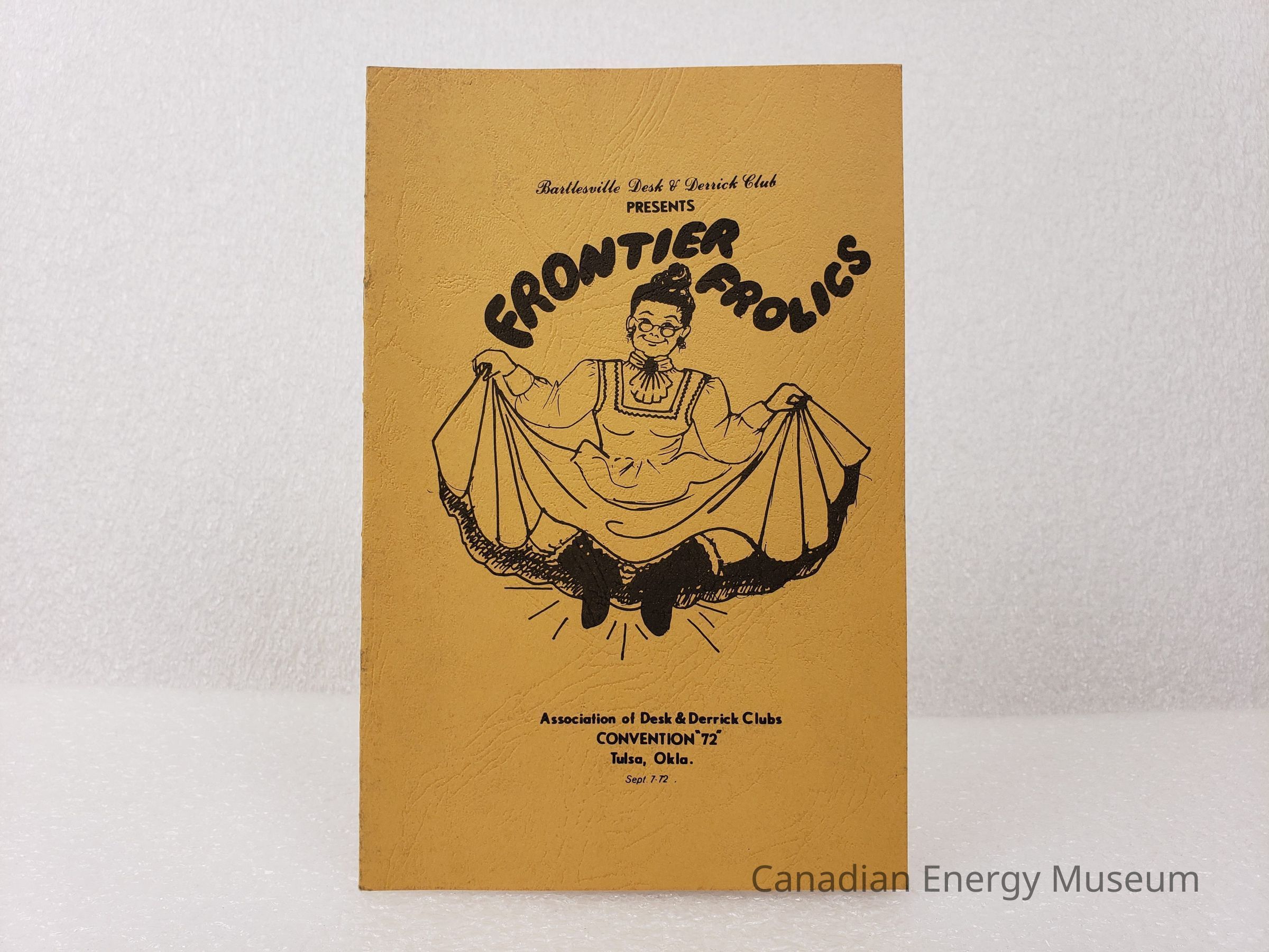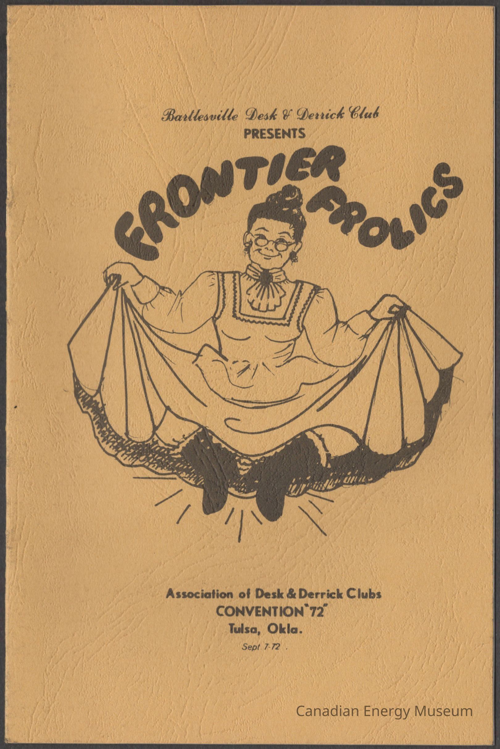 A booklet containing the programme for the "Frontier Frolics" event, held by the Bartlesville Desk and Derrick Club, as part of the Association of Desk and Derrick Clubs Convention, 7 September 1972. The front cover features an illustration of a lady jumping and kicking her heals.