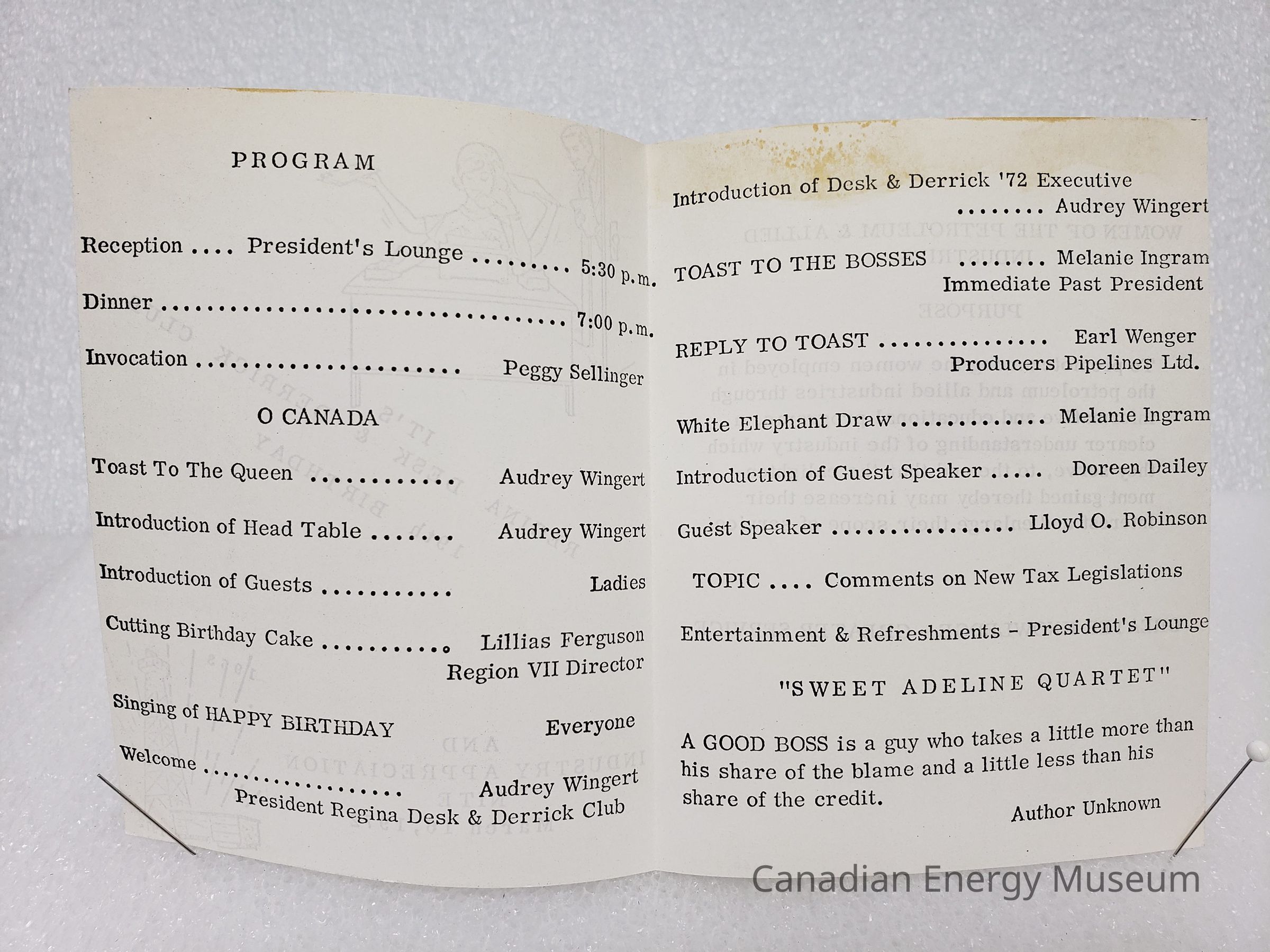 This item is associated with Lillias Ferguson's attendance of the 1972 Regina Desk and Derrick Club's 19th Birthday and Industry Appreciation Nite, 16 March 1972.