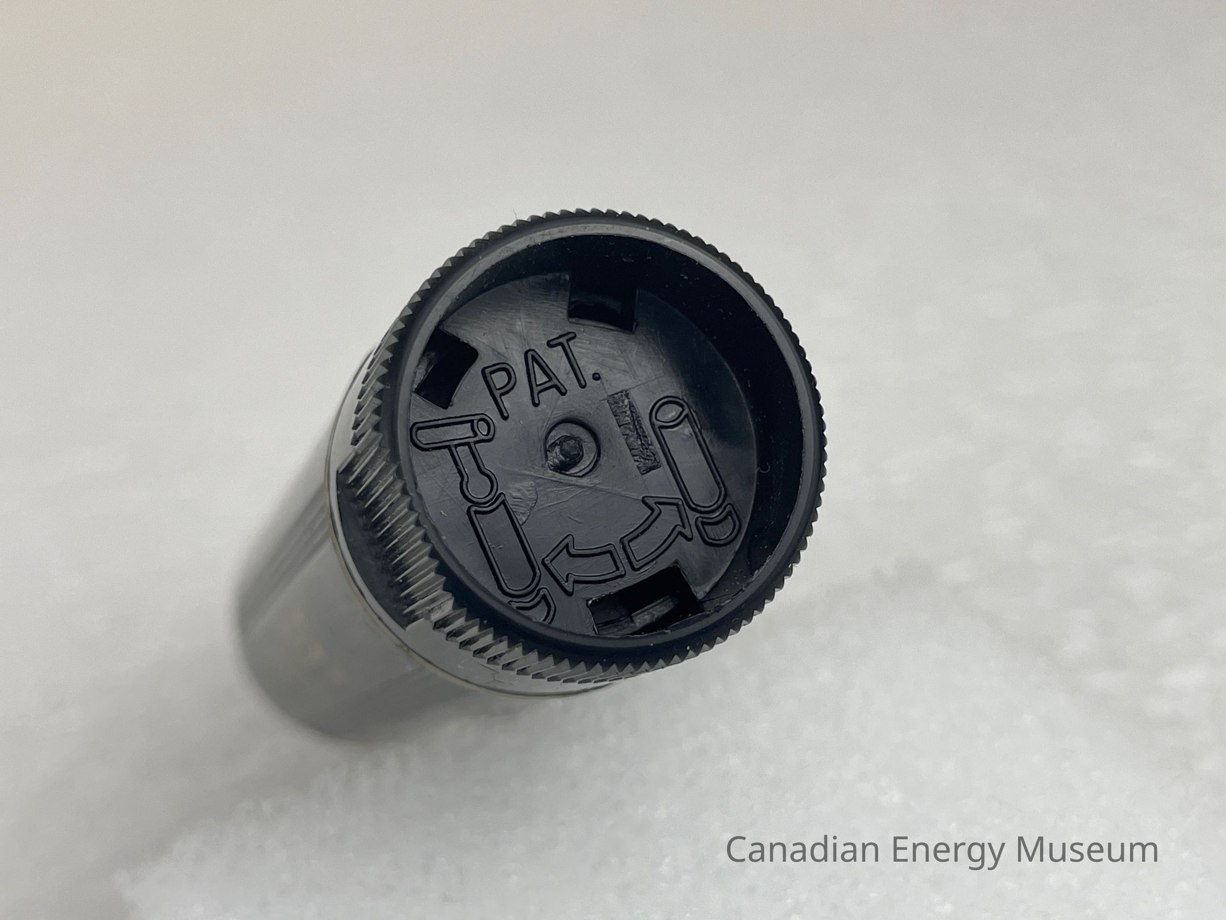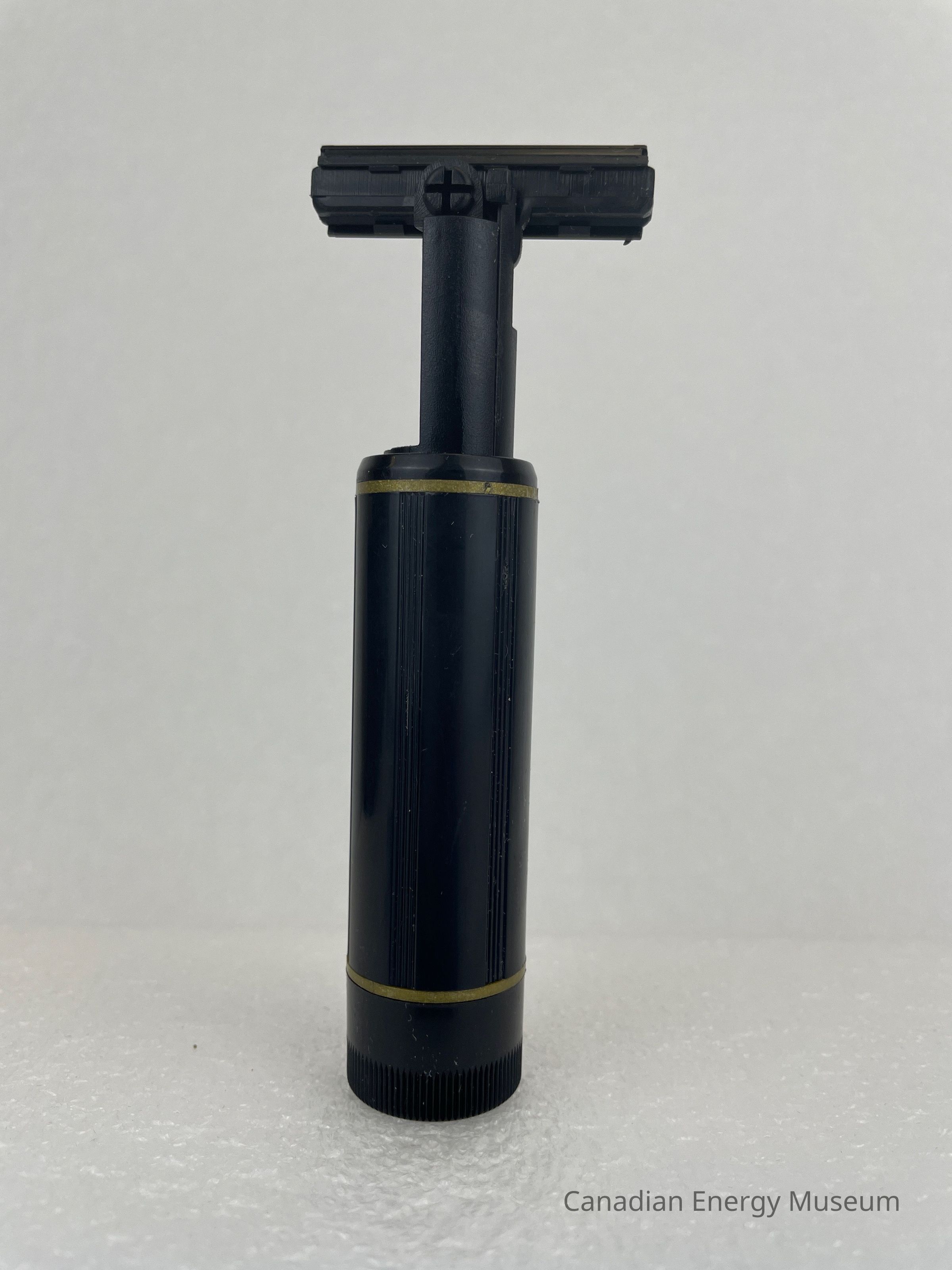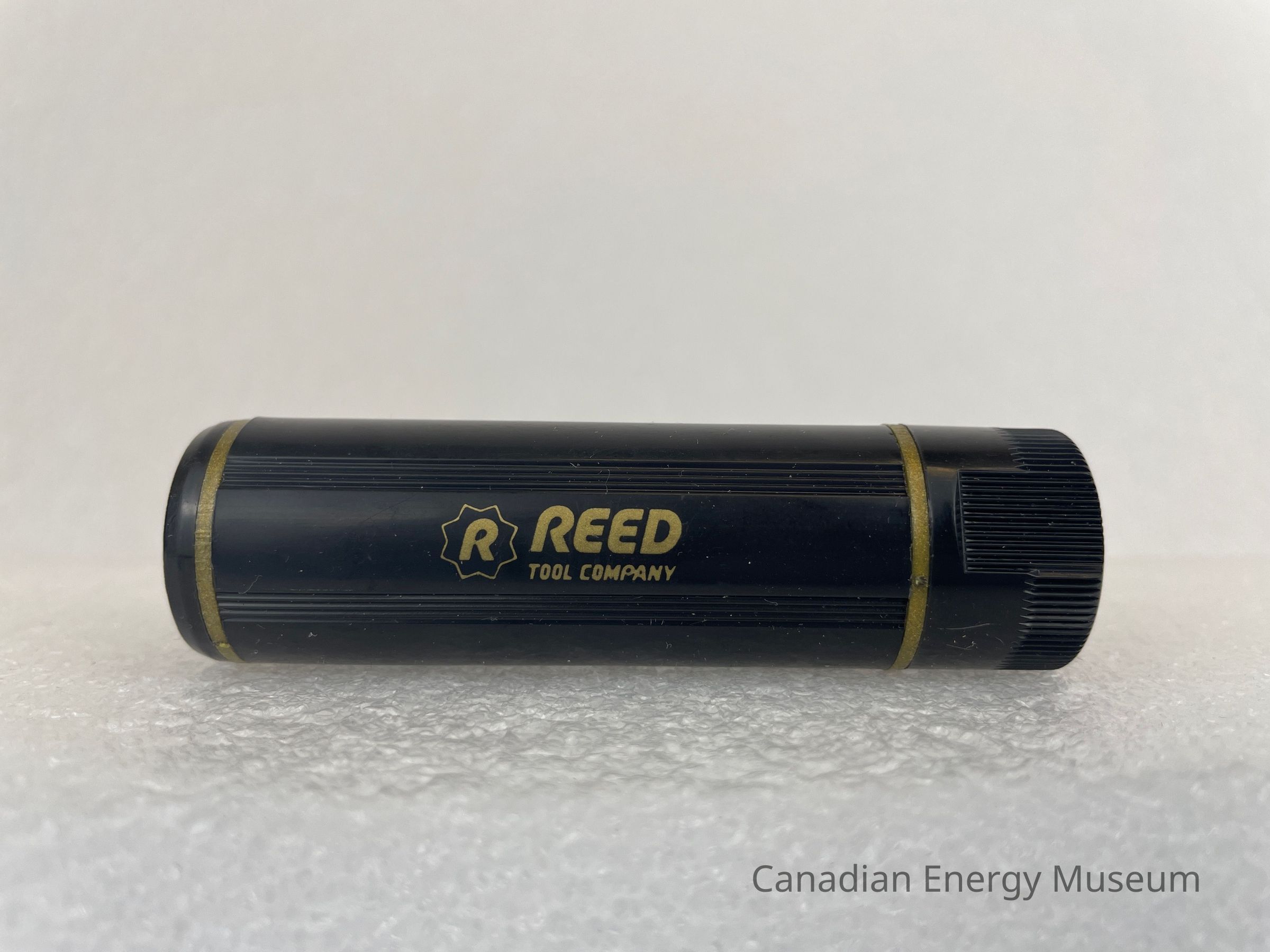 A plastic, black razor is contained in a cylinder. The body of the cylinder is black with two thin gold bands, one placed at the top and one at the bottom. A small, gold logo is placed in the middle of the body with text that reads, "REED TOOL COMPANY", and to the left, a gold "R" is placed in the middle of a starburst outline. Six groups of three grooved lines run vertically along the body of the razor. The bottom of the razor features debossed illustrations of how to twist and open the razor. The razor is black with two metal blades.