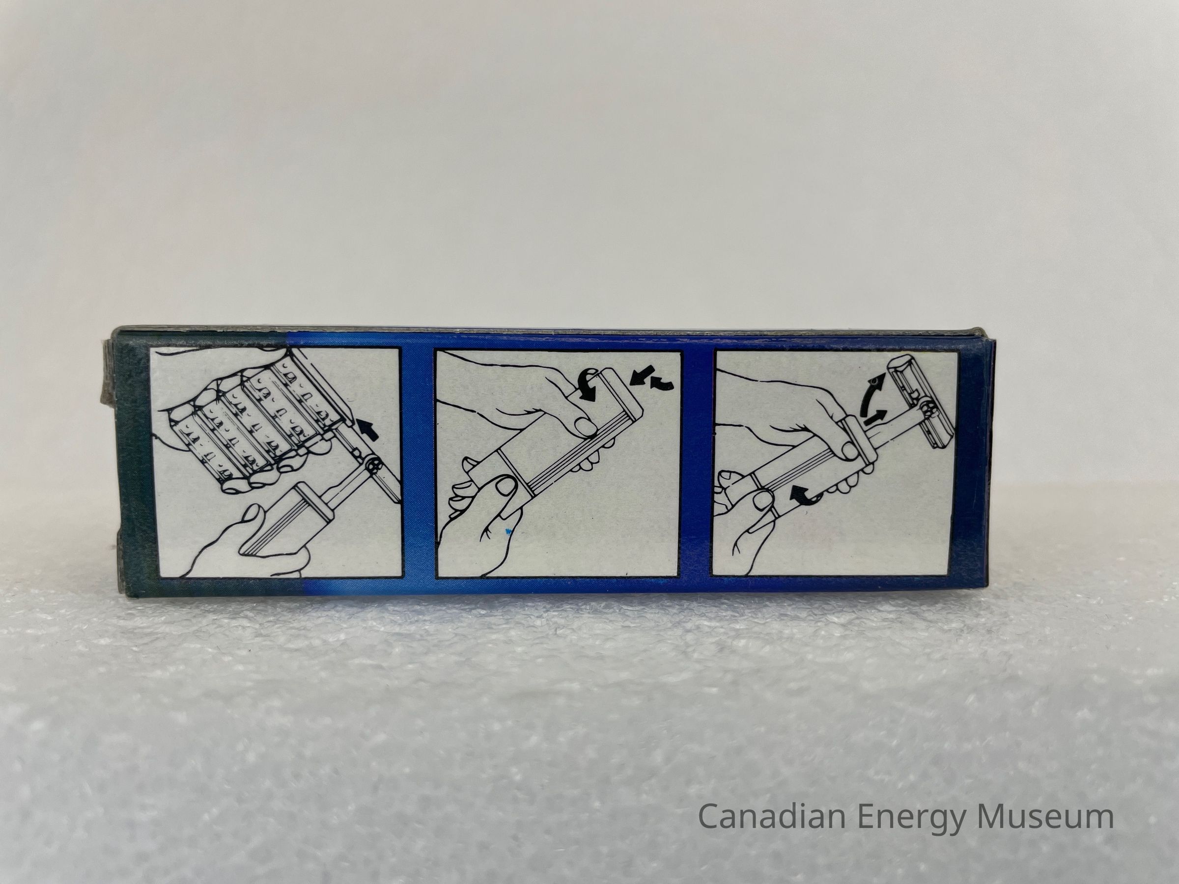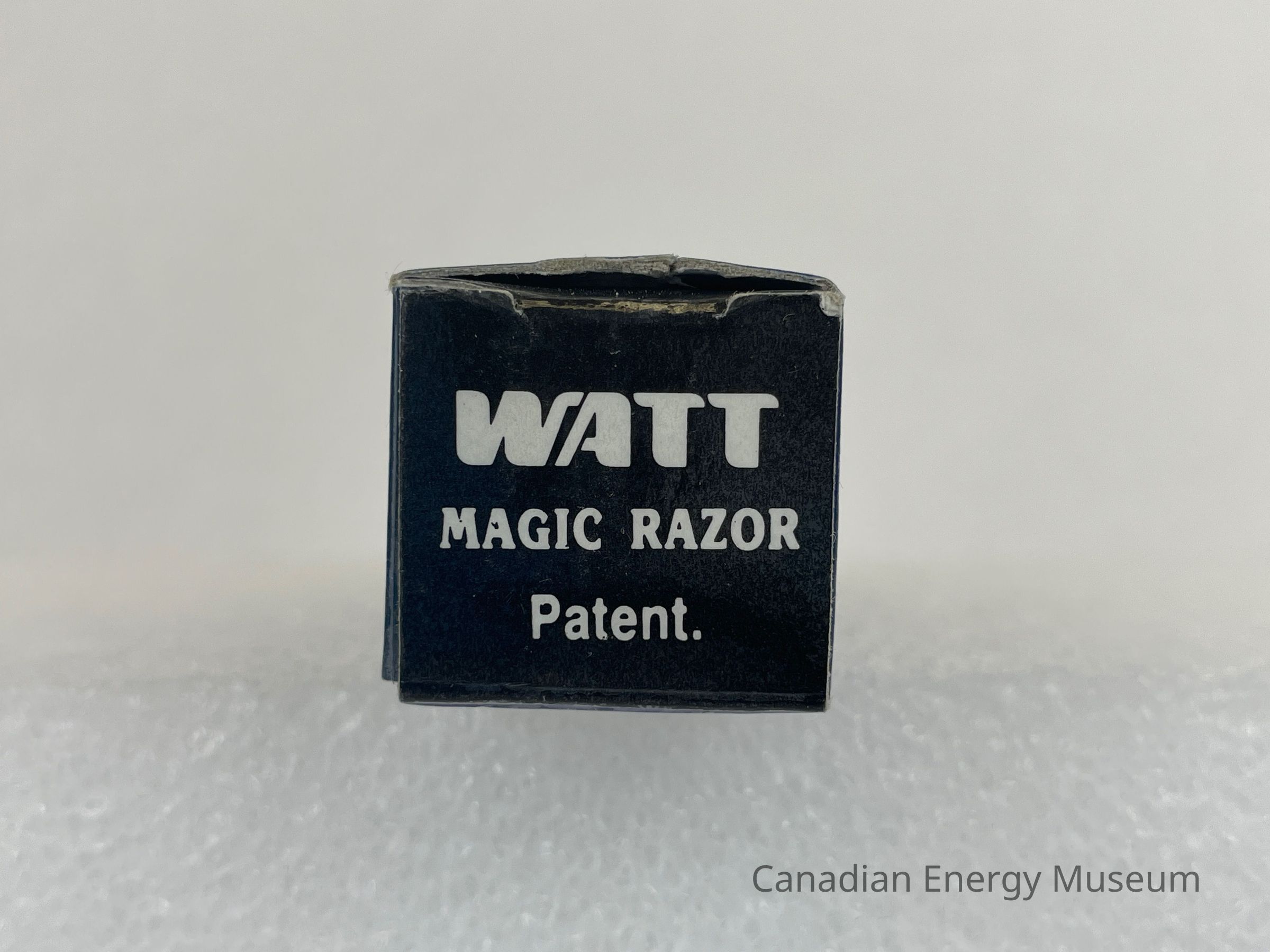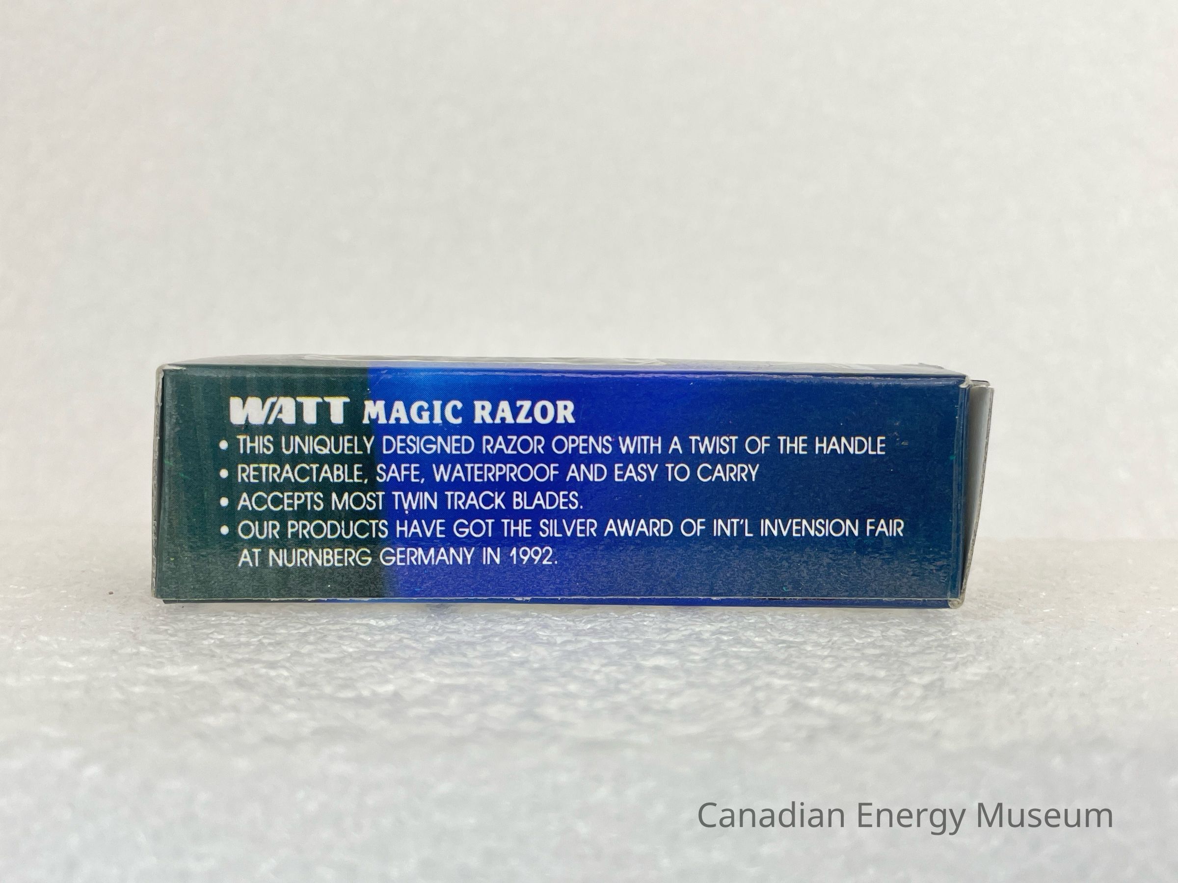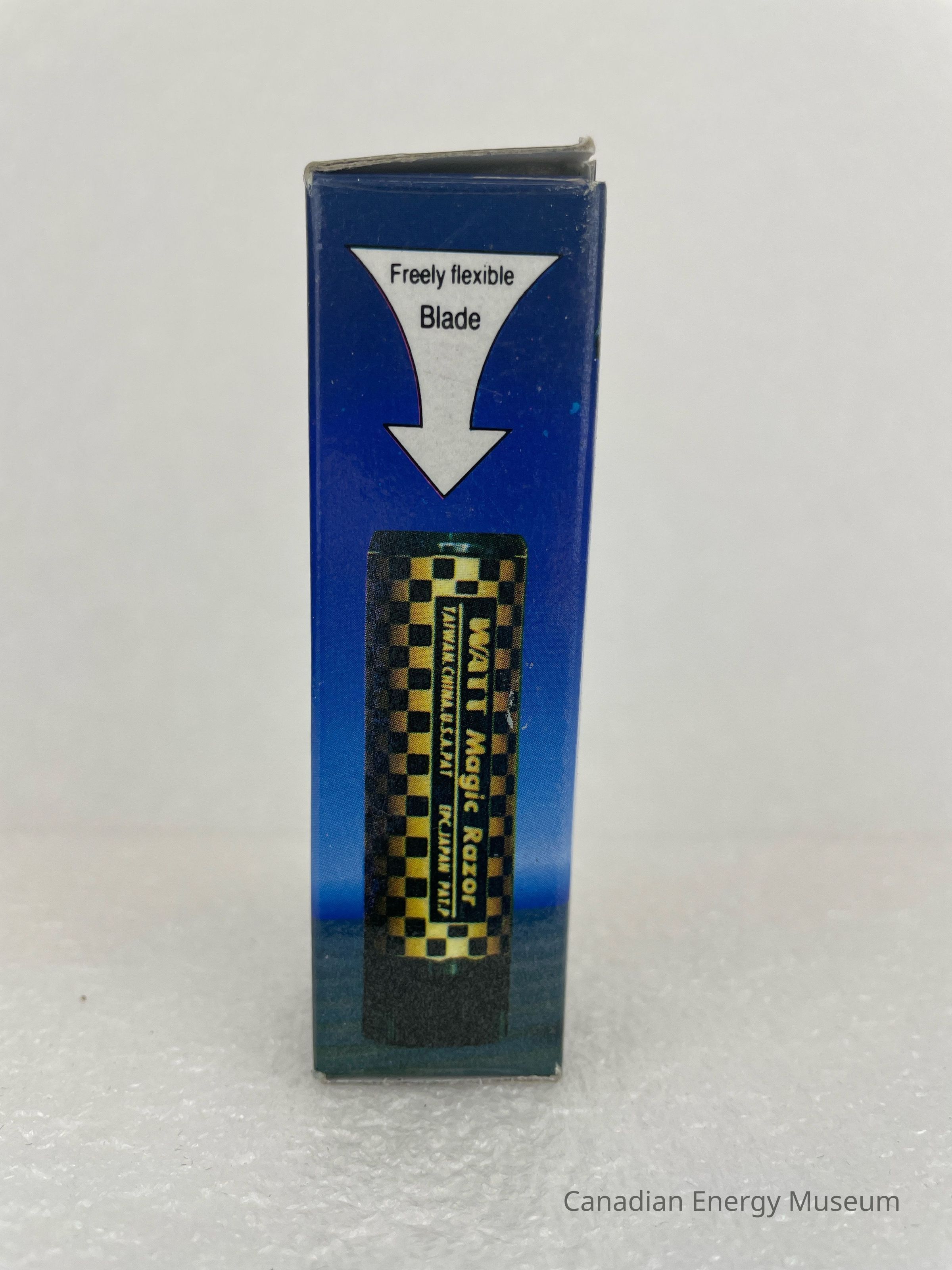 The box is small and made of cardboard with a clear plastic window to see the razor packaged inside and a blue ombre background. The face with the clear plastic displays an image of the razor opened. The face to the left is an image of a black and yellow checkered version of the razor with a white arrow above it pointing down with black text reading, "Freely flexible Blade". The back face of the box displays three white squares with black illustrations of instructions on how to open the razor and attach the blades. The last face of the box displays white text with bullet points discussing the product with the headline, "WATT MAGIC RAZOR". This same text is placed on the top flap of the box. The bottom flap displays small white text with patent numbers.Collection