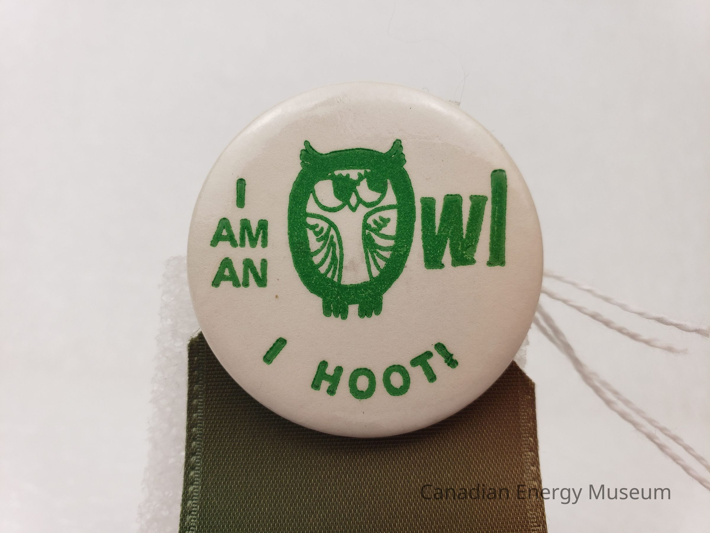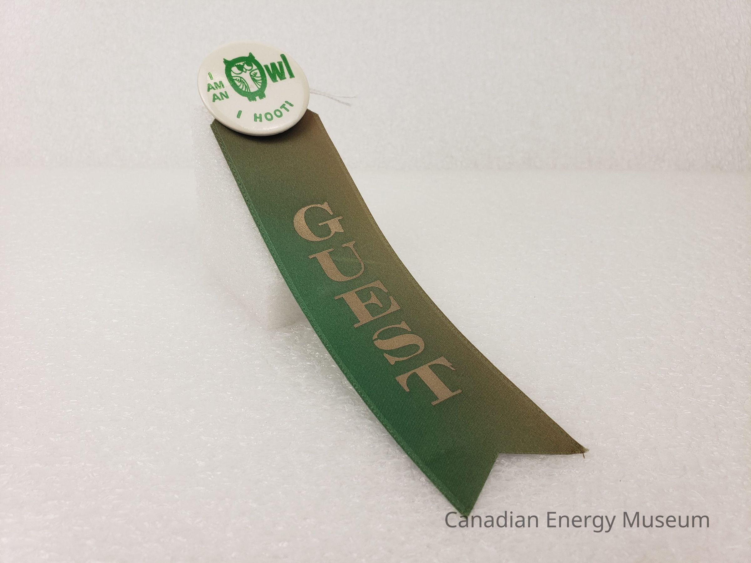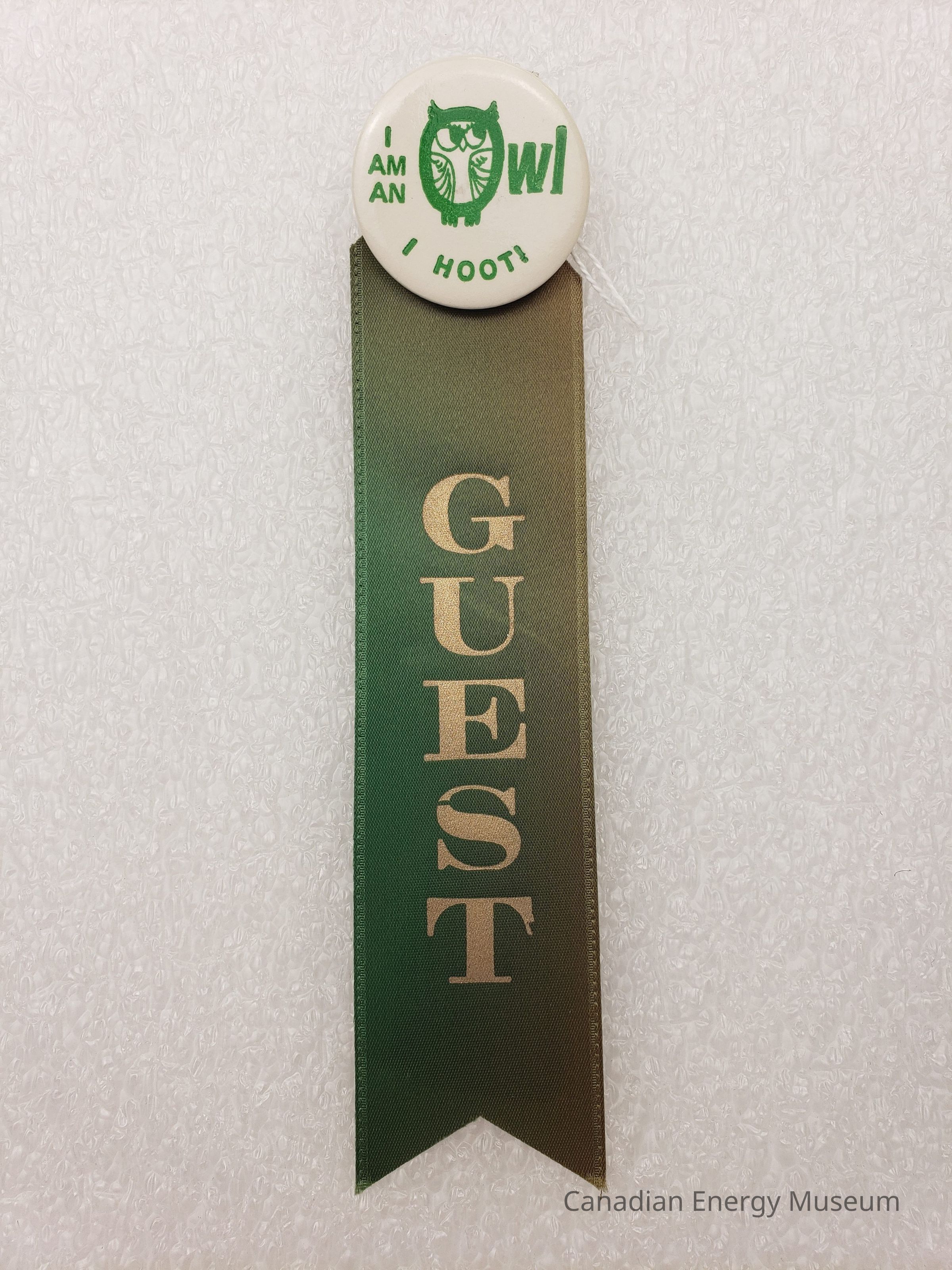 [Ribbon] Guest /"I Am An Owl", Button Pin with Ribbon, Green Gold White, c.1972Entry/Object ID