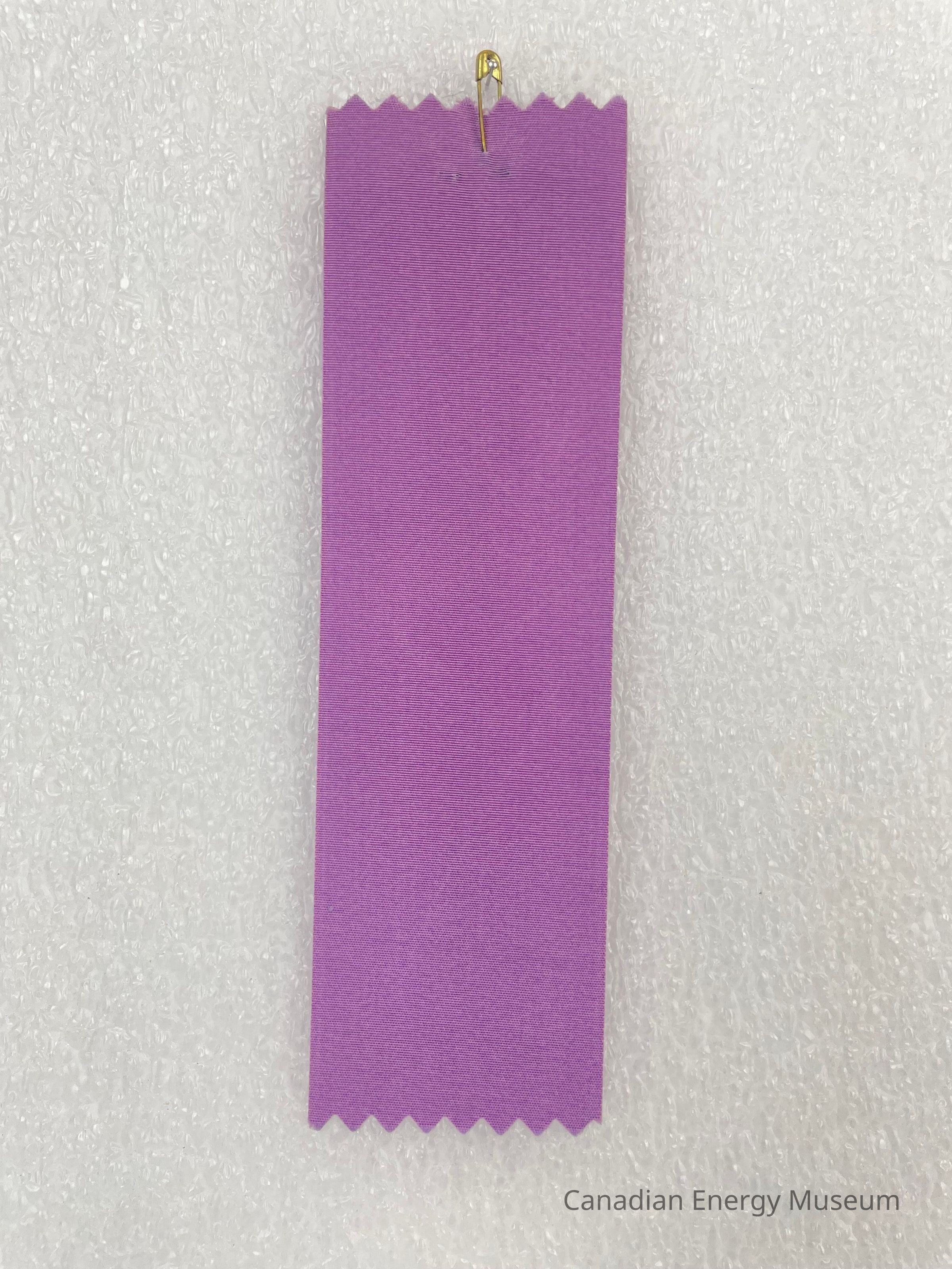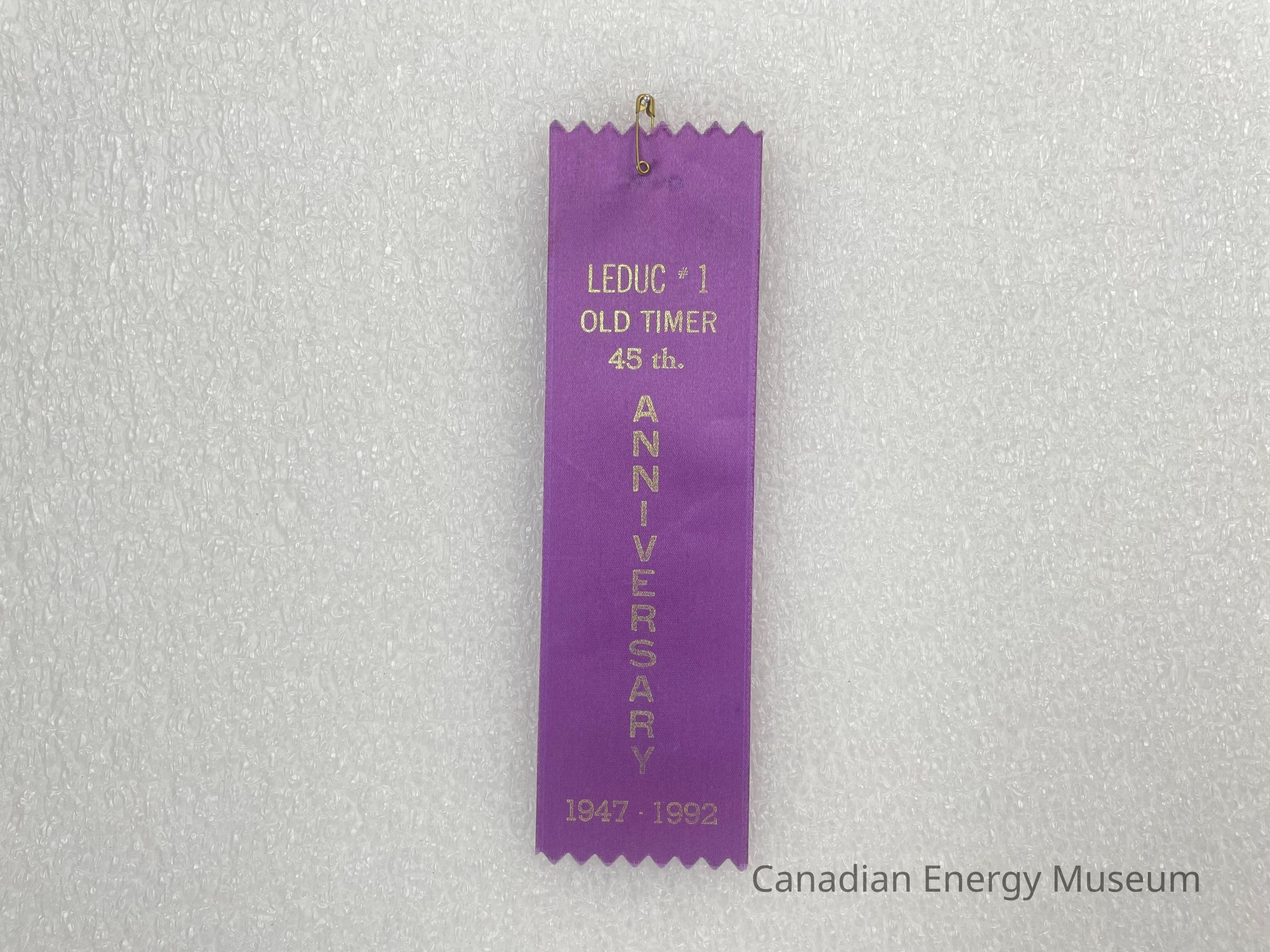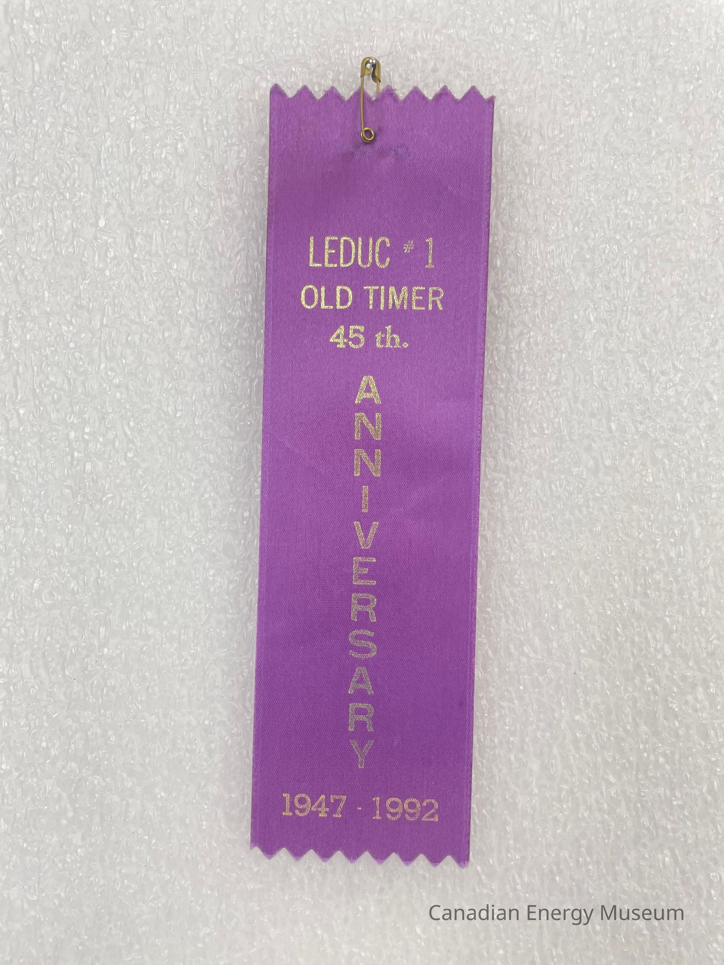 A purple ribbon with a small gold safety pin. The ribbon has a zig-zag cutout at the top and the base. Printed gold text reads, "LEDUC #1 OLD TIMER 45th. ANNIVERSARY 1947-1992". The word "ANNIVERSARY" is placed vertically.Collection
