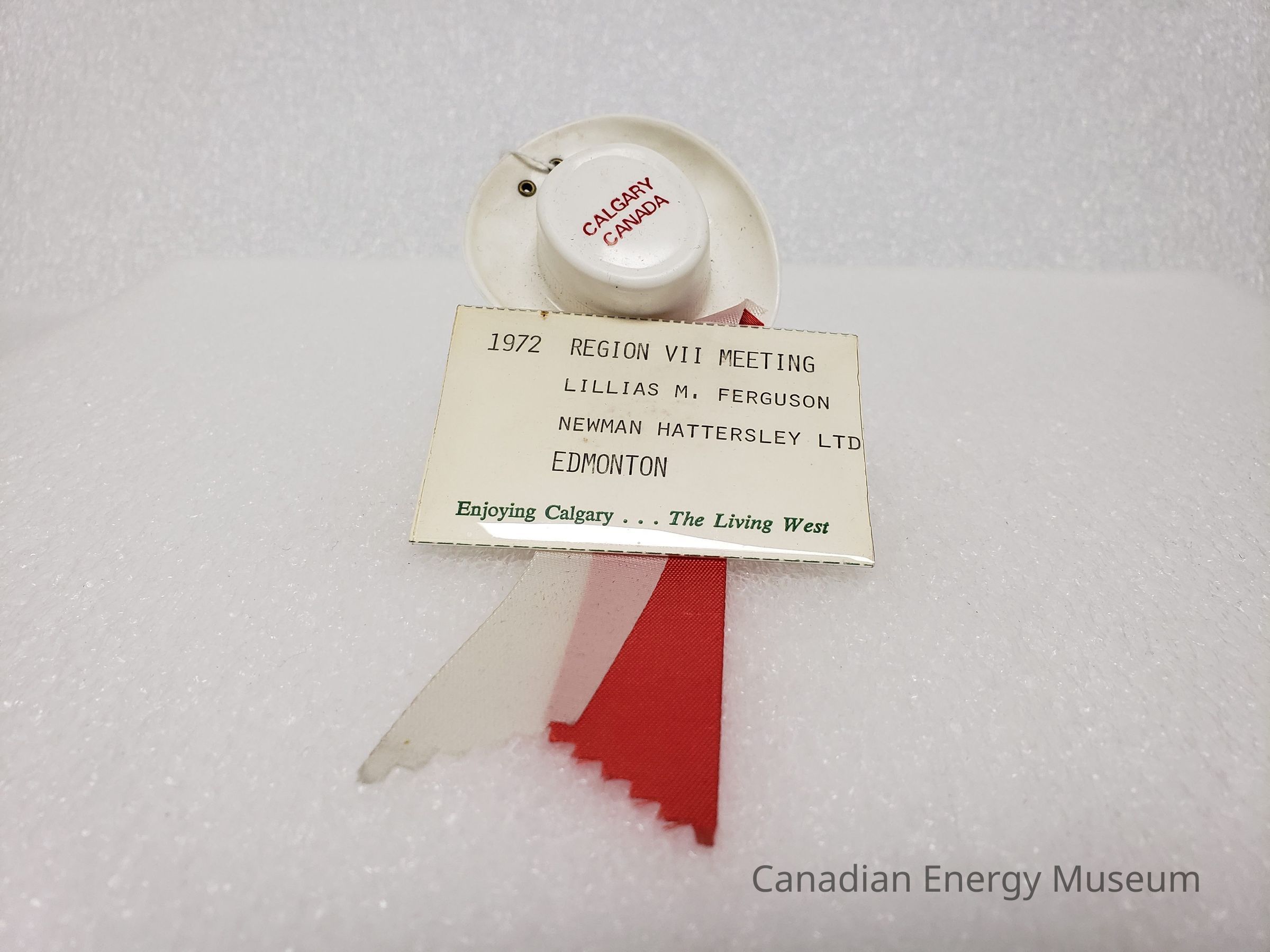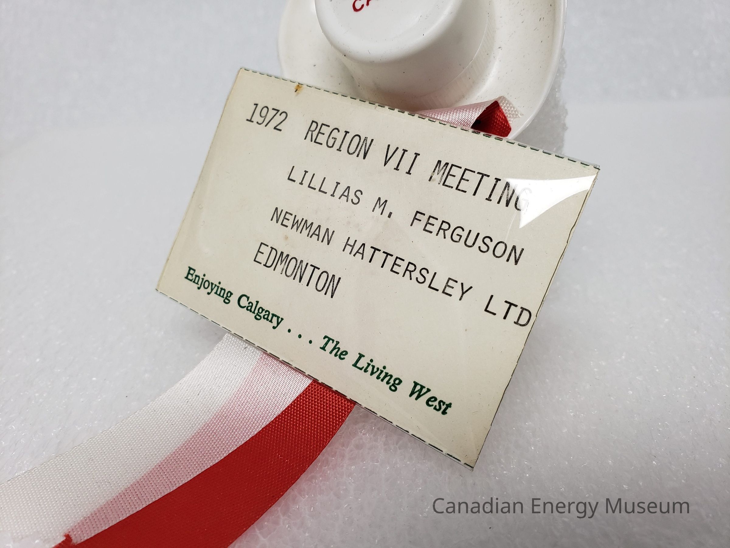 The plastic sleeve is a simple flattened cylinder with open sides. Inside is a slip of paper of the same dimensions, reading "1972 REGION VII MEETING; LILLIAS M. FERGUSON; NEWMAN HATTERSLEY LTD; EDMONTON" in black typewritten text, along with "Enjoy Calgary...The Living West" printed in green serif font along the bottom. Preferation/cut marks are visible in black along the top and bottom edges. The badge is secured to the ribbon with a silver-coloured stamp through the back of the badge plastic and through both ribbons.Collection
