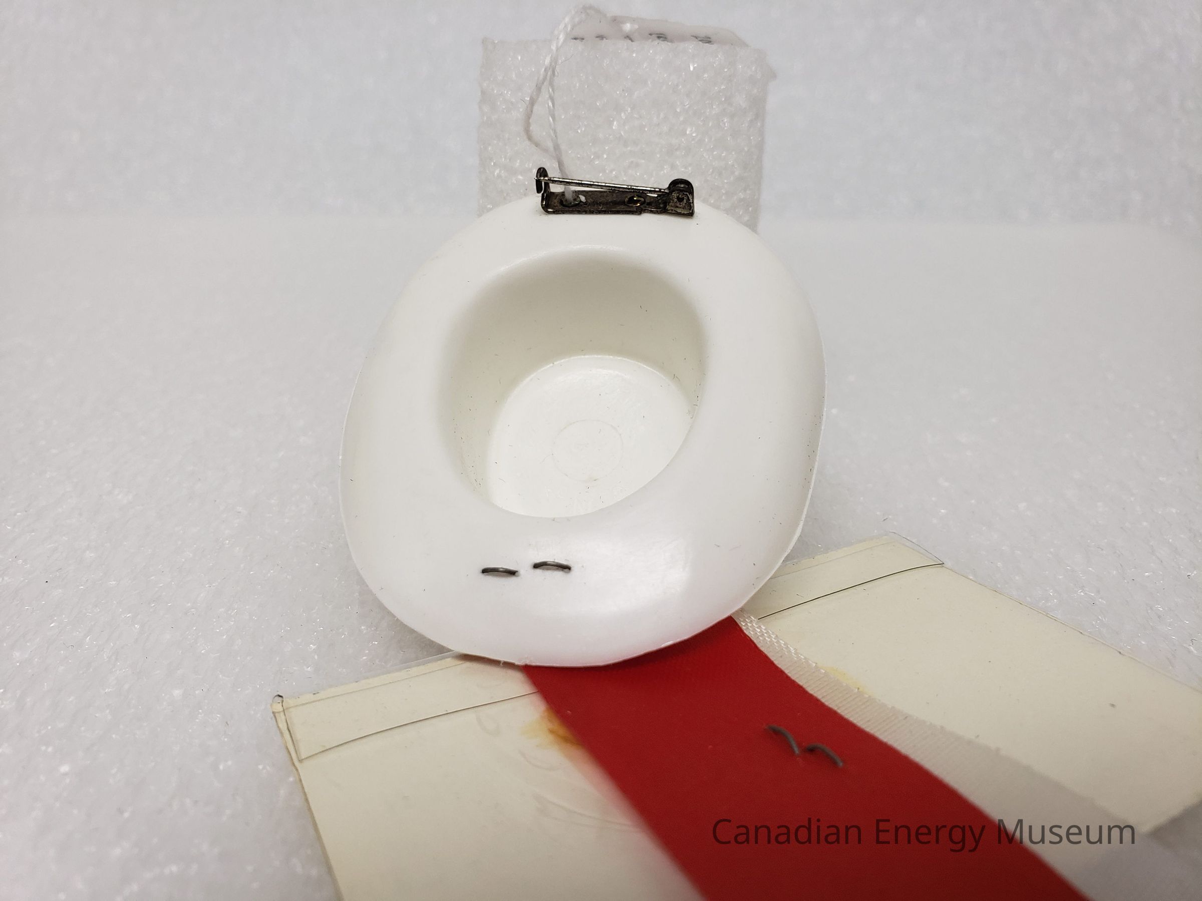 1970s, Textile, Corsage, Red, White, Name Badge, Name Tag, Plastic, Hat, Desk and Derrick Club, Calgary, Edmonton, MetalDescription