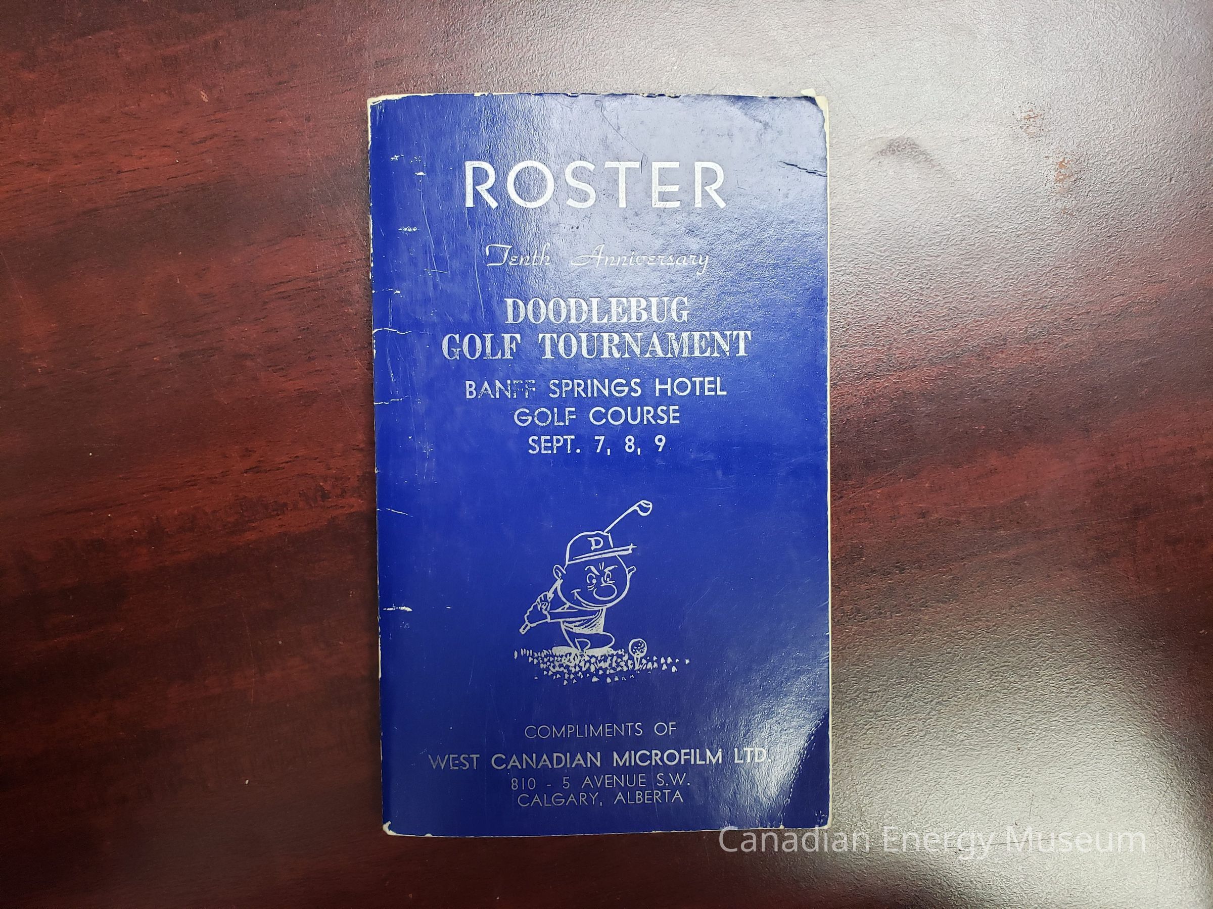 Features: This pocket-sized booklet has a two-staple saddle stitch binding and card cover. The cover has a deep blue background, with silver-grey ink. On the front cover is the following text: "ROSTER [block text]; Tenth Anniversary [script]; DOODLEBUG GOLF TOURNAMENT [serif block]; BANFF SPRINGS HOTEL GOLF COURSE; SEPT. 7, 8, 9 [block]". Centered 3/4 down the cover is an illustration of a caricature man mid-swing of a golf club. Below this along the bottom of the front cover is the text "COMPLIMENTS OF; WEST CANADIAN MICROFILM LTD.; 810 -5 AVENUE S.W.; CALGARY, ALBERTA". Centered on the back cover is the text "THIS ROSTER DESIGN AND PRINTING BY WEST CANADIAN GRAPHIC INDUSTRIES; A DIVISION OF WEST CANADIAN MICROFILM LTD.".