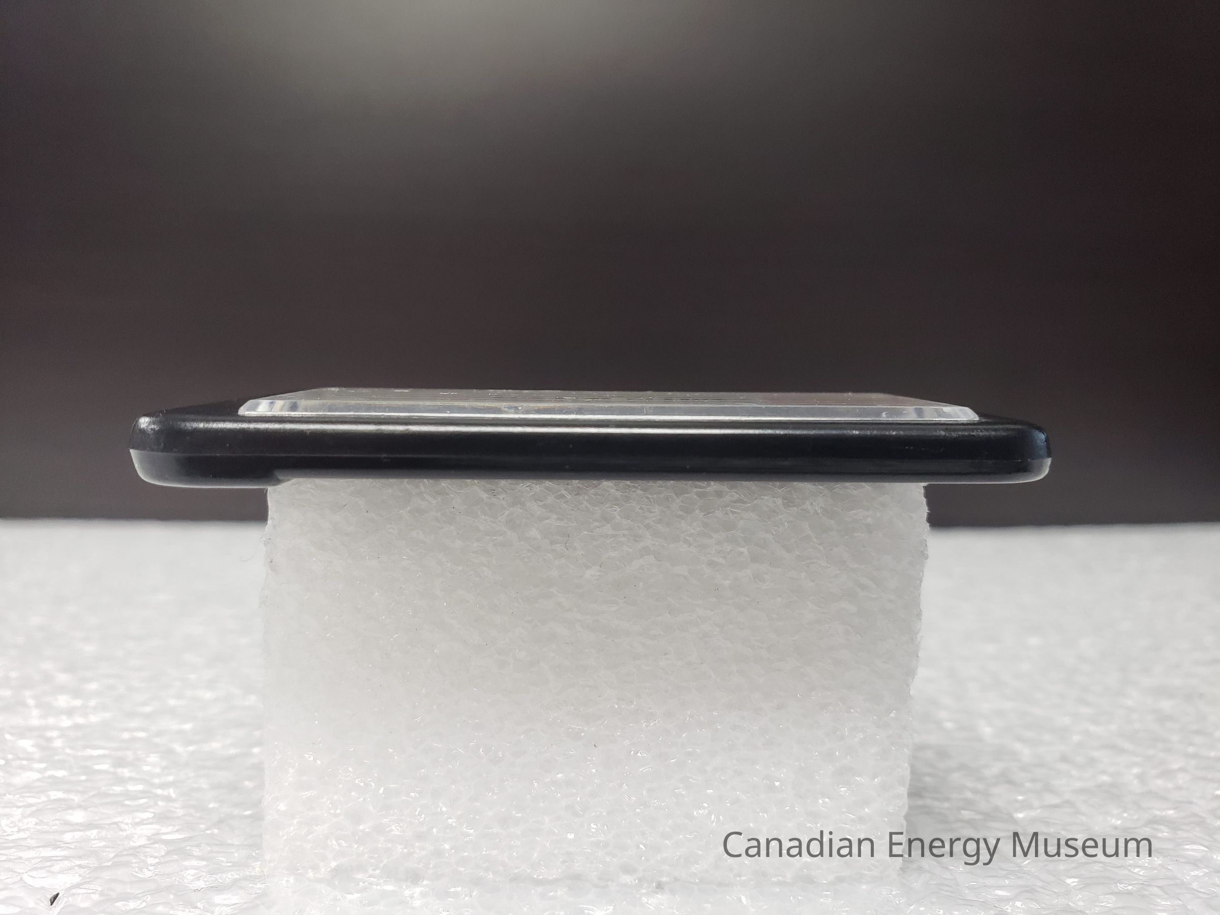 The center of the rectangle has an insert with a raised piece of clear plastic, that slants up before flattening out. The plastic was placed onto of the logo this cutter was made for.