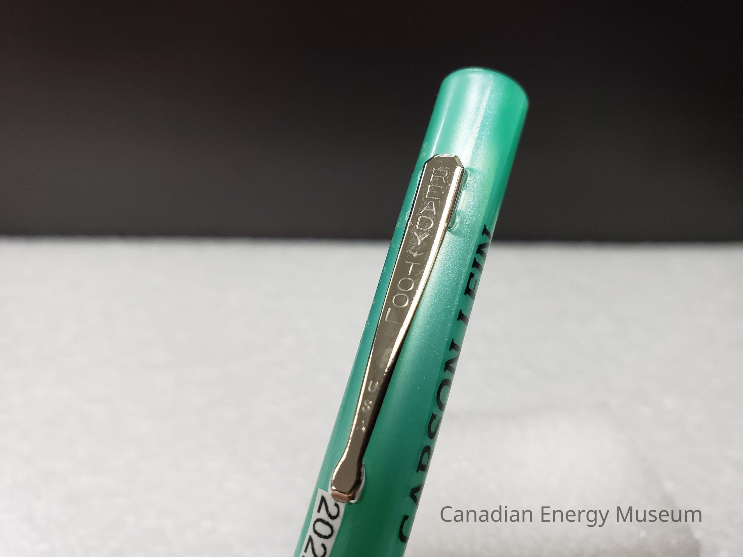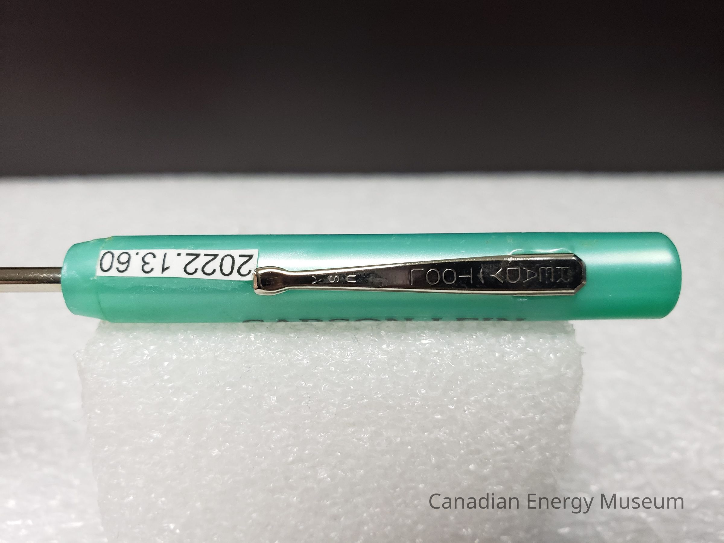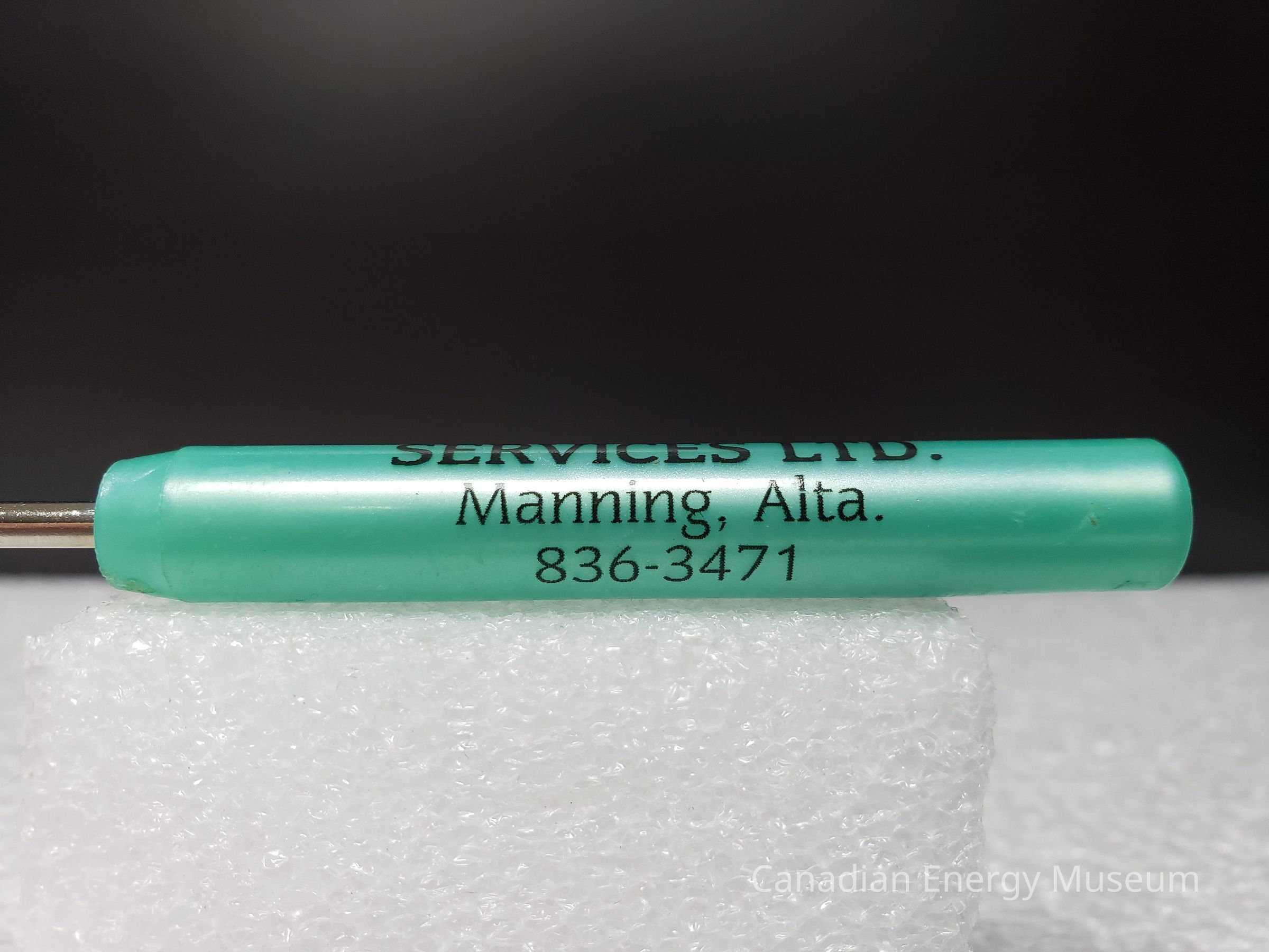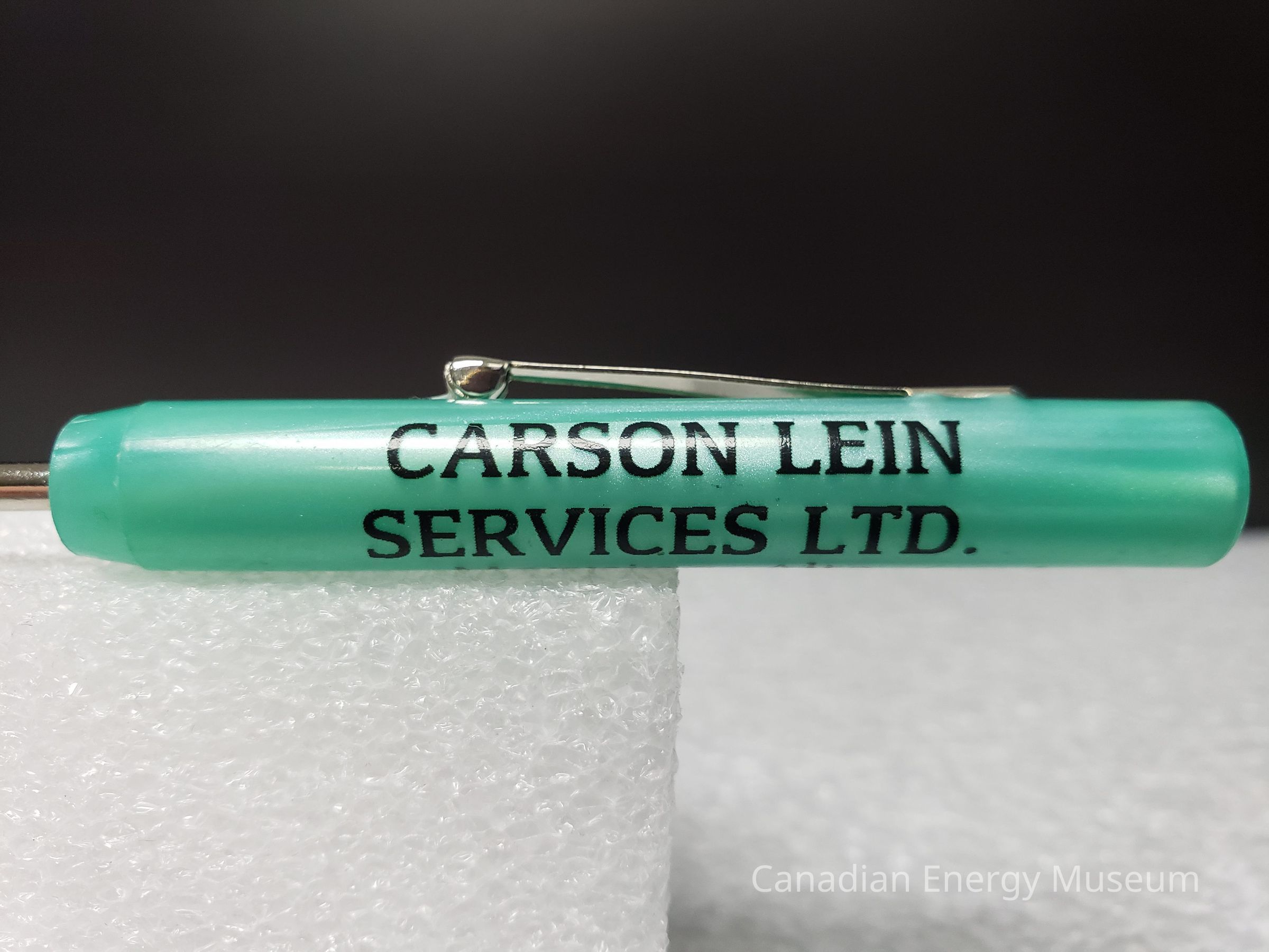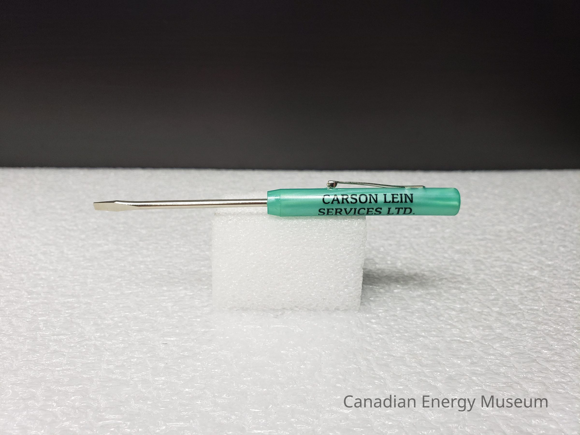 Object is a pearlscent mint green handle the is a thin cylinder which tapers into a cone with a flat top. From this cone the flat head screwdriver is attached. The handle has a metal belt clip attached opposite of the logo.Logo Text says "Carson Lein Services LTD Manning ALTA. 836-3471"