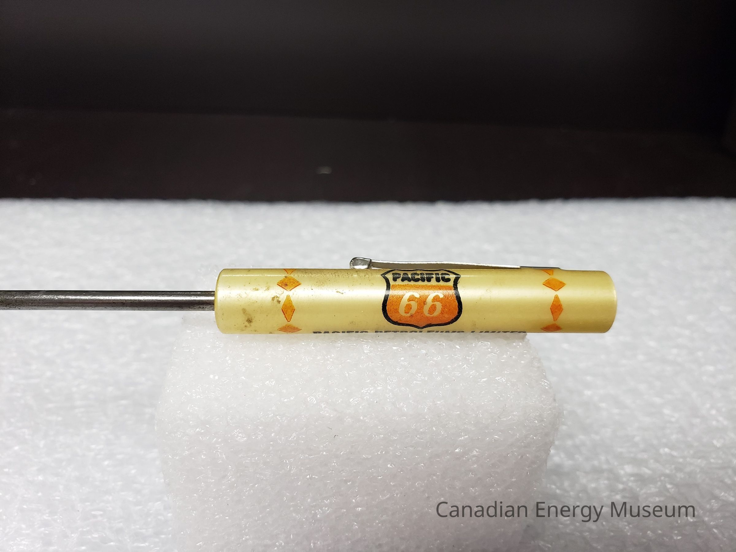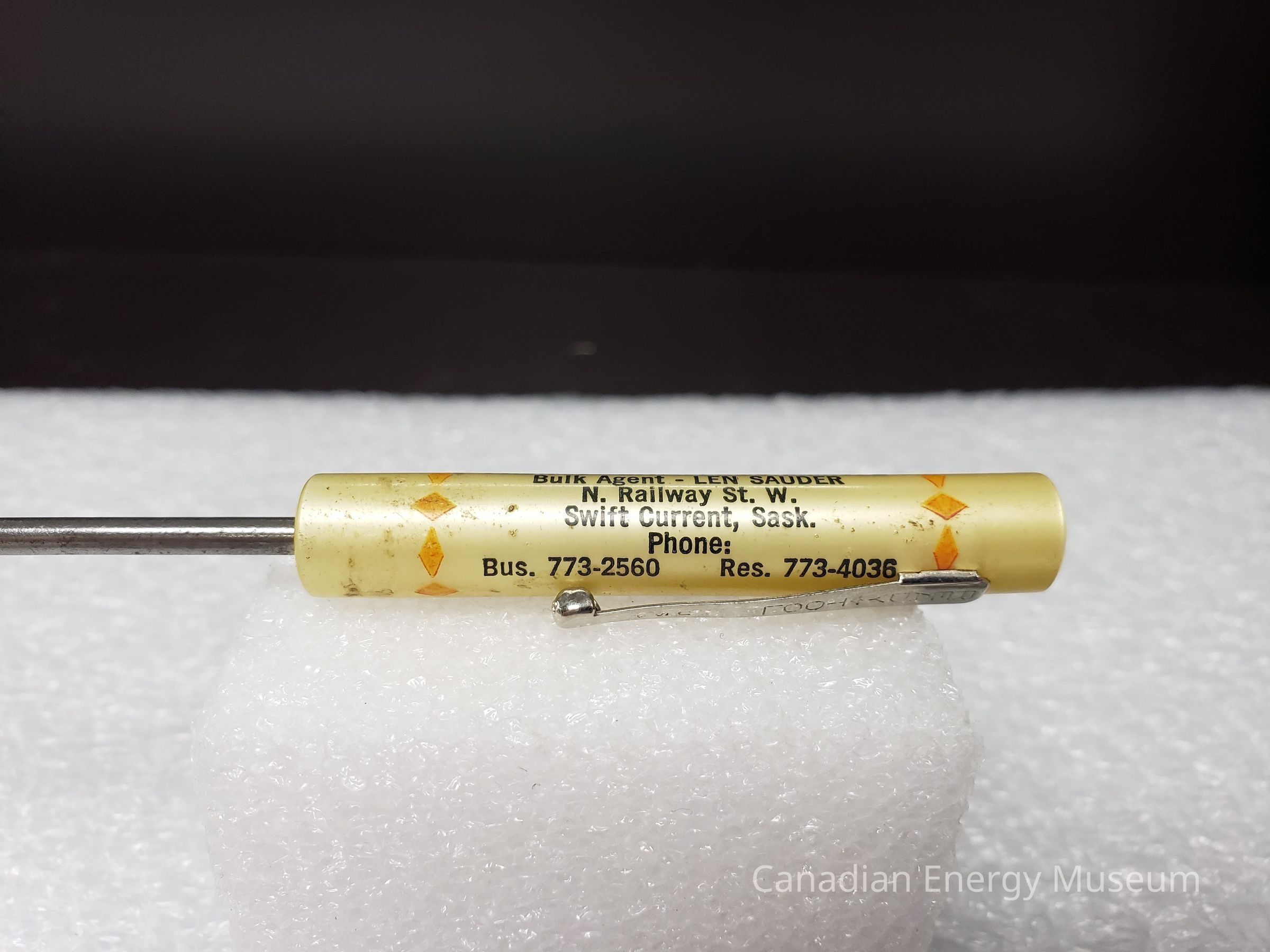 Features: A small flathead screwdriver, with a pale yellow plastic handle. Printed on the handle is an interstate highway shield with a black border and red-orange fill. Inside is printed "PACIFIC 66" in white. beneath in black text is "PACIFIC PETROLEUM LIMITED; Bulk Agent - LEN SAUDER; N. Railway St. W.; Swift Current, Sask.; Phone:; Bus. 773-2560 Res. 773-4036". On either side of this content is a ring of design made of alternating red-orange diamonds. On the handle is attached a metal clip similar to that found on pens. Engraved on the clip is "READY TOOL; USA".Collection