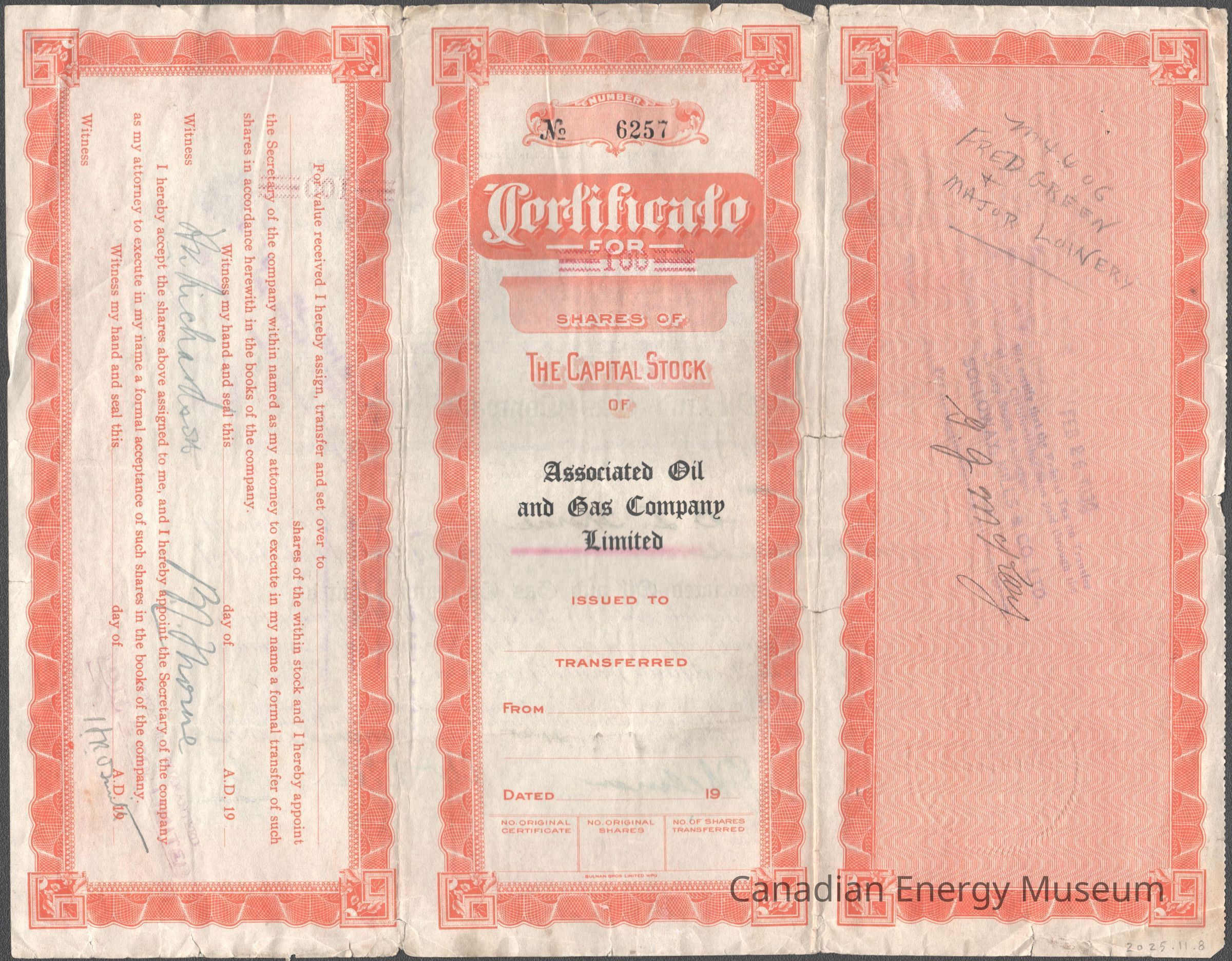 Share Certificate, Orange, Associated Oil & Gas Company Ltd., Certificate, 1920sDescription