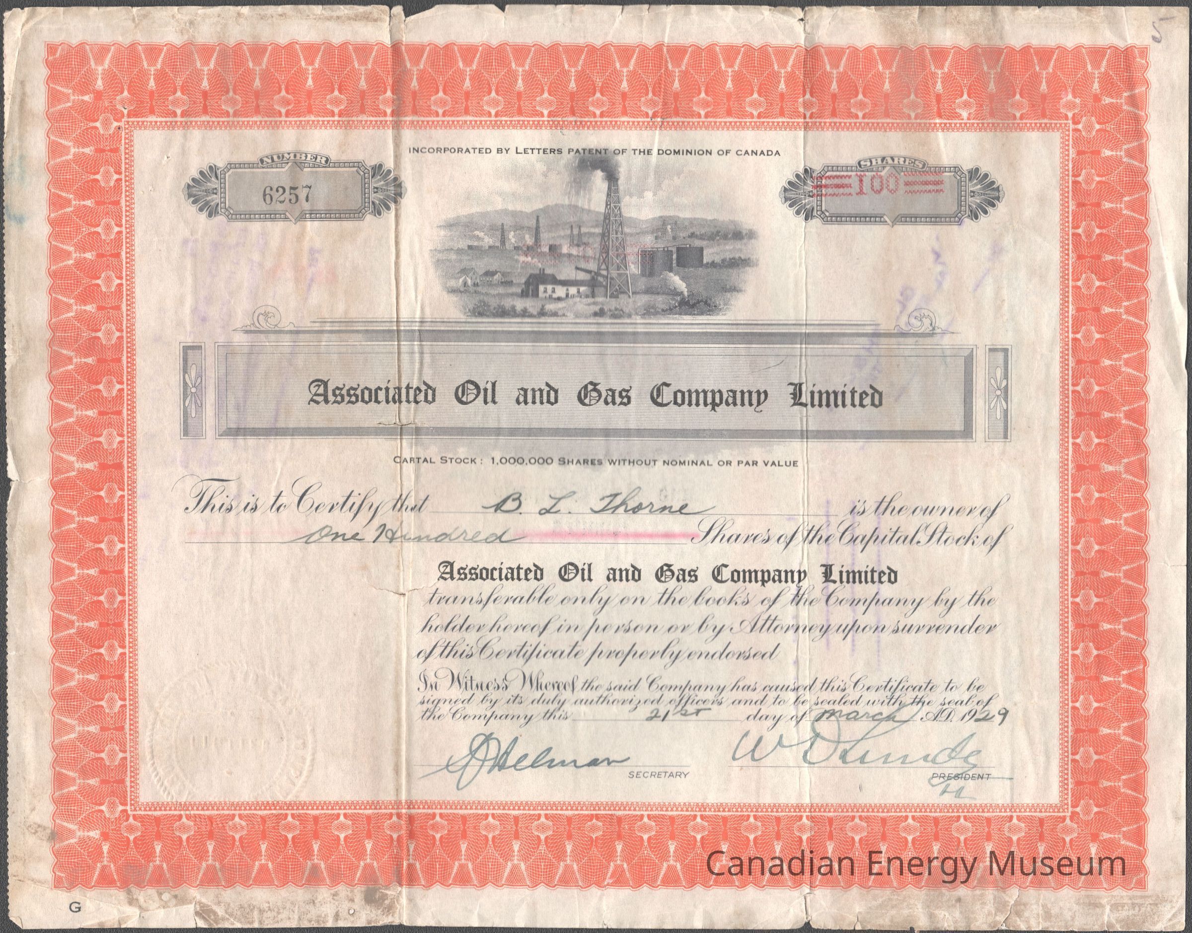 A share certificate made out to B. L. Thorne for one hundred shares. The certificate is decorated with a thick orange border. The top centre of the certificate displays a black and grey illustration of a hillside with multiple oil rigs scattered in the distance. The bottom left corner of the certificate displays blank space with a circular embossment.