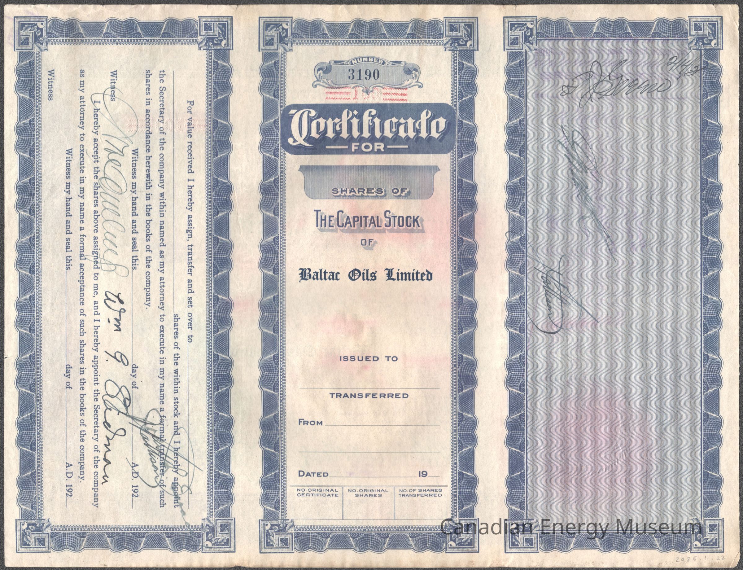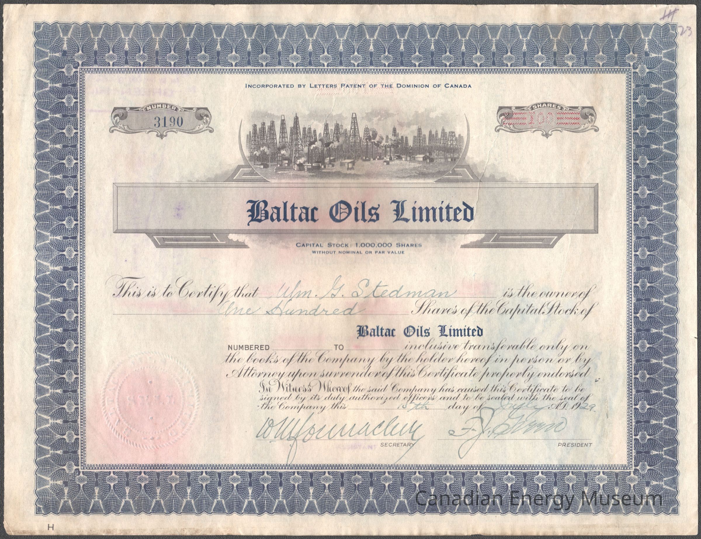 [Share Certificate] Baltac Oils Limited, 100 Shares, 15 July, 1929Entry/Object ID