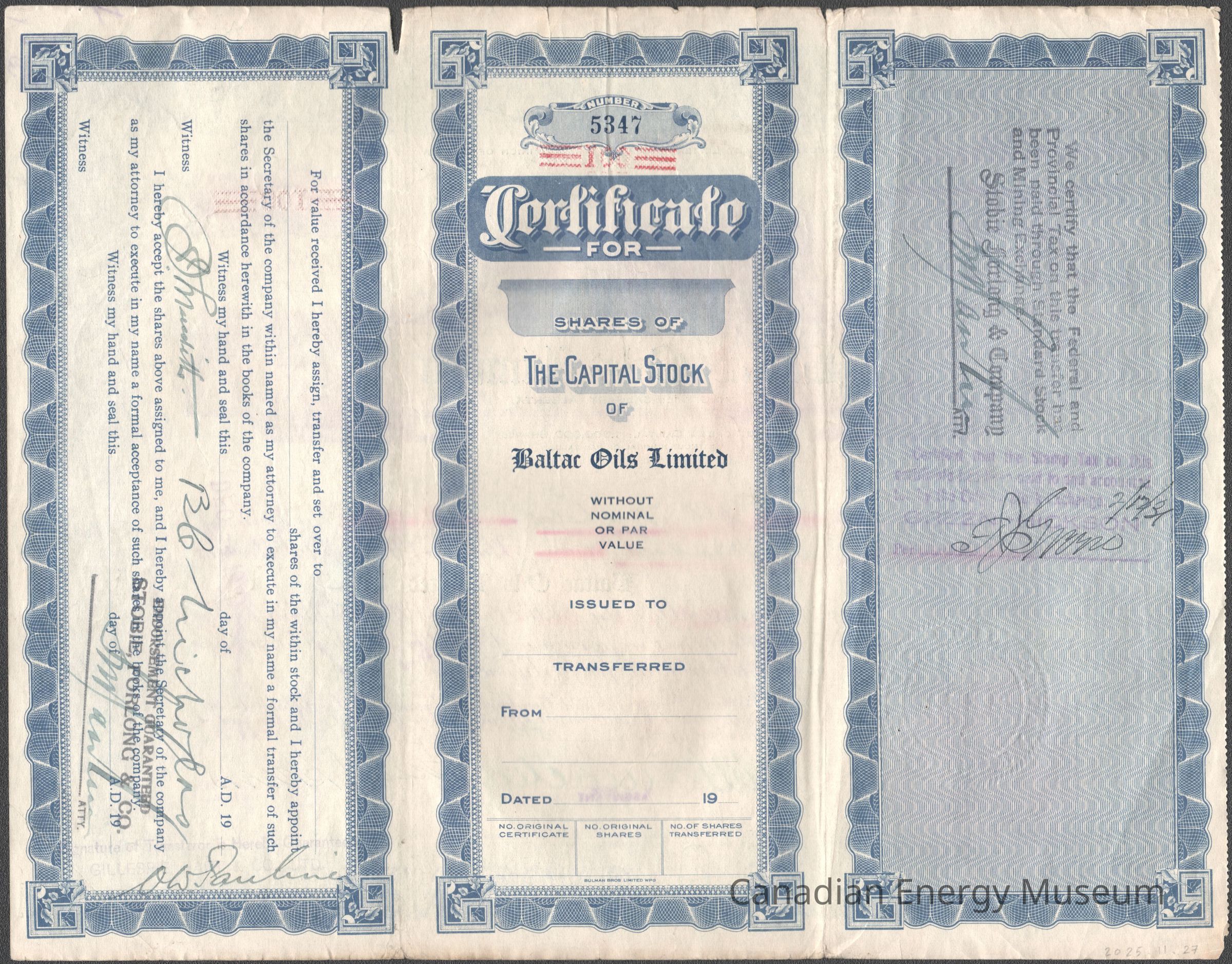 Share Certificate, Certificate, 1920s, Blue, Baltac Oils Limited, OilDescription
