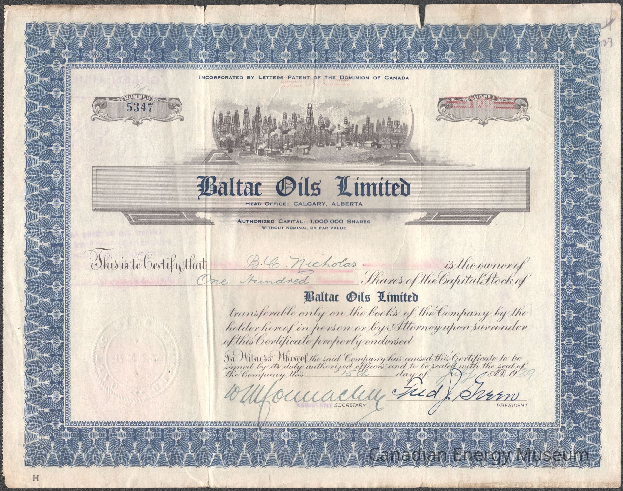 [Share Certificate] Baltac Oils Limited, 100 Shares, 15 July, 1929Entry/Object ID