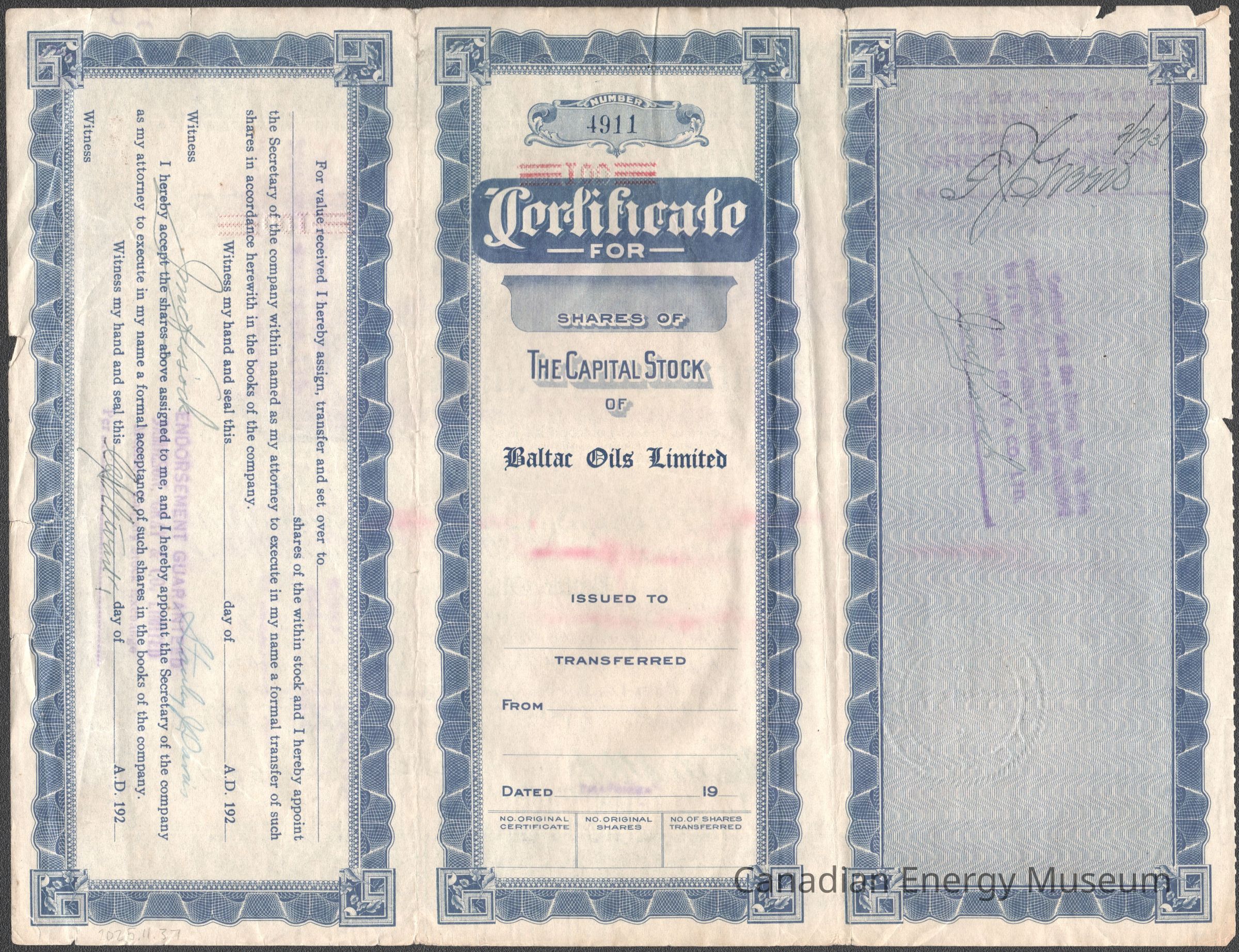 Share Certificate, Certificate, 1920s, Blue, Baltac Oils Limited, OilDescription