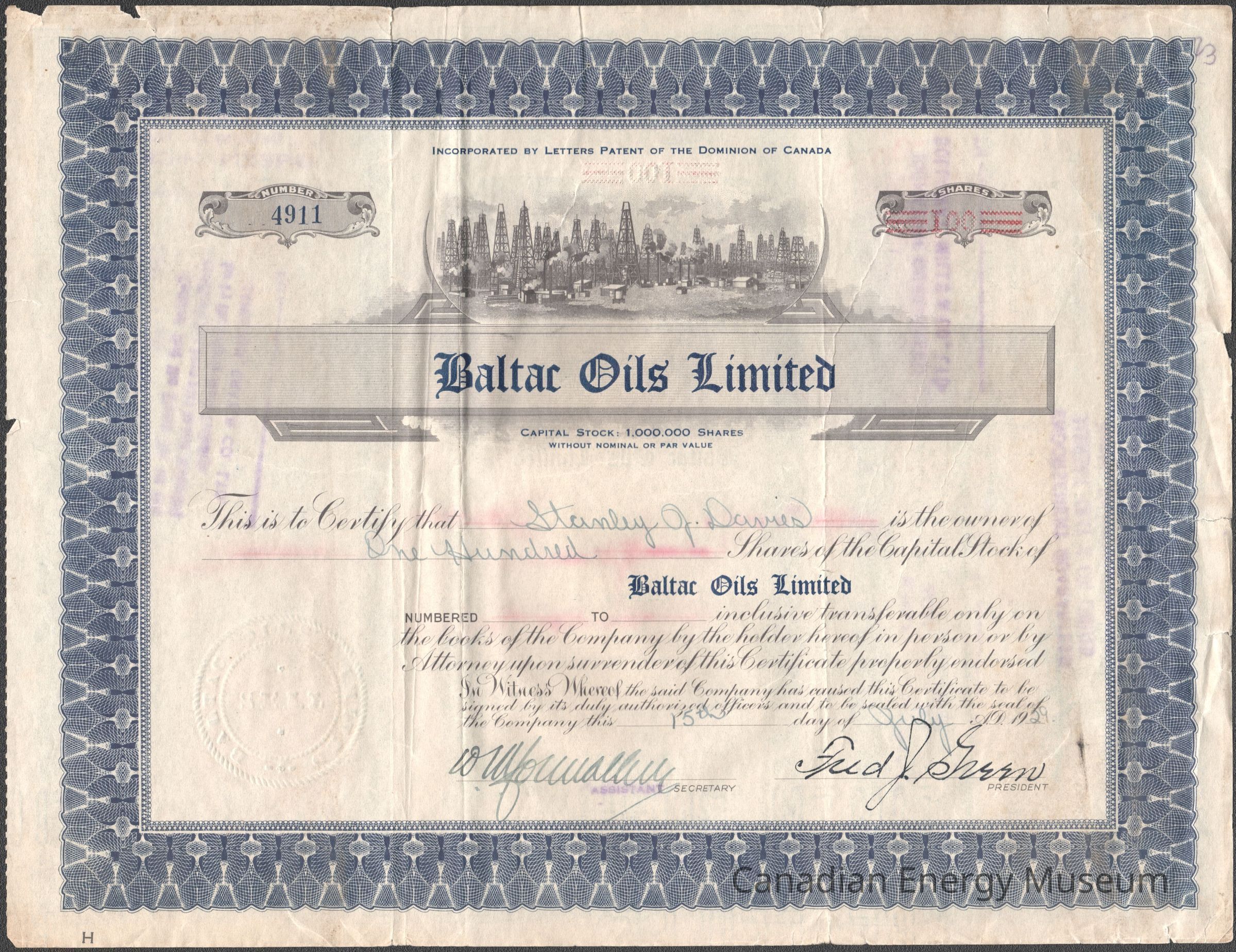 [Share Certificate] Baltac Oils Limited, 100 Shares, 15 July, 1929Entry/Object ID