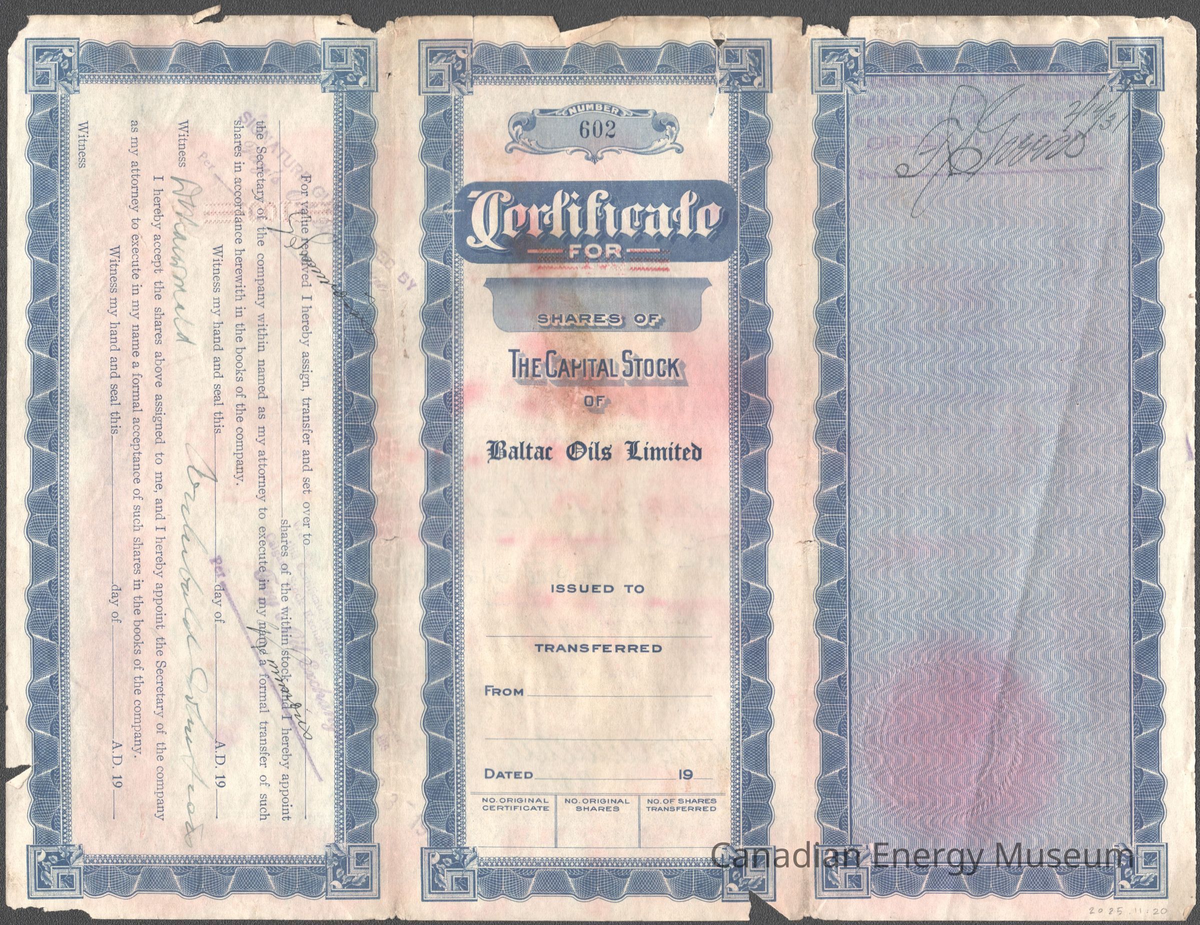 Share Certificate, Certificate, 1920s, Blue, Baltac Oils Limited, OilDescription