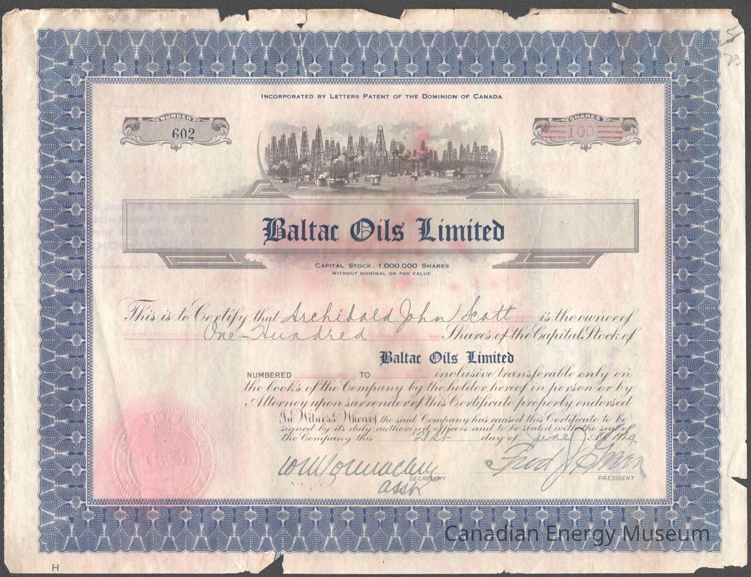 [Share Certificate] Baltac Oils Limited, 100 Shares, 21 June, 1929Entry/Object ID